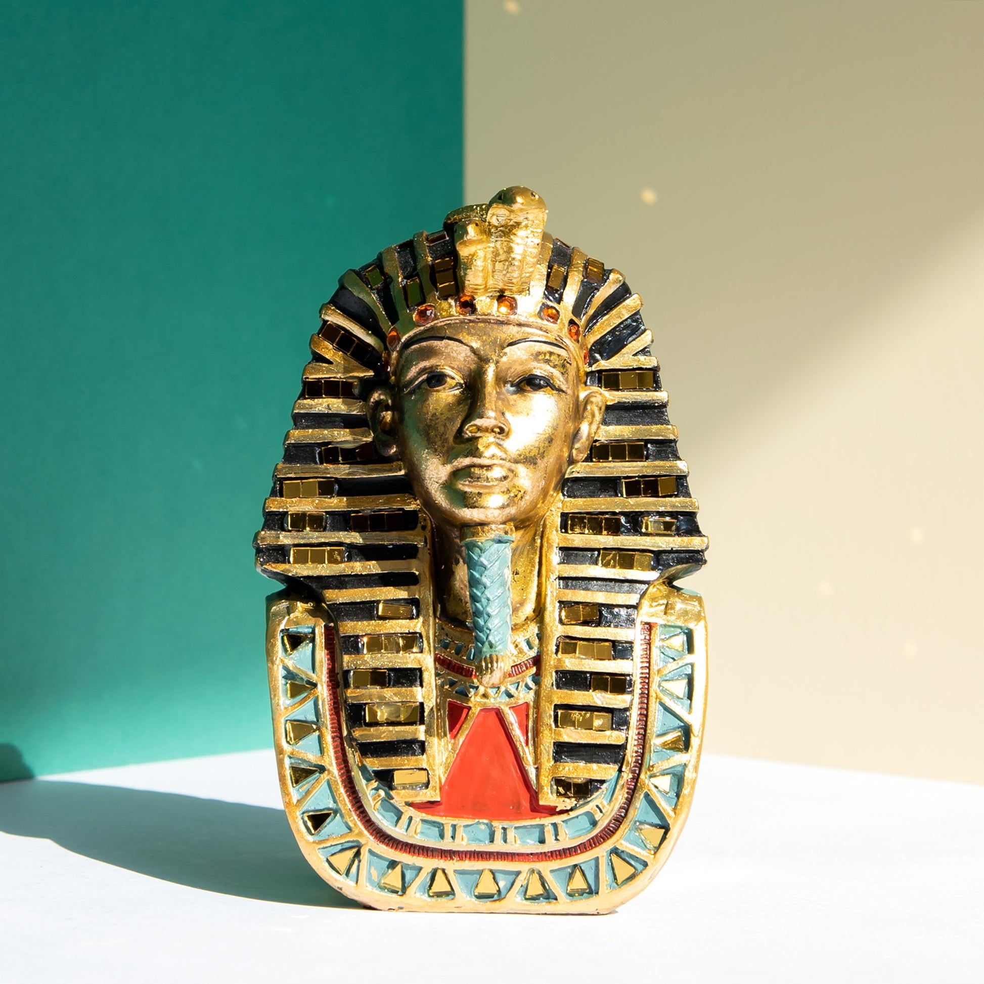 Gold coloured Tutankhamun made from strong, durable resin. Brightly coloured and decorated with small gold mirrored tiles and plastic gems. Egyptian hieroglyphs are carved on the back and snakes rest on the head.