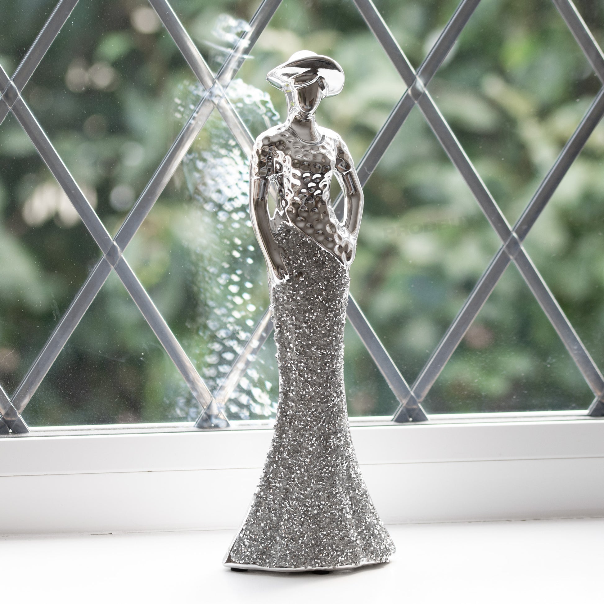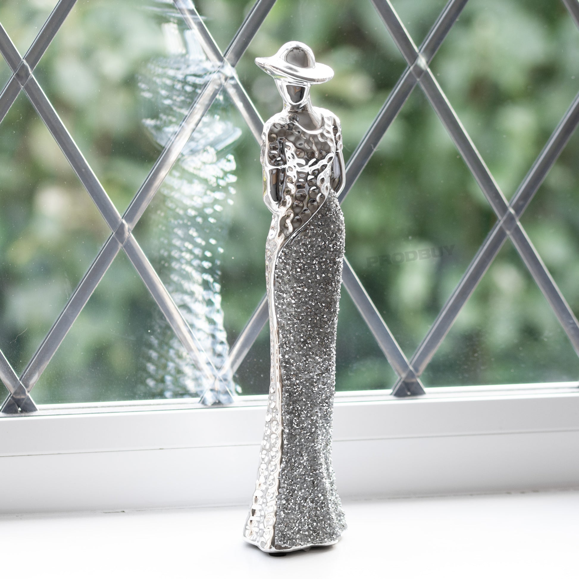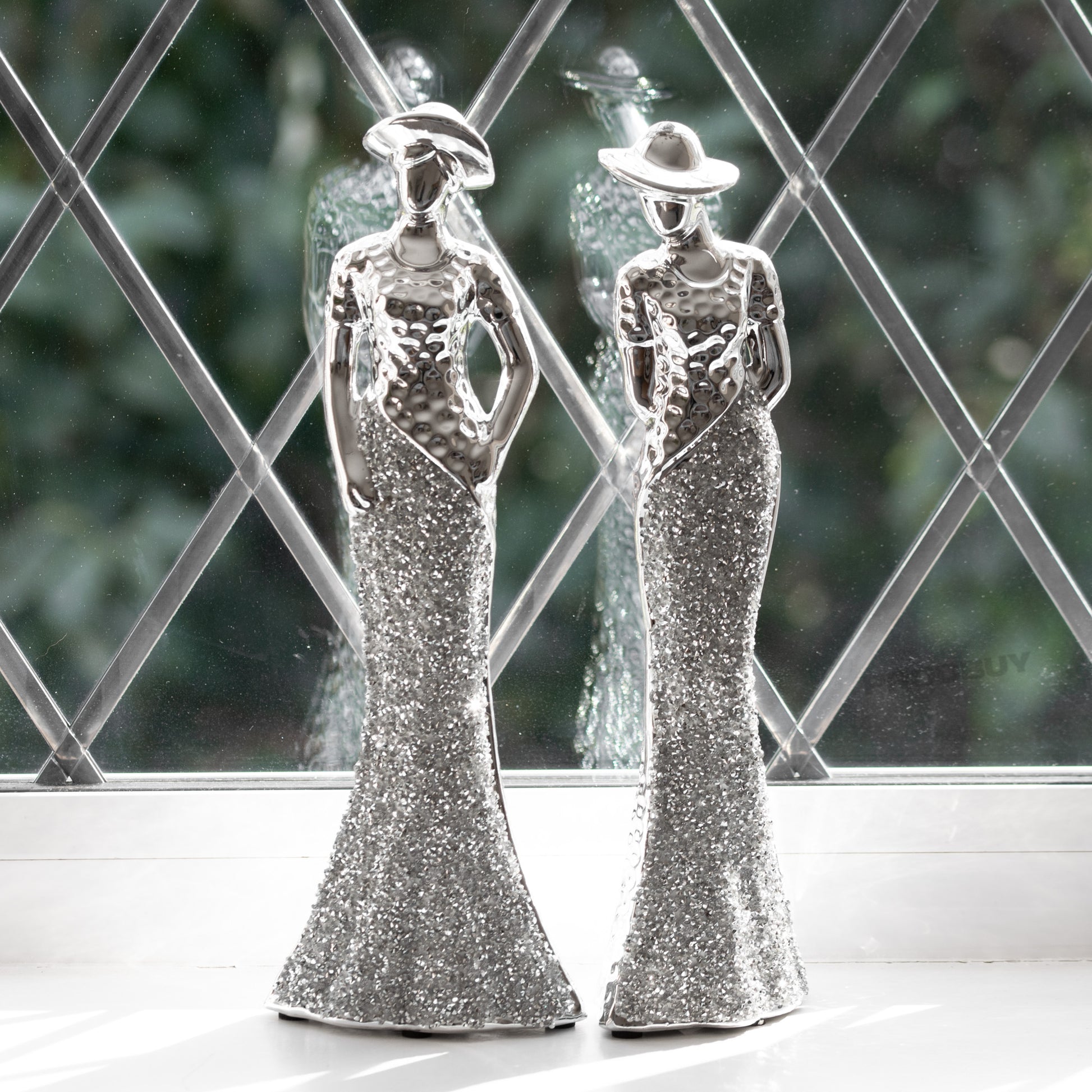 Pair of free-standing sparkly lady ornaments. Made from ceramic with a reflective silver coloured finish that features faux diamanté jewels. Glamorous decorations for the home. Perfect for living rooms, mantelpieces and shelving units. The set includes one of each design pictured.