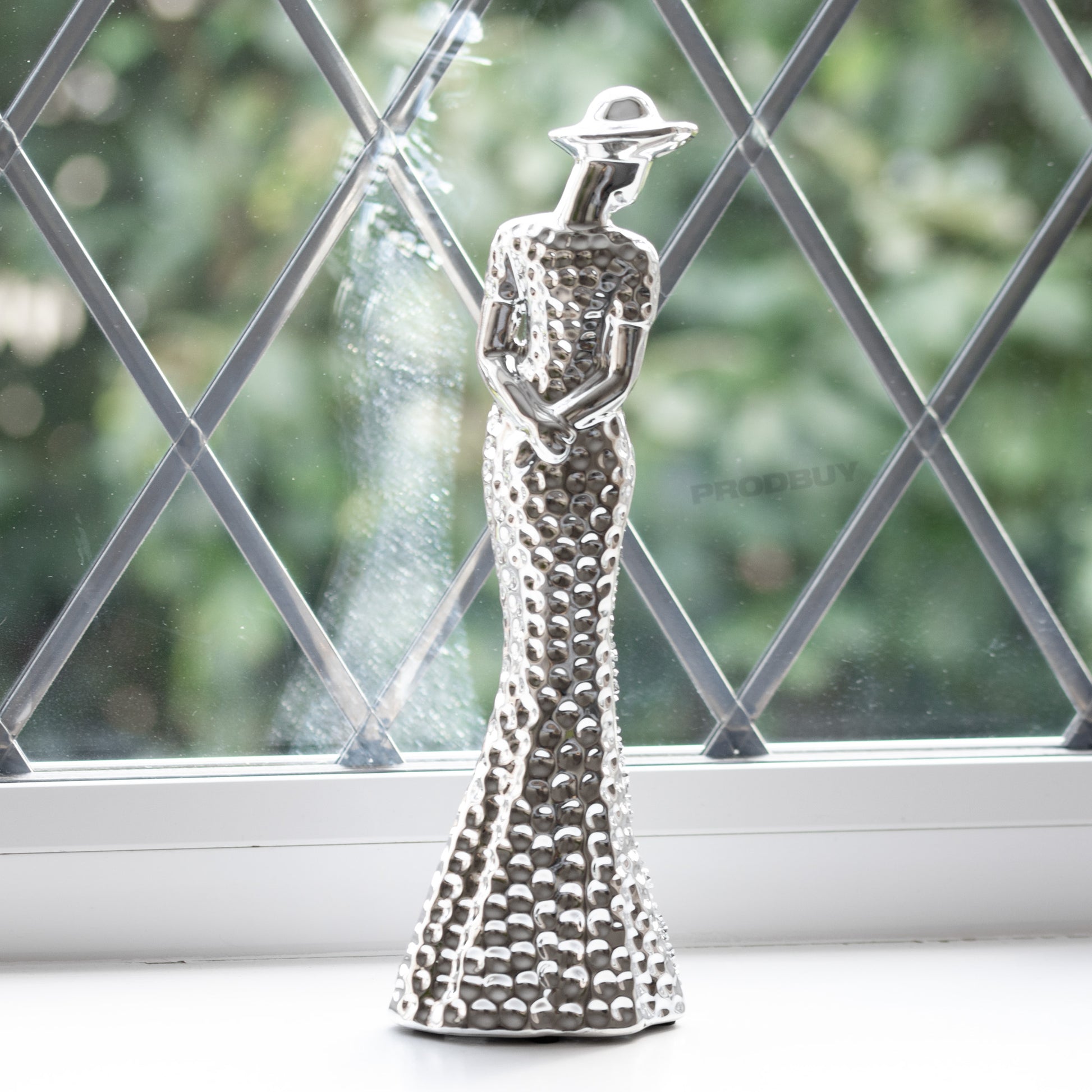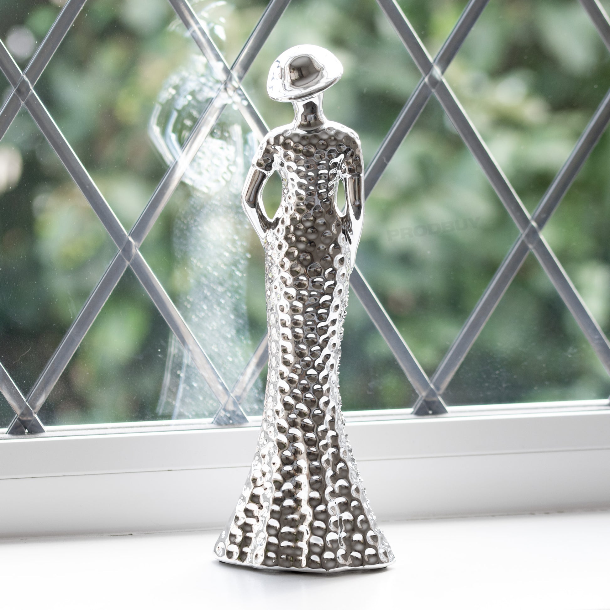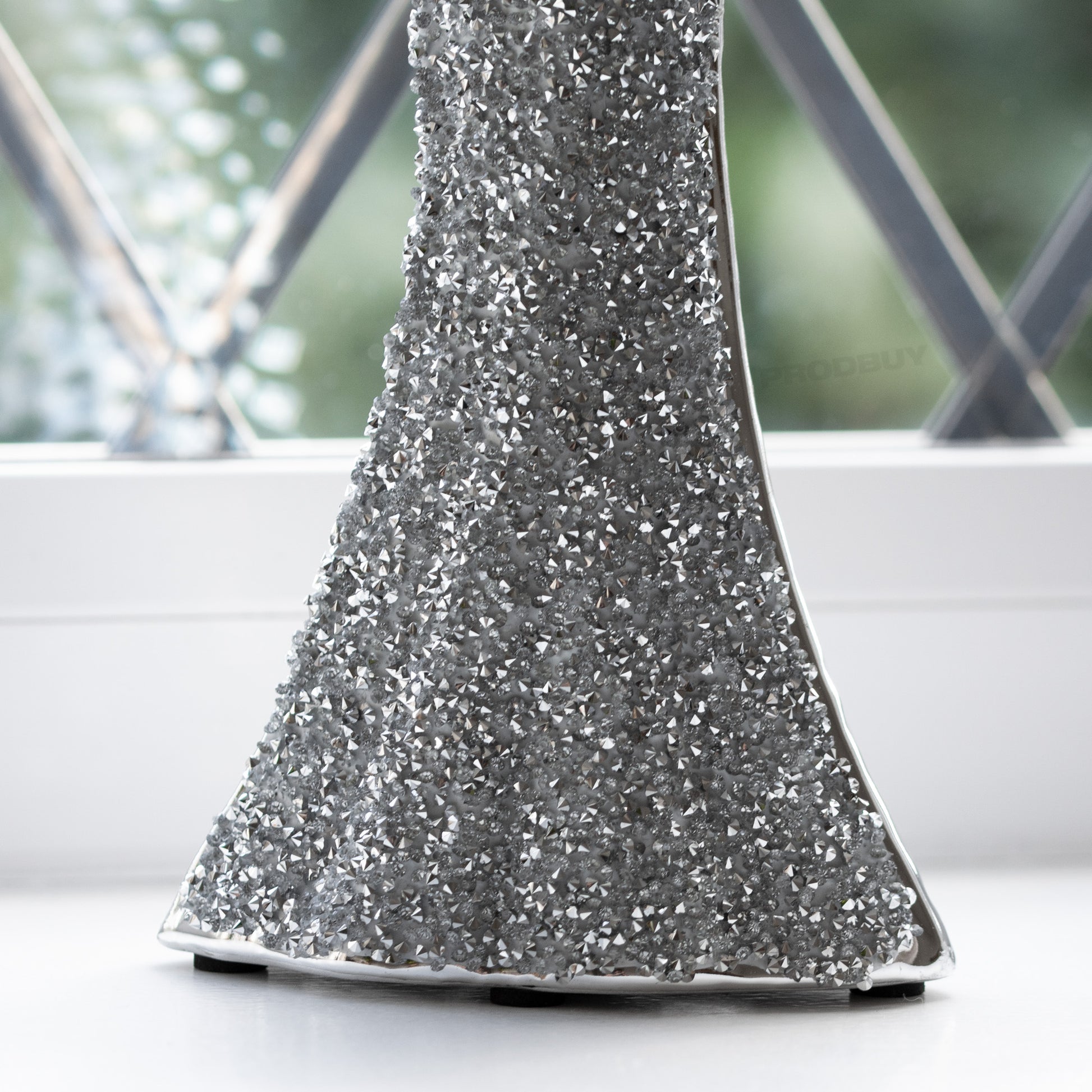 Pair of free-standing sparkly lady ornaments. Made from ceramic with a reflective silver coloured finish that features faux diamanté jewels. Glamorous decorations for the home. Perfect for living rooms, mantelpieces and shelving units. The set includes one of each design pictured.
