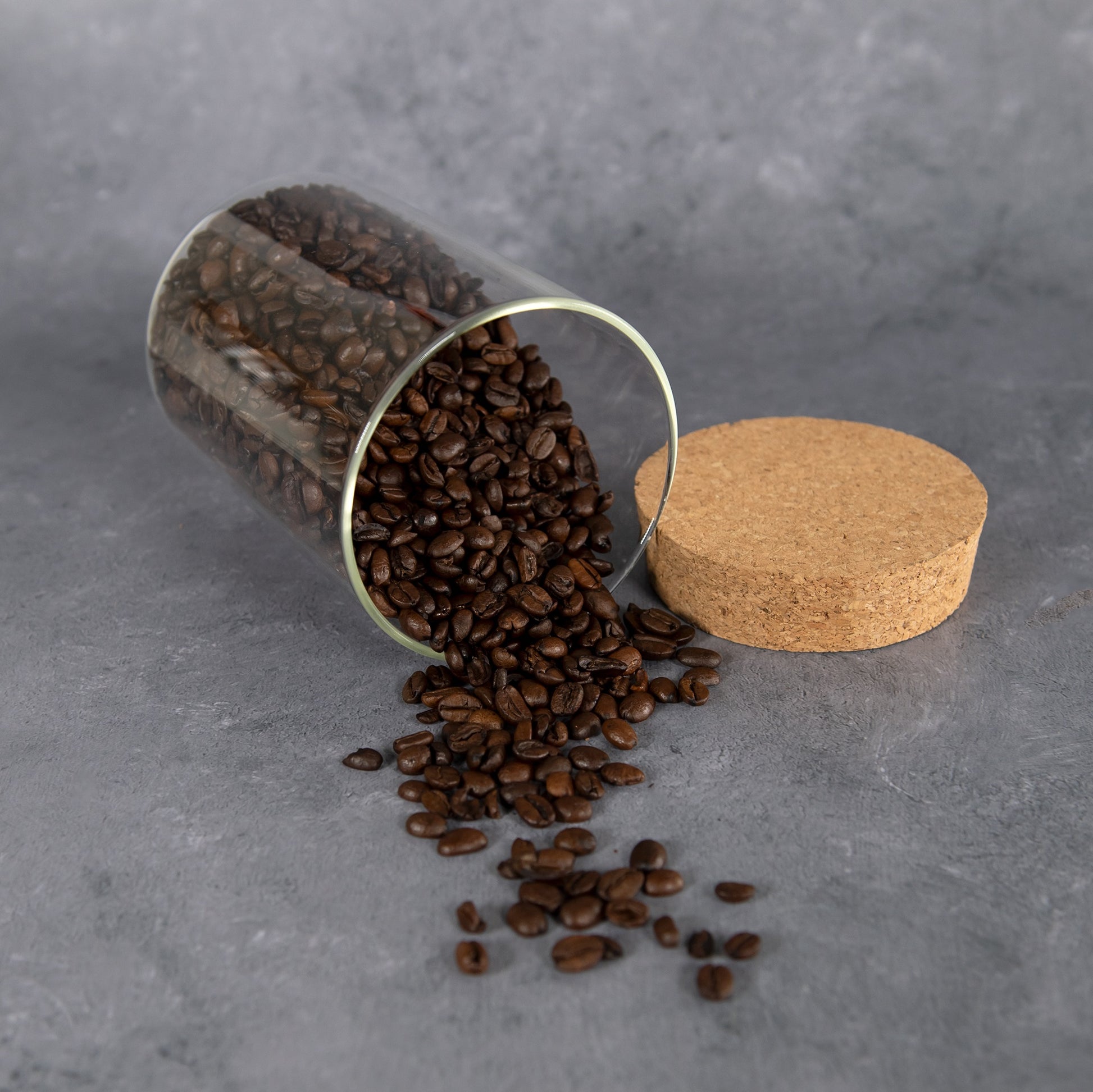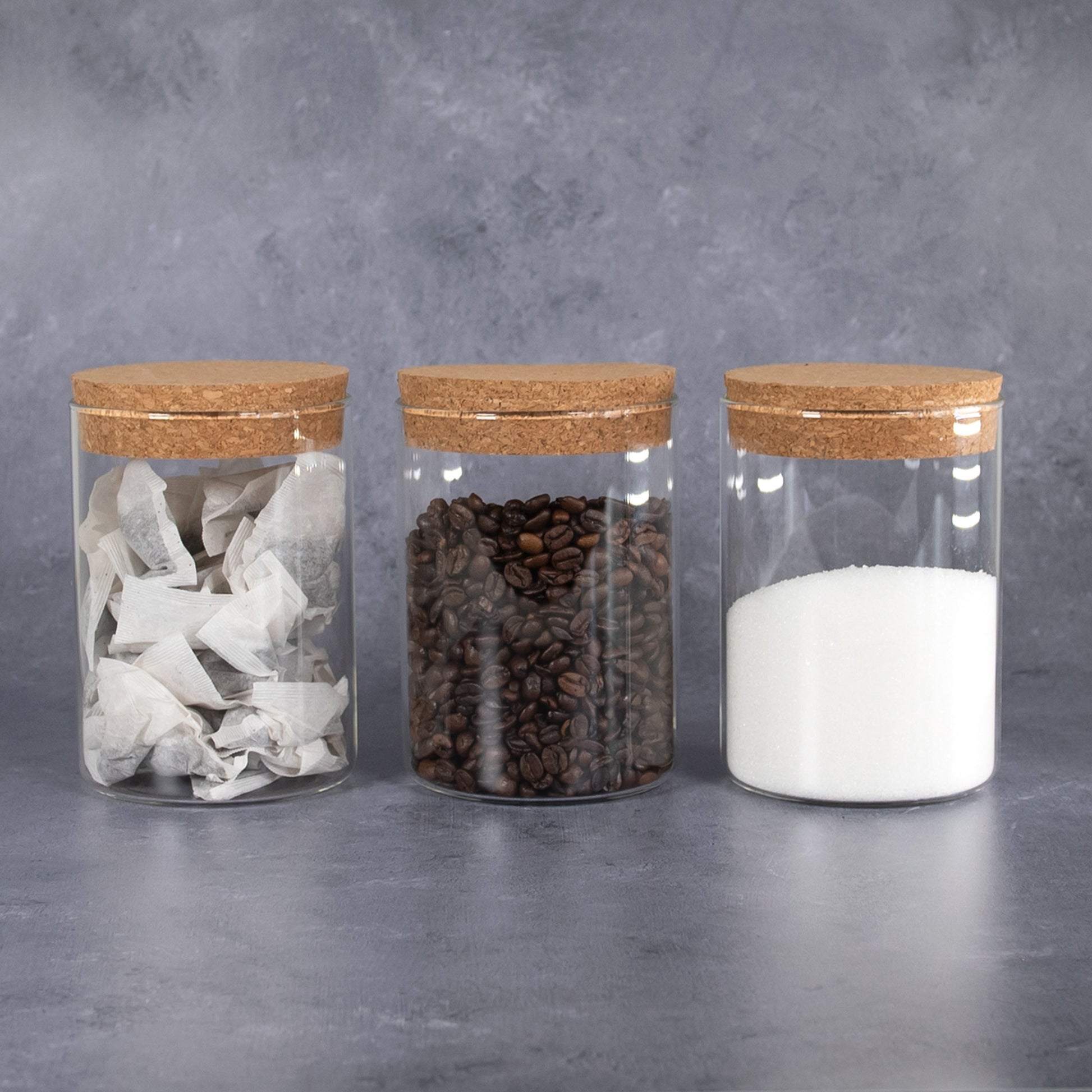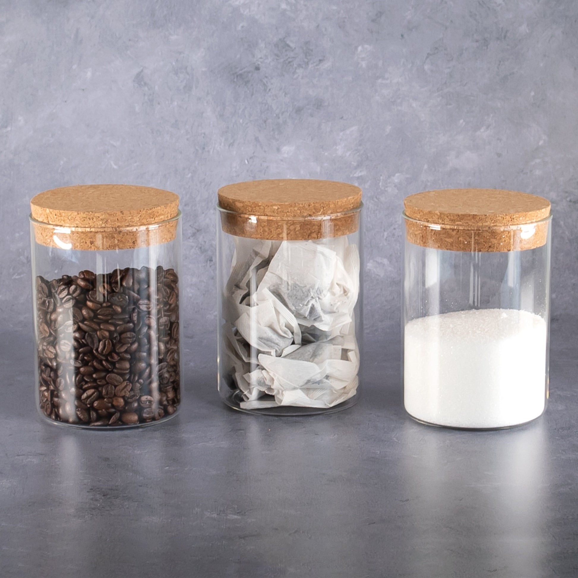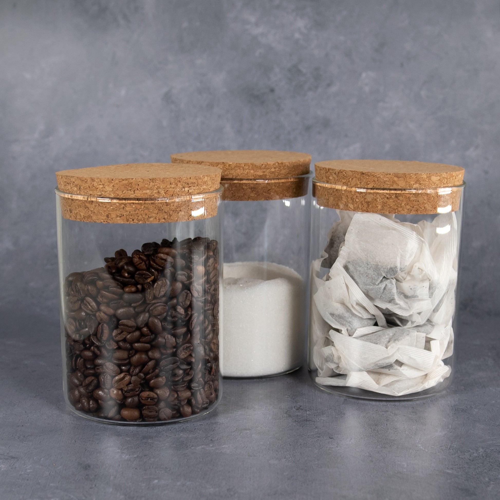 Set of three glass storage jars, each with a measured capacity of seven hundred millilitres. Suitable for dry food storage around the kitchen. Ideal for storing tea, coffee and sugar on kitchen worktops. Tight fitting cork lids keep the contents fresh.