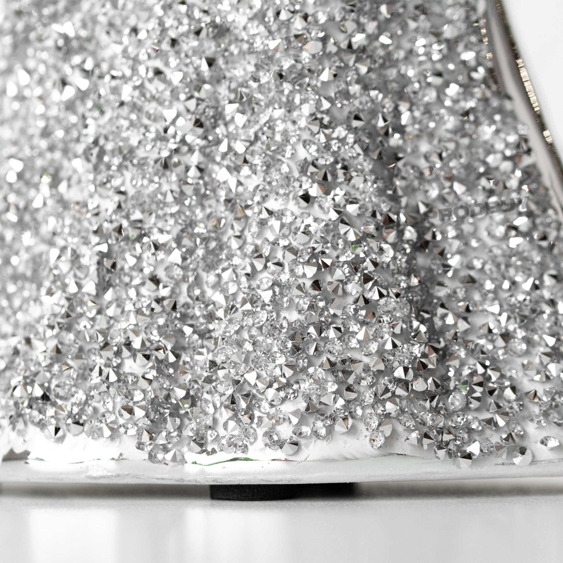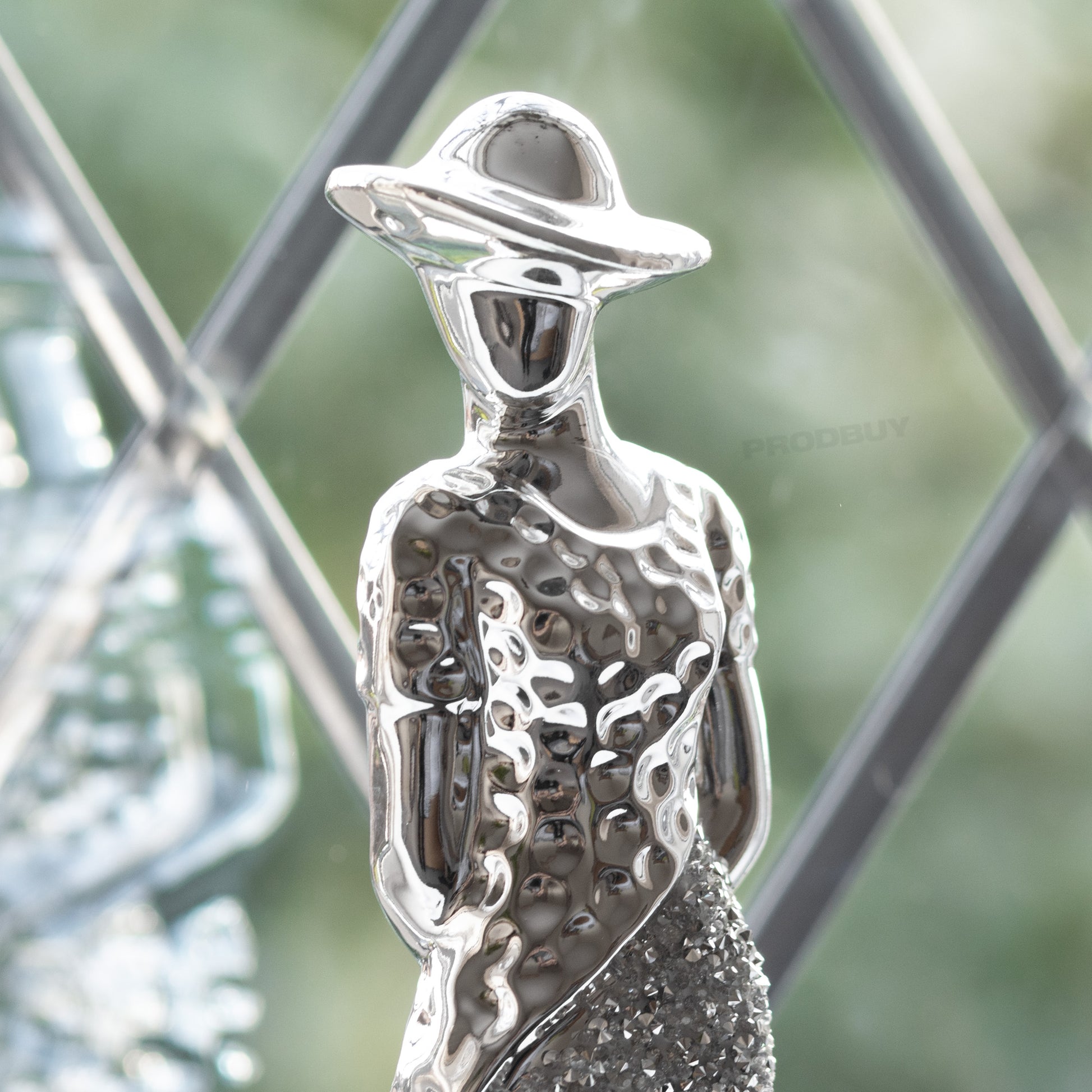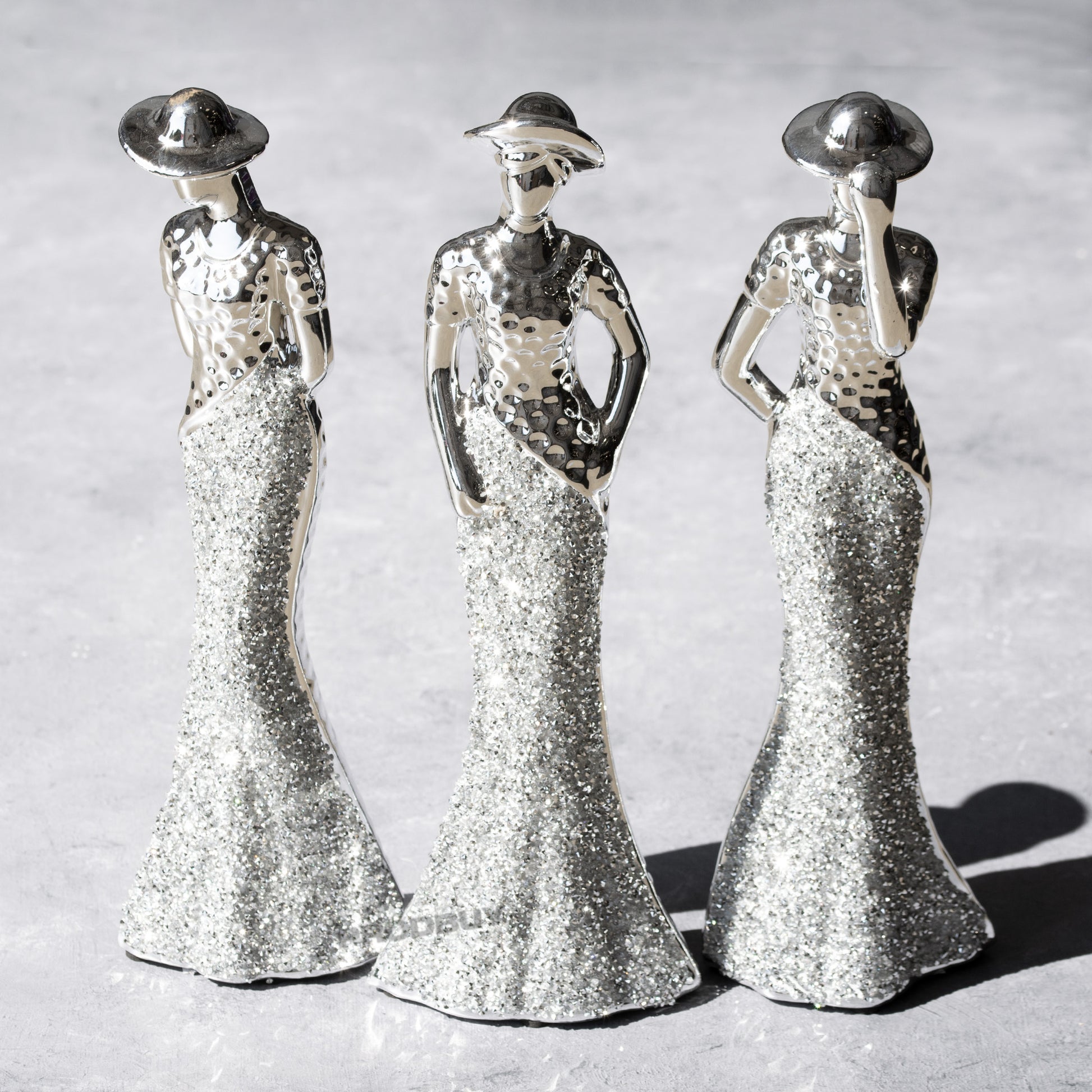 Set of three sparkly lady ornament that are suitable for free standing on flat surfaces inside your home. Made from ceramic material with a reflective silver colour finish and faux diamanté jewels on the front side of the bottom-half, each one is sure to stand out wherever they are placed.
