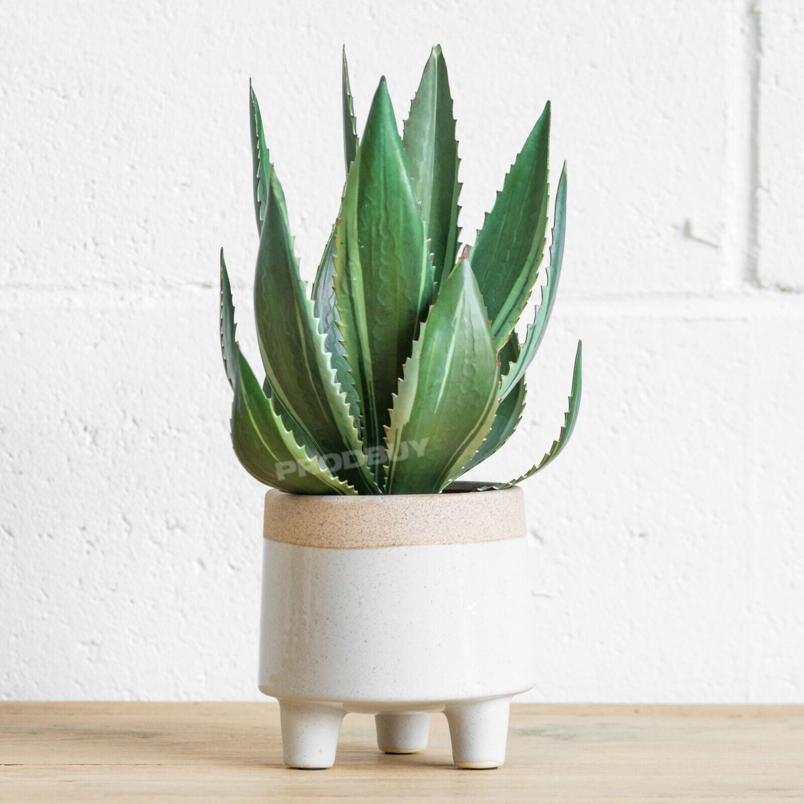 Artificial Aloe Vera house plant suitable for decoration around the home adding colour and character to any room without the need for regular watering. The plastic plant is potted inside a glazed ceramic pot that features three tripod legs and a two tone finish. Features three padded feet to protect surfaces placed upon.