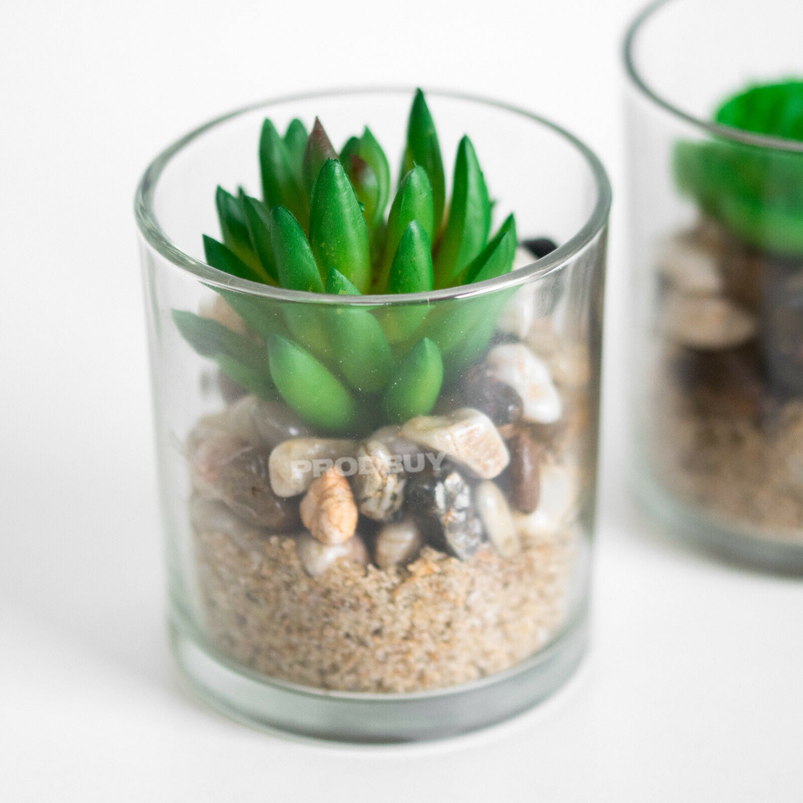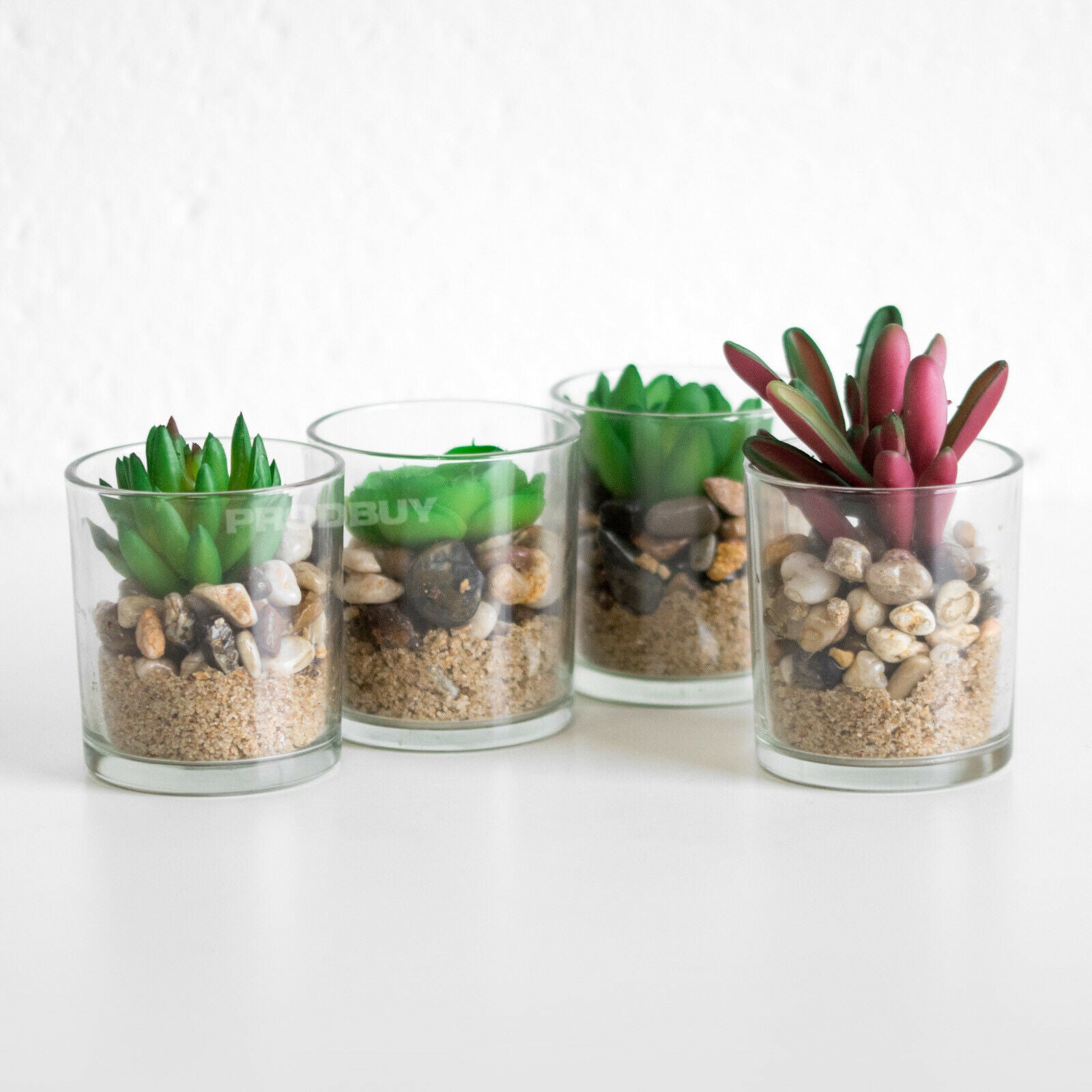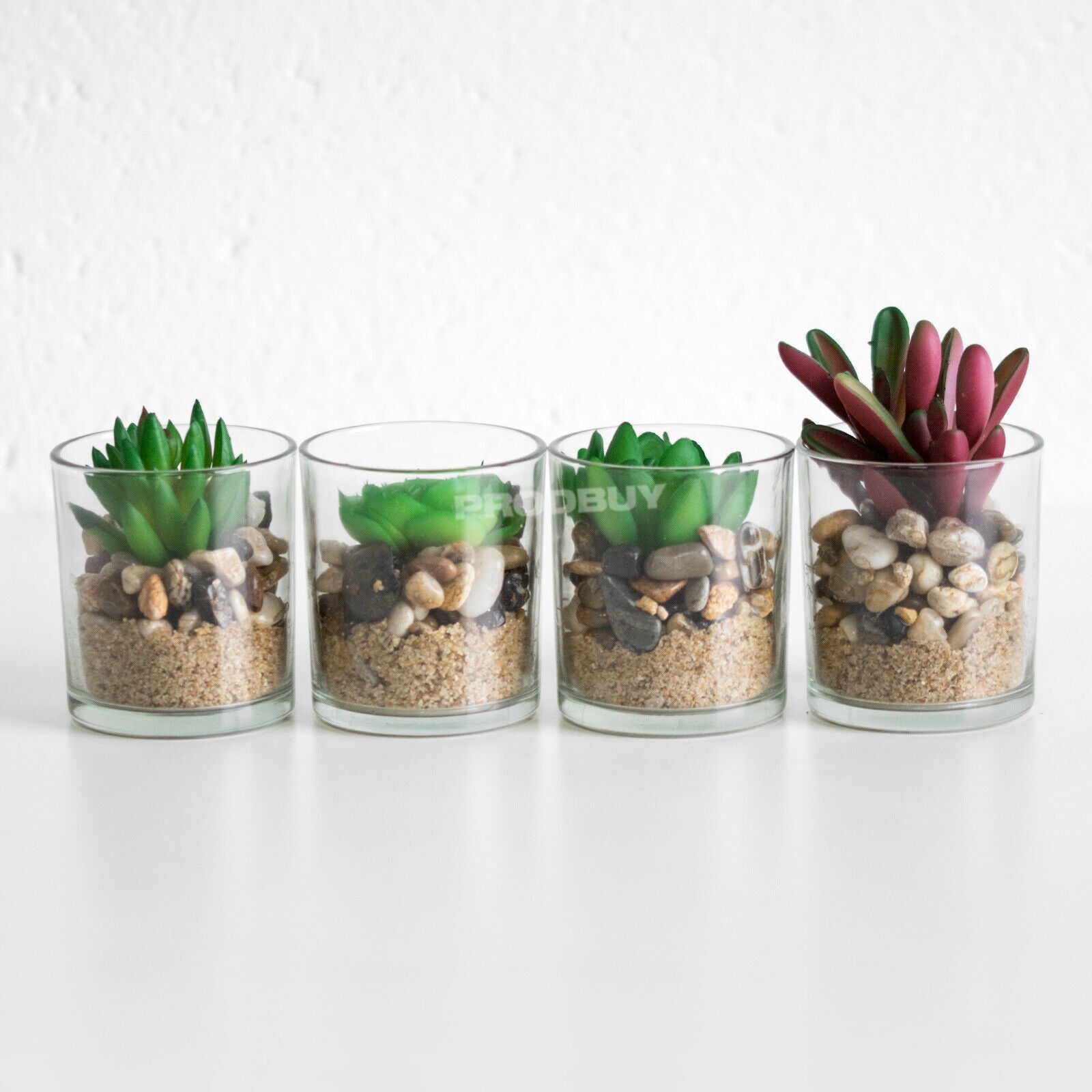 Artificial succulent house plants suitable for display and decoration around the home adding colour and character to interiors. The set includes one of each design pictured. The plants are made from plastic and the plant pots are made from thick transparent glass.