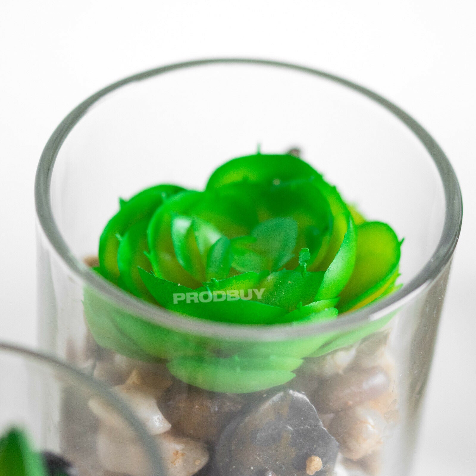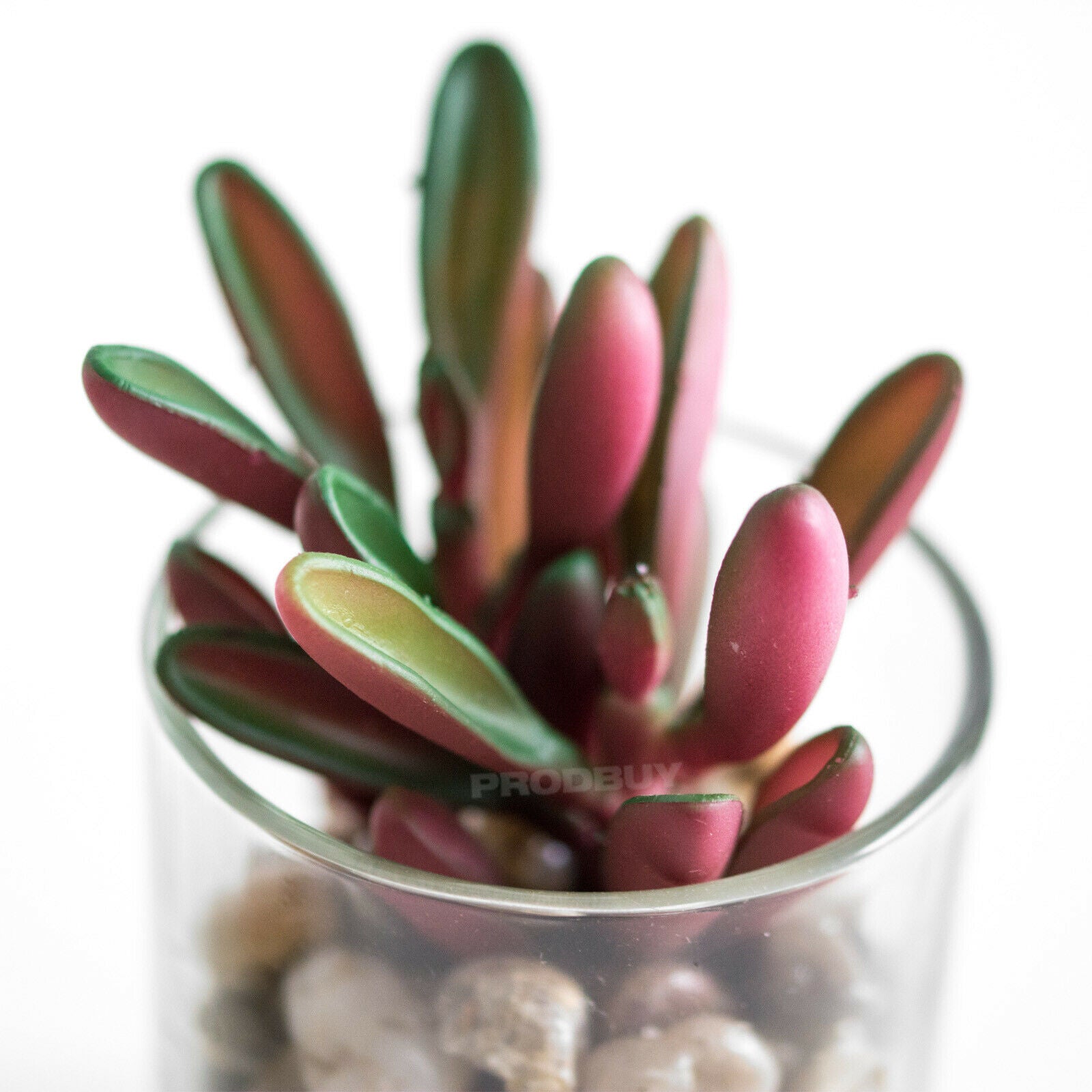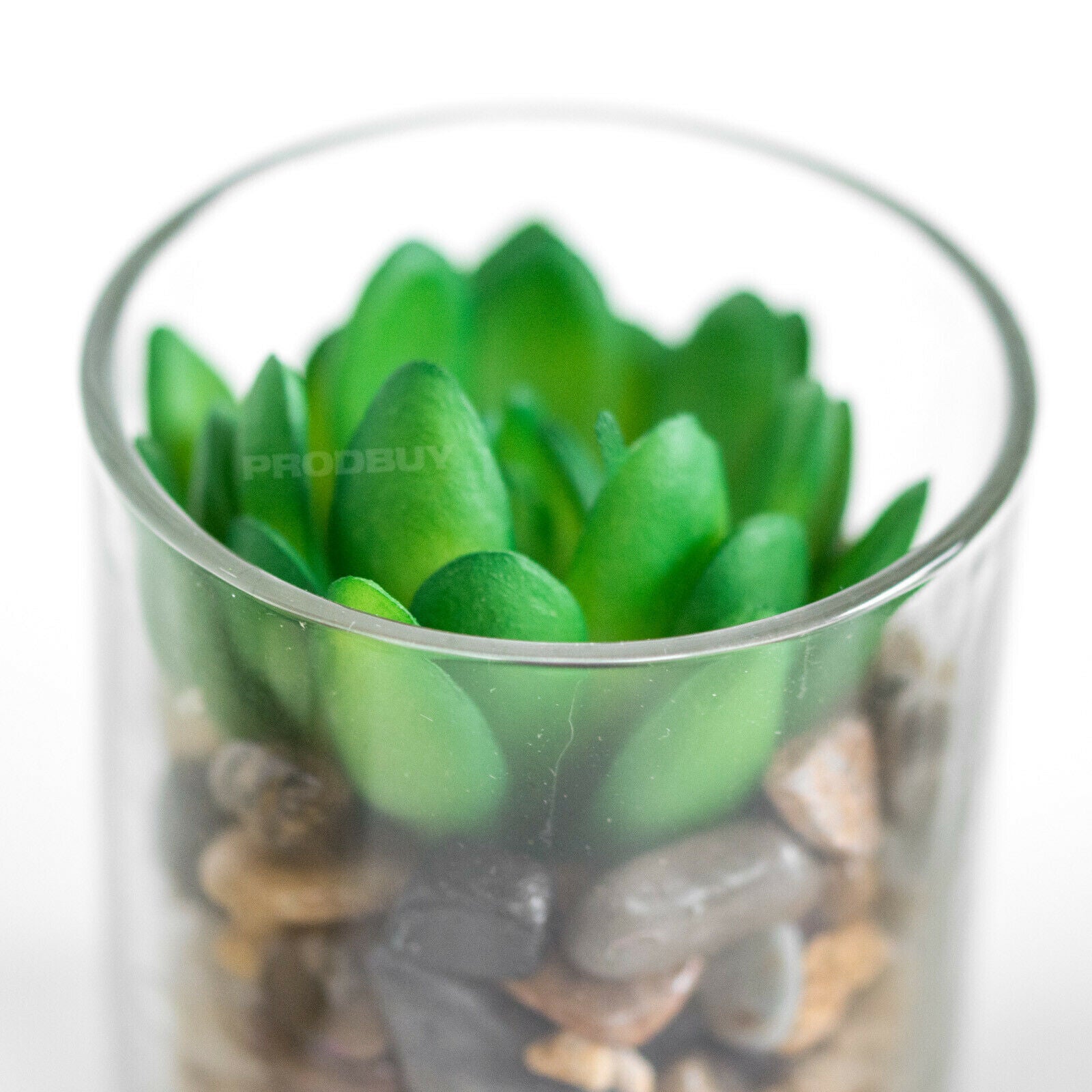 Artificial succulent house plants suitable for display and decoration around the home adding colour and character to interiors. The set includes one of each design pictured. The plants are made from plastic and the plant pots are made from thick transparent glass.