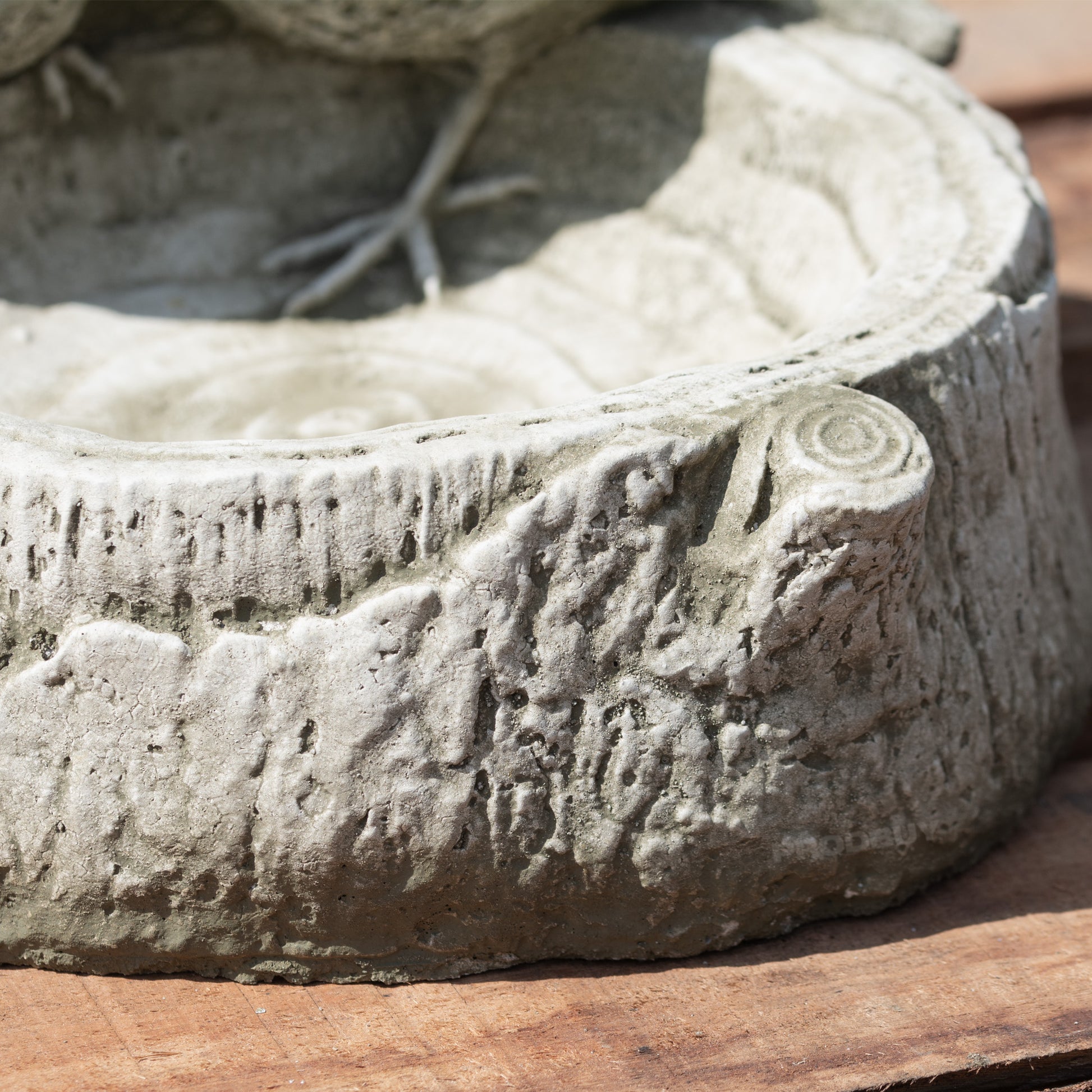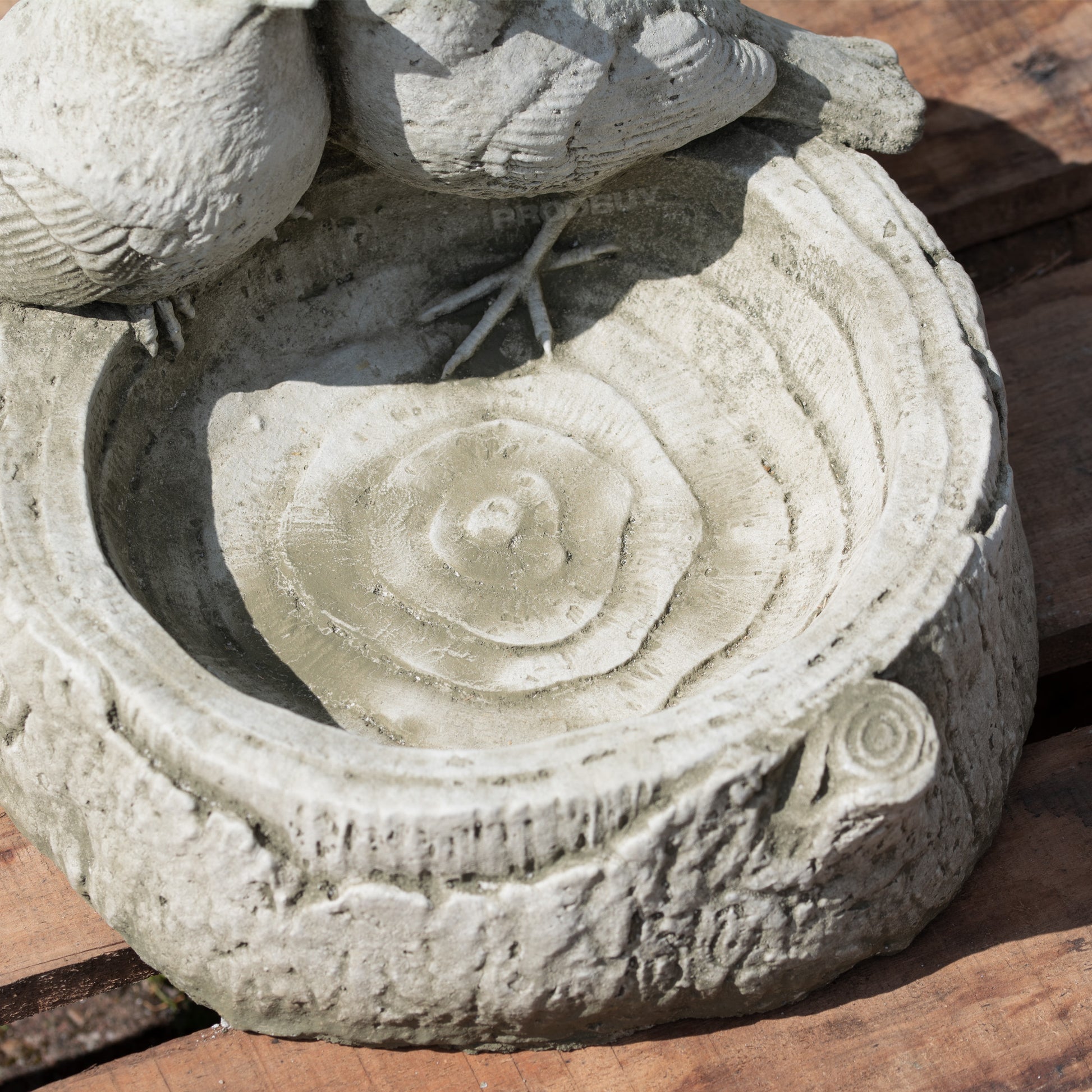 Garden bird bath/feeder made from reconstituted stone and concrete in the United Kingdom. It has an antique style patina finish with a detailed appearance and intricate surface texture. The statue is mostly stone grey in colour but with a slightly yellow/brown tint in places.