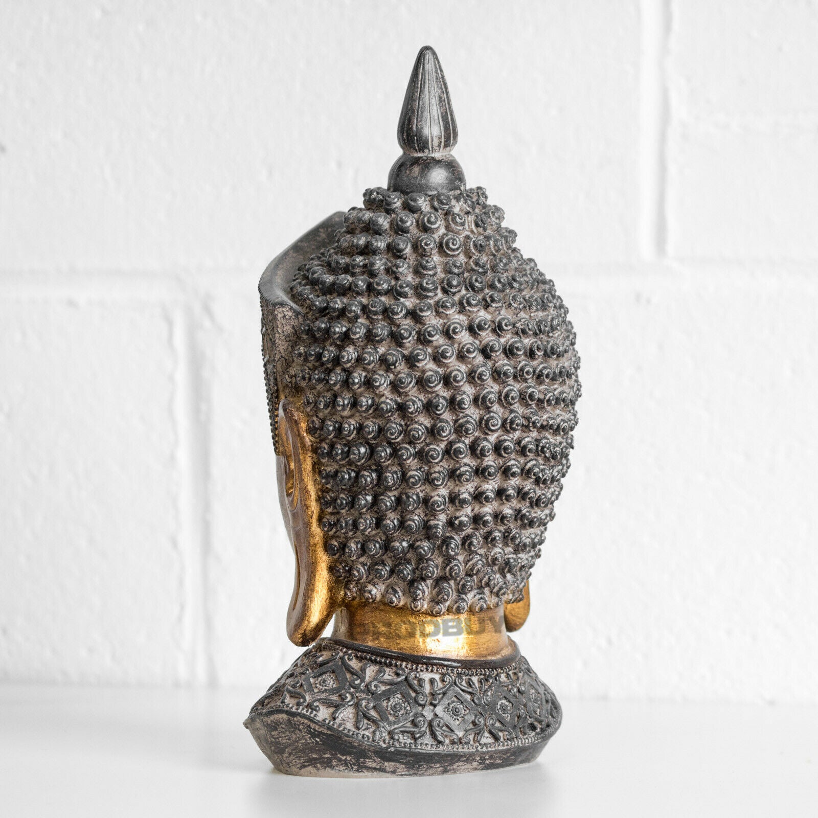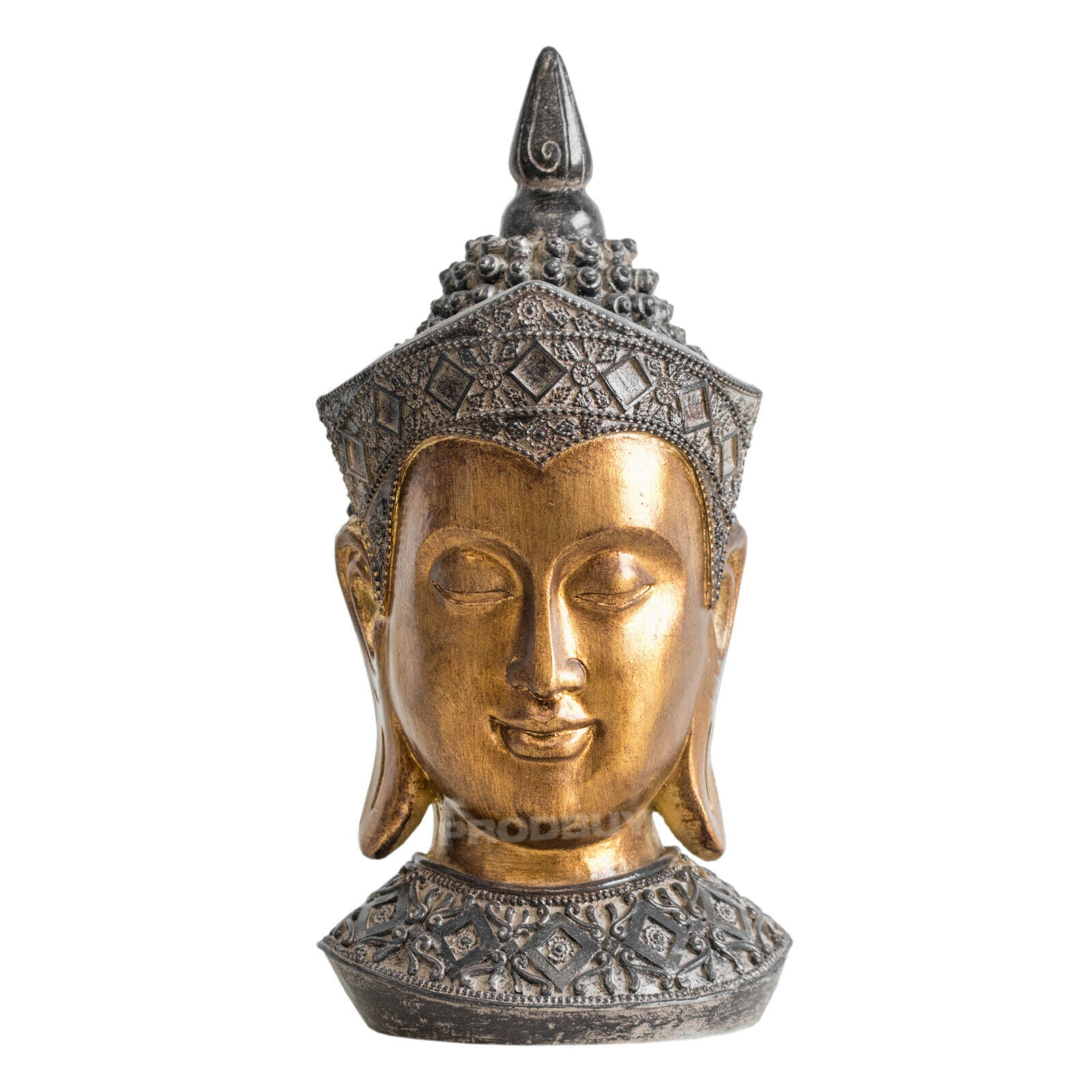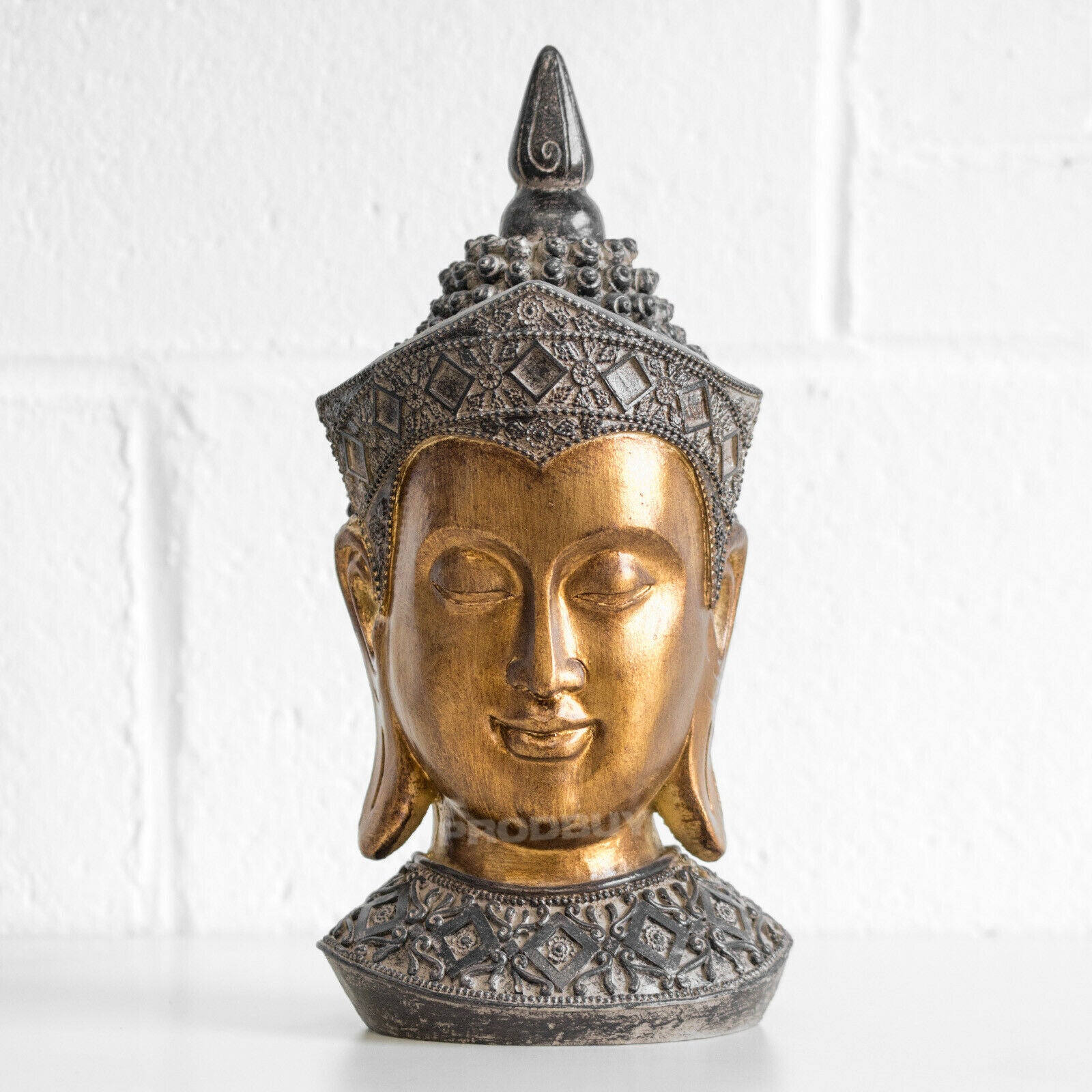 Large Buddha head ornament suitable for decoration around the home. Made from resin the head is gold in colour with a distressed aged finish. Ideal for displaying around the home on mantelpieces, shelves and office desks. Supplied in smart retail box packaging. Would make a lovely gift.