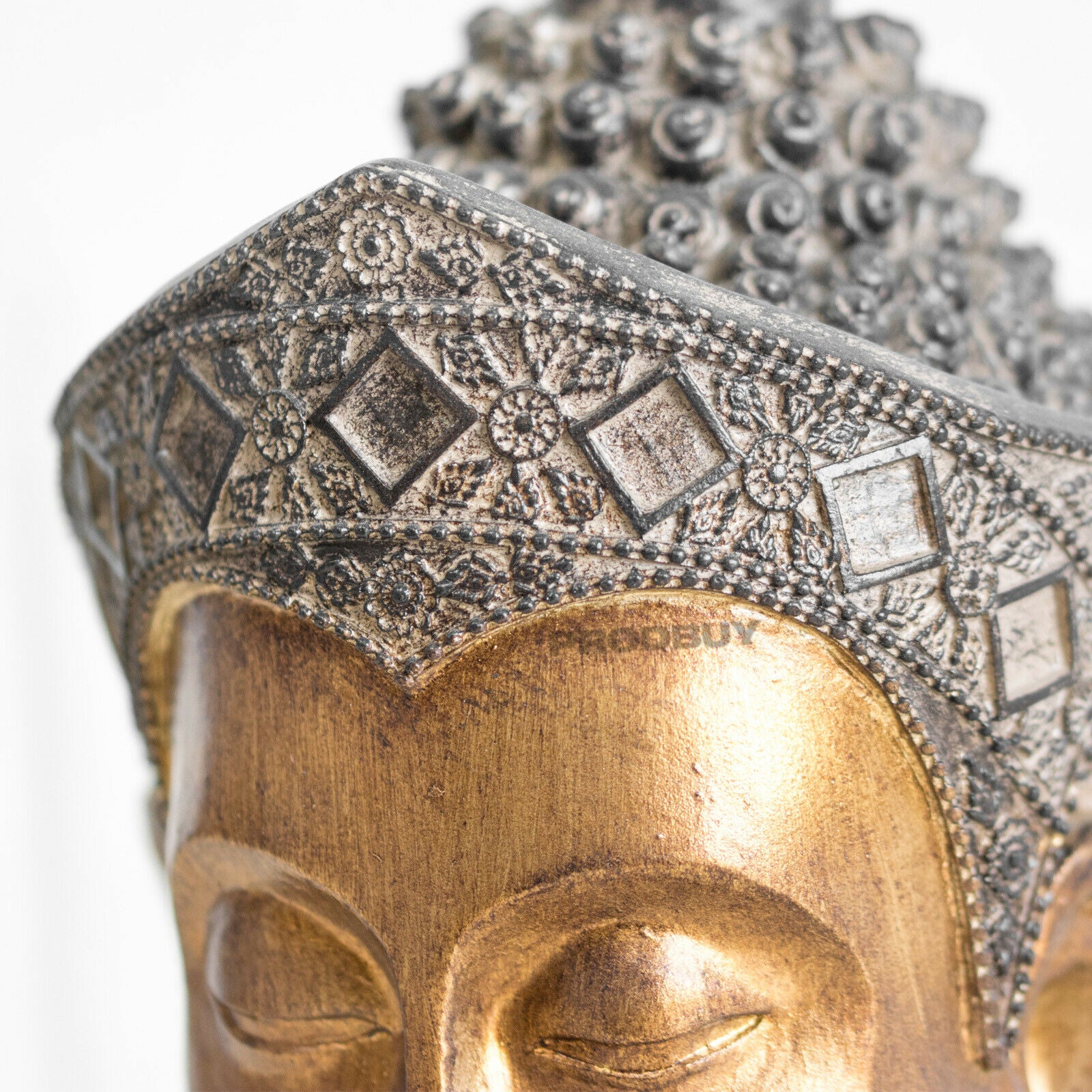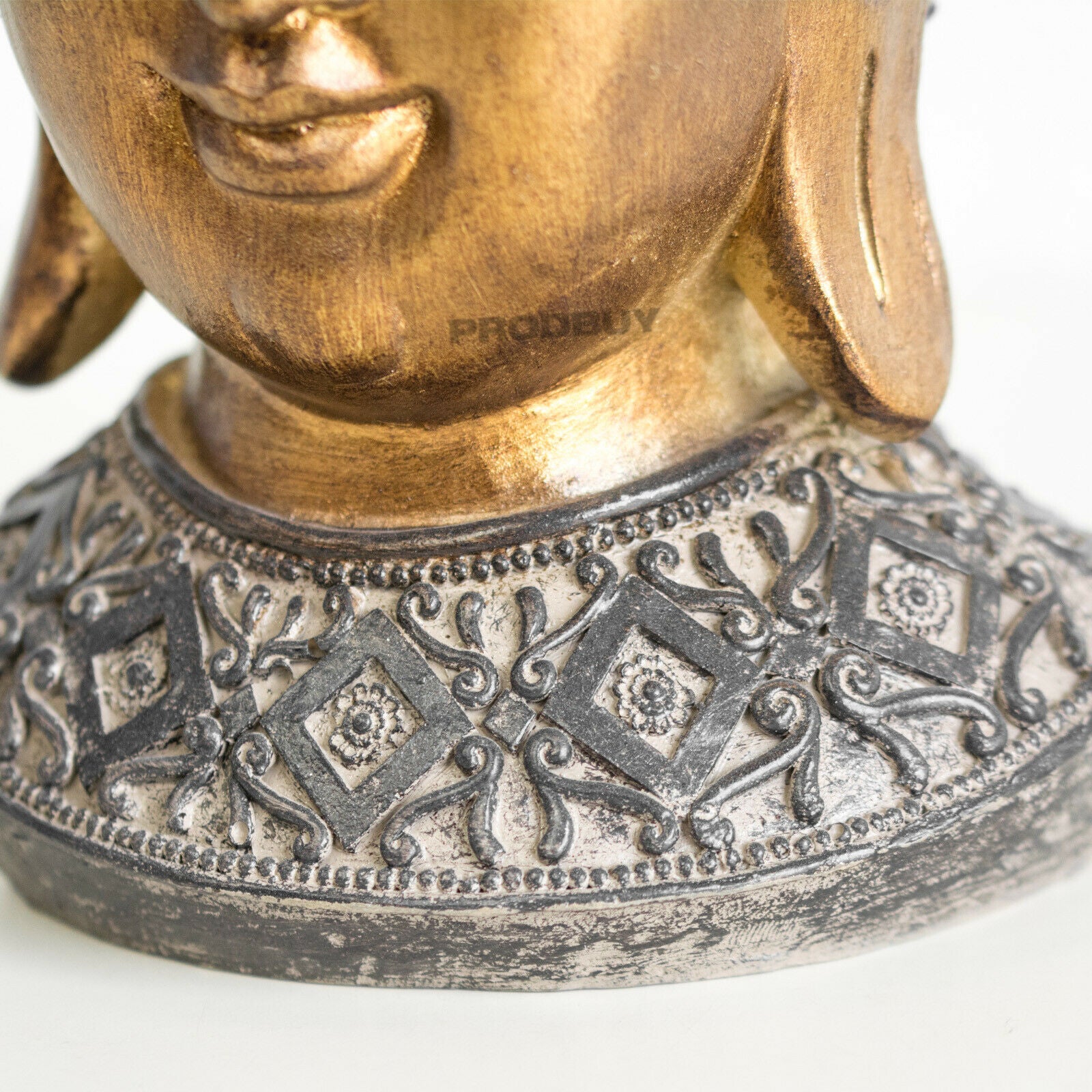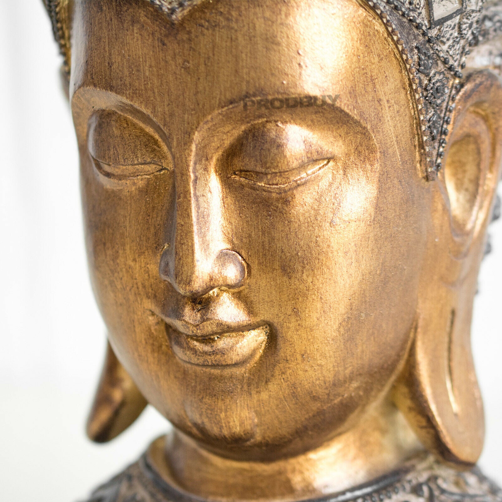 Large Buddha head ornament suitable for decoration around the home. Made from resin the head is gold in colour with a distressed aged finish. Ideal for displaying around the home on mantelpieces, shelves and office desks. Supplied in smart retail box packaging. Would make a lovely gift.