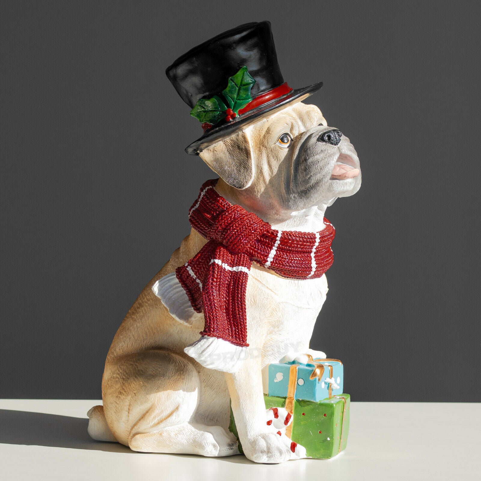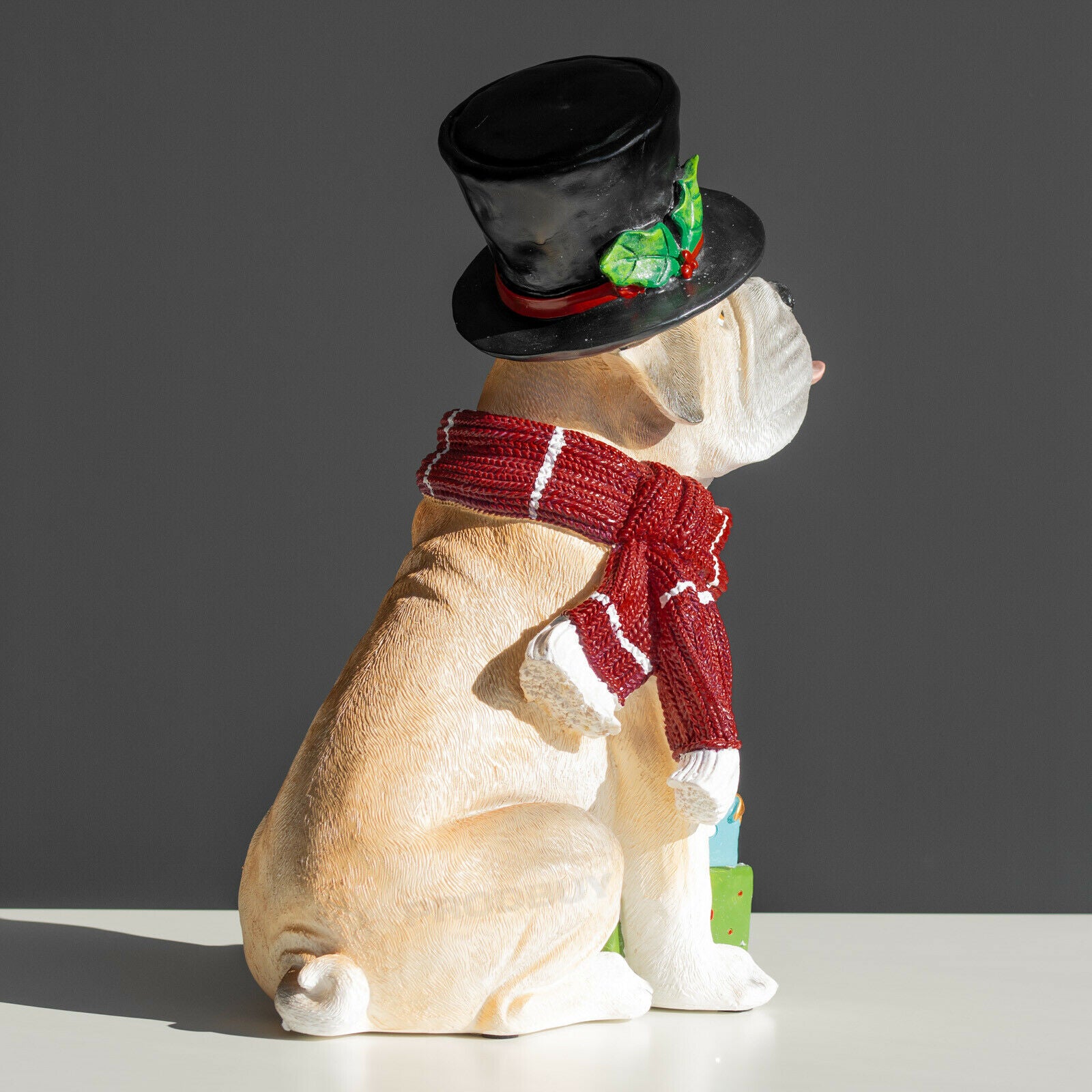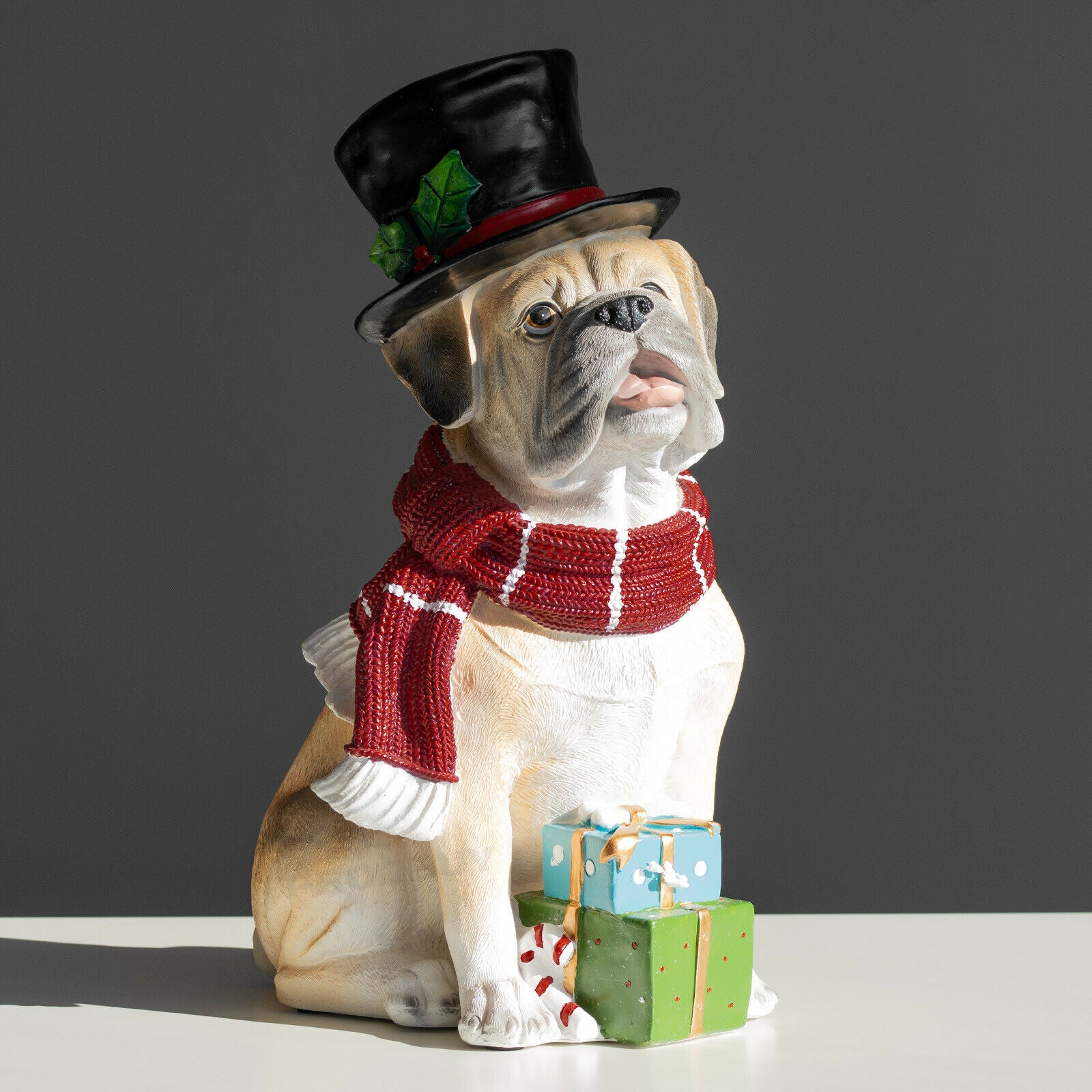 Cute looking Christmas dog ornament featuring strong resin material with sandy brown colour, red colour resin scarf and top hat with black colour and green holly detail. This splendidly good dog is there to help you get into the Christmas spirit. It is suitable for freestanding on flat surfaces and is sure to look great around the home and office.