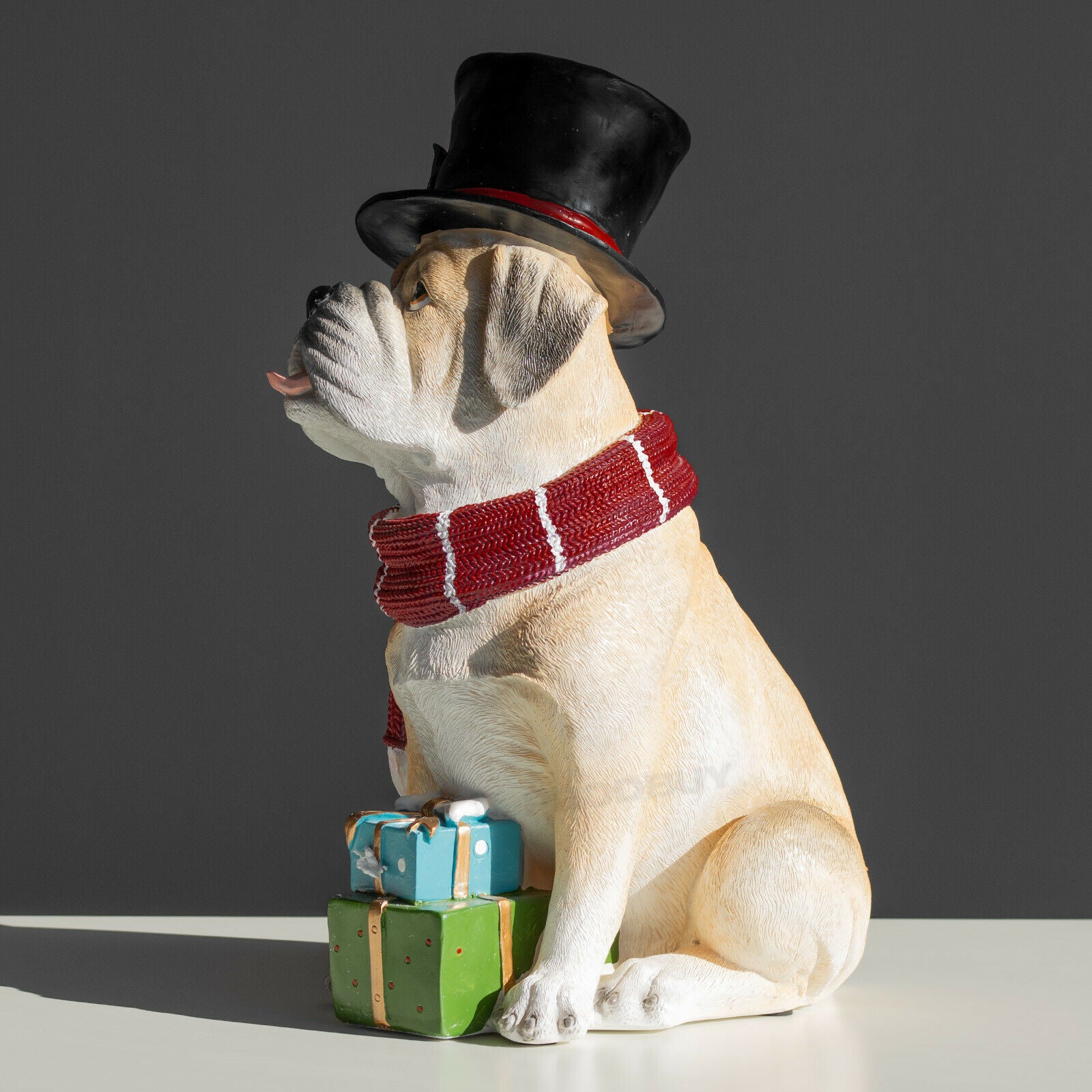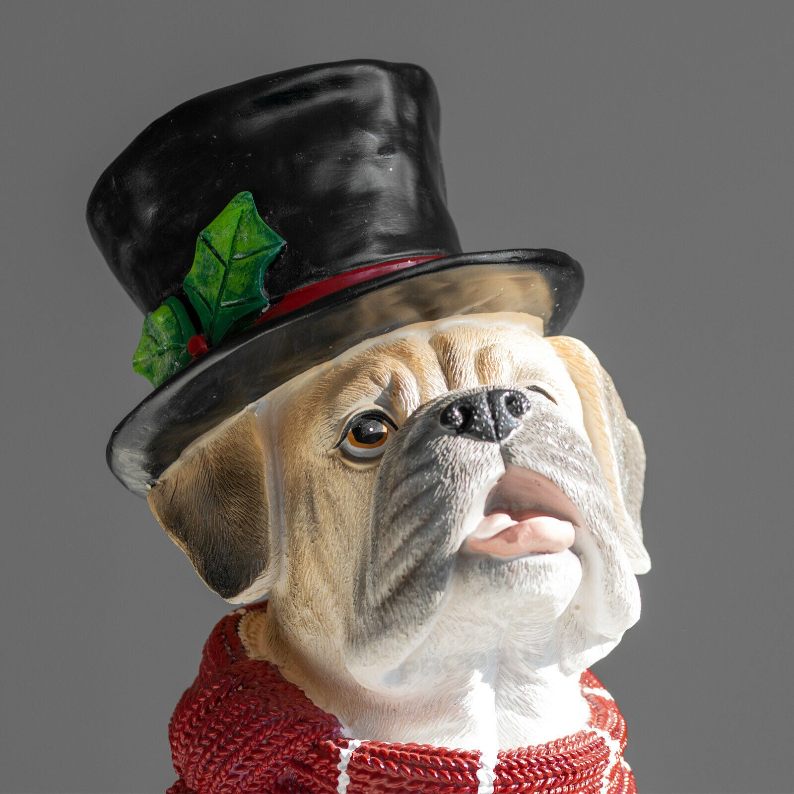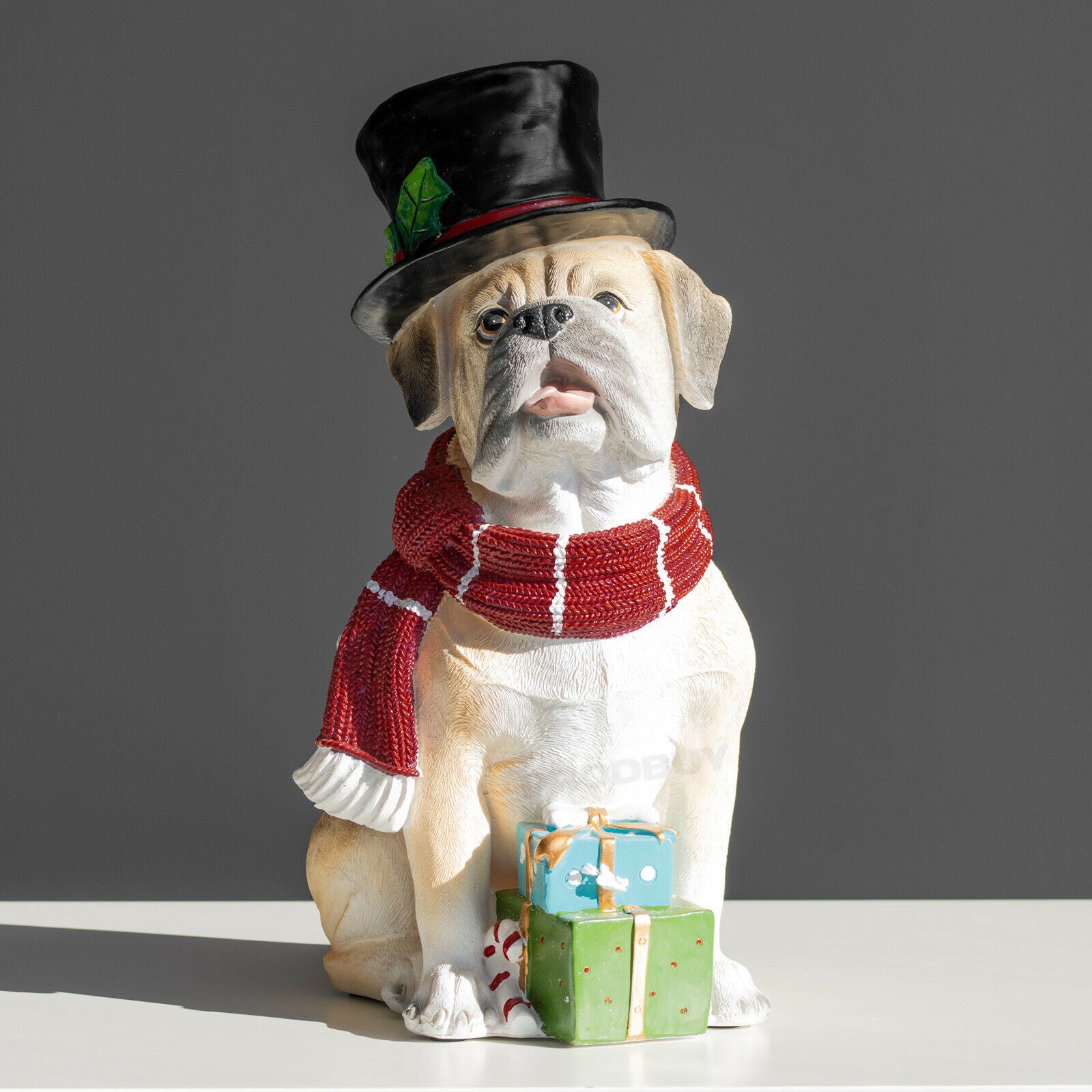 Cute looking Christmas dog ornament featuring strong resin material with sandy brown colour, red colour resin scarf and top hat with black colour and green holly detail. This splendidly good dog is there to help you get into the Christmas spirit. It is suitable for freestanding on flat surfaces and is sure to look great around the home and office.