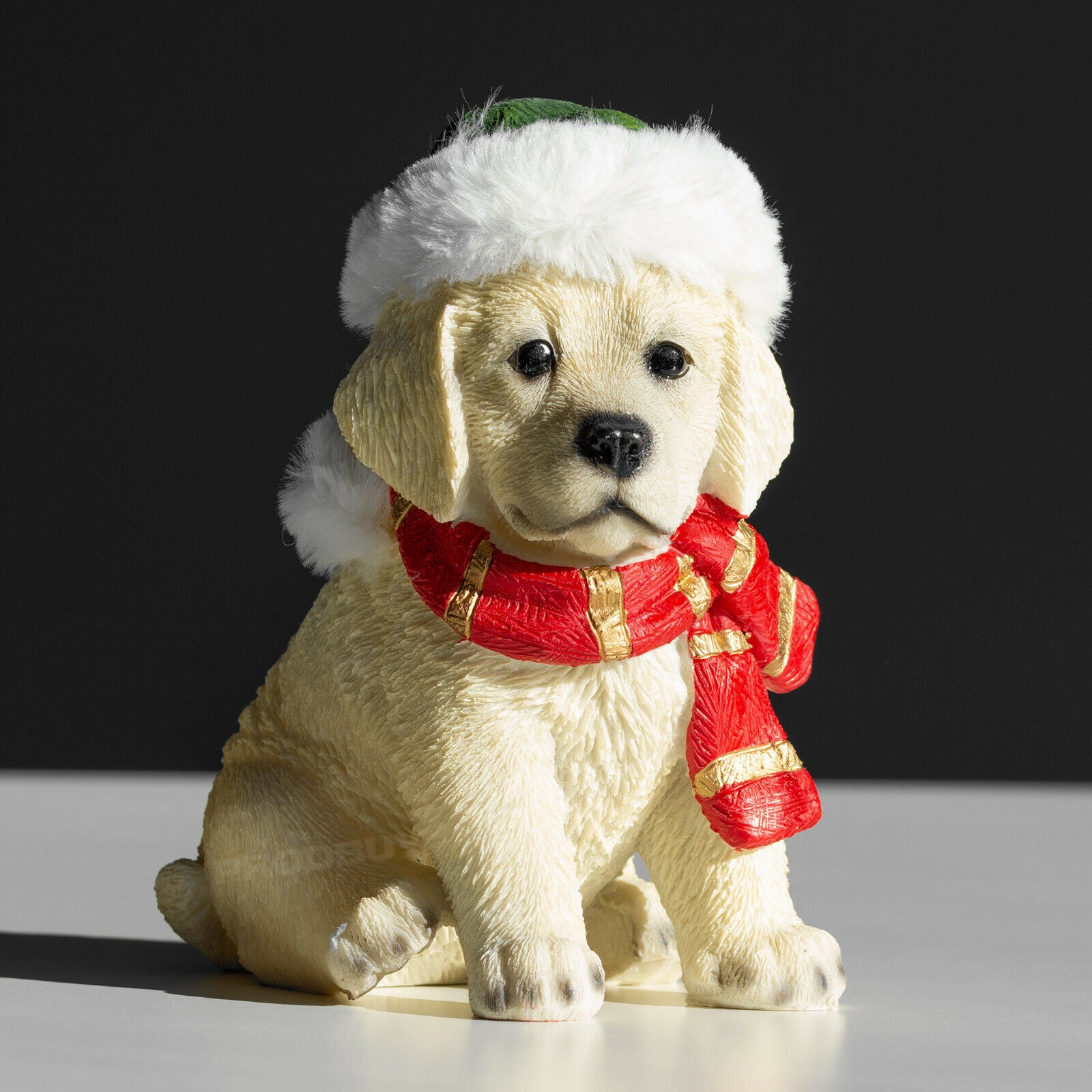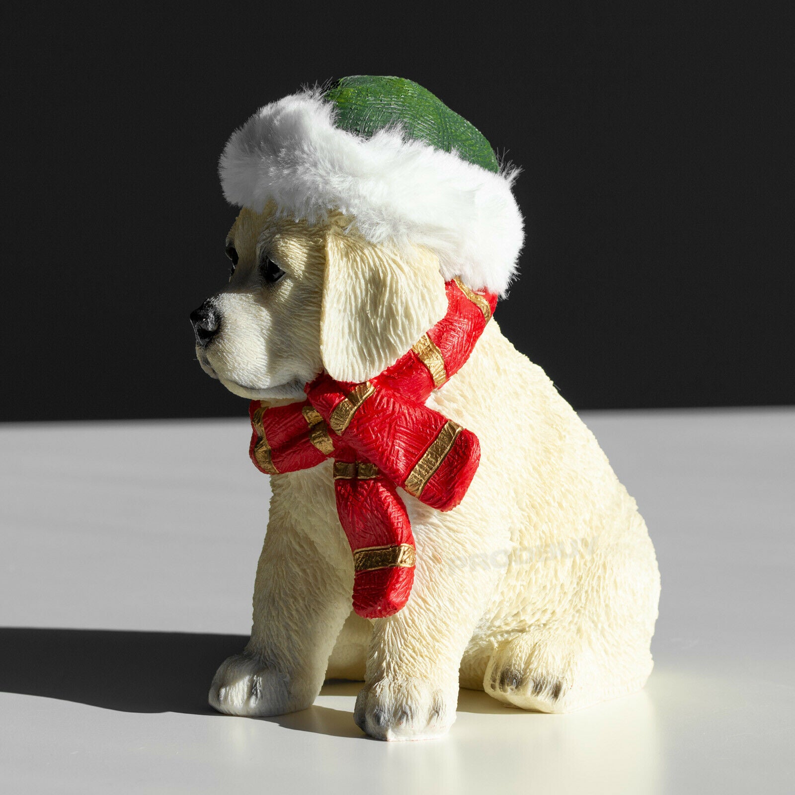 Cute looking Christmas dog ornament featuring strong resin material with sandy brown colour, red and gold colour resin scarf and hat with green and white colour (the white part is fabric). This good dog is there to help you get into the Christmas spirit. It is suitable for freestanding on flat surfaces and is sure to look great around the home and office.