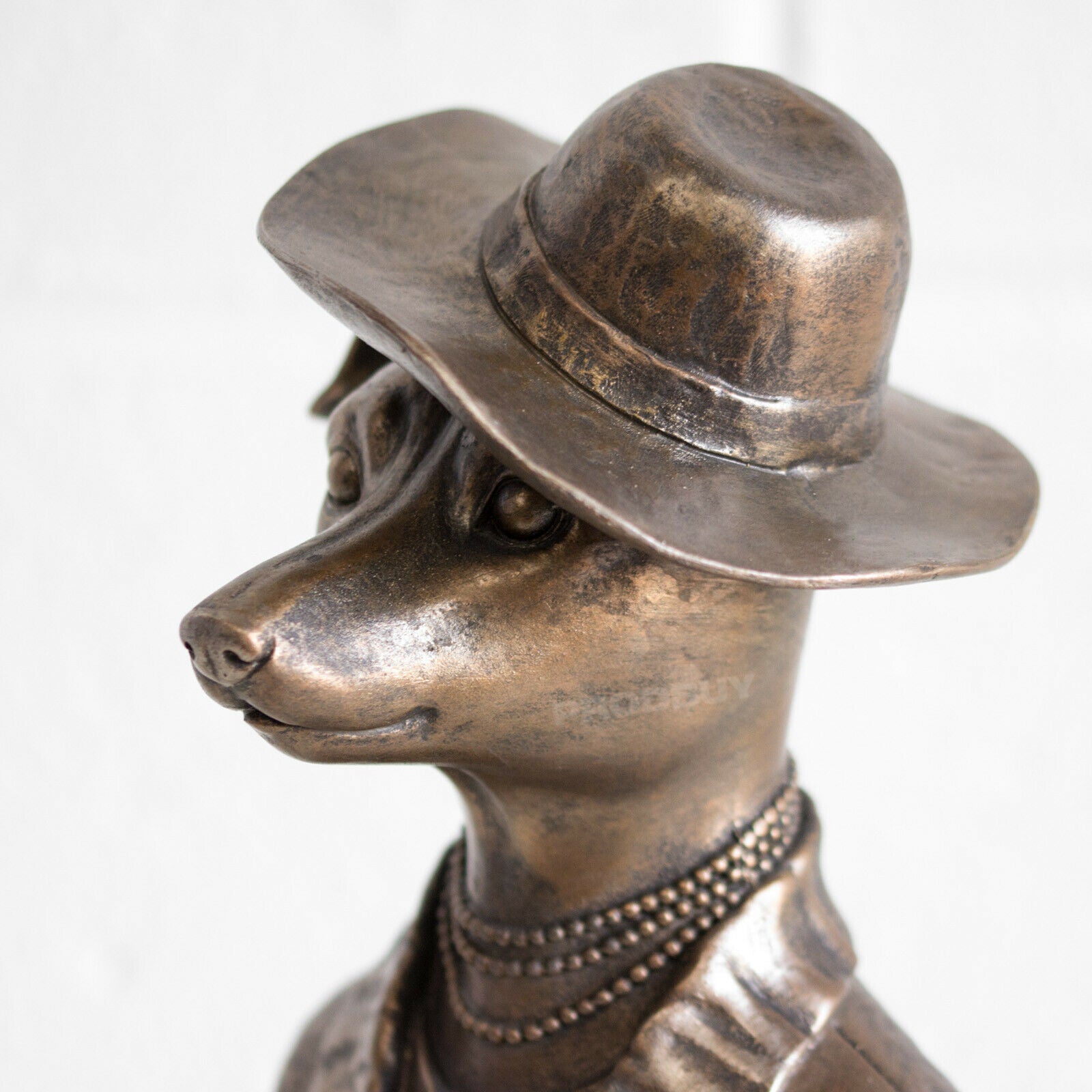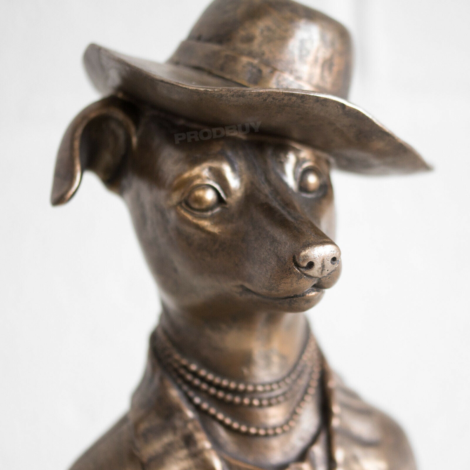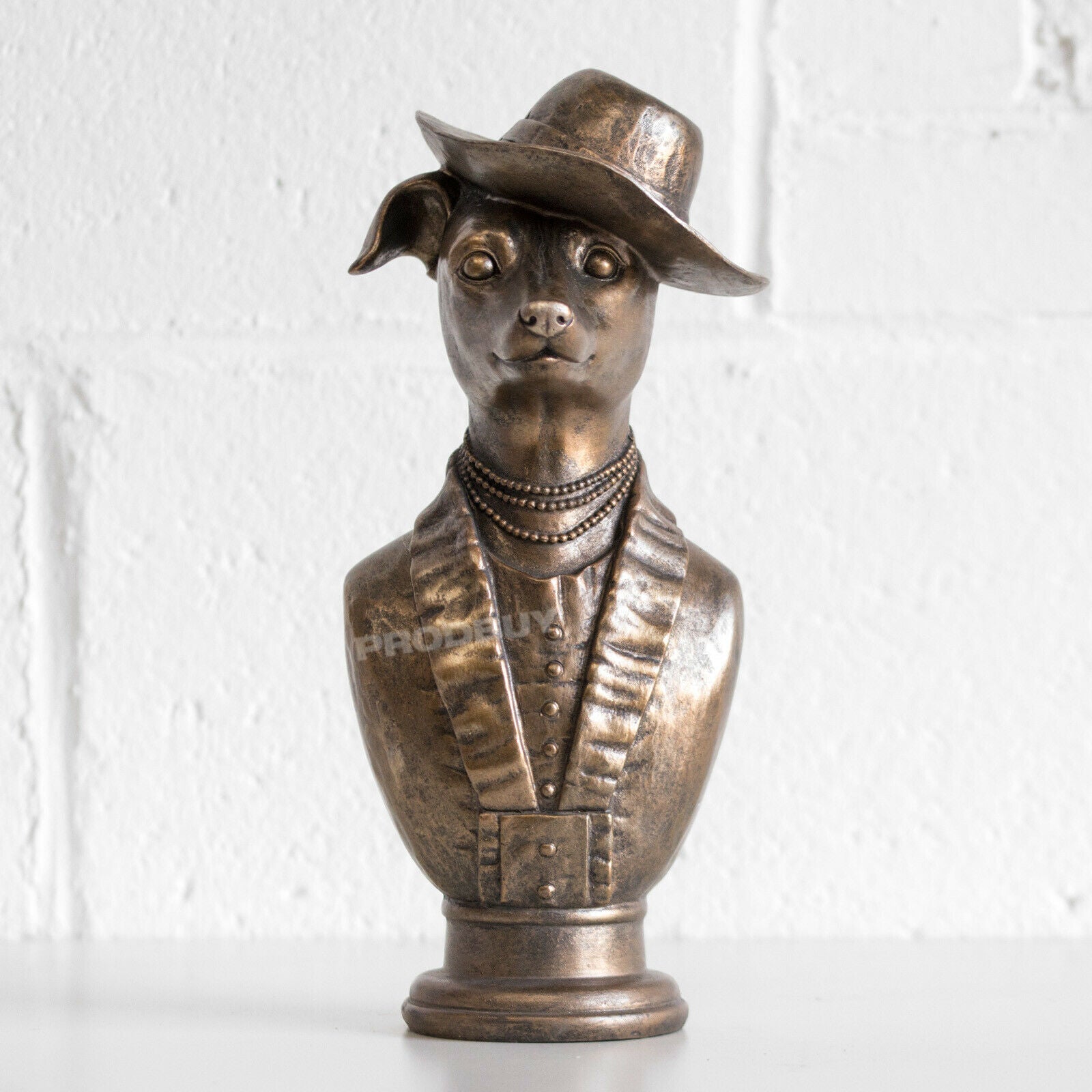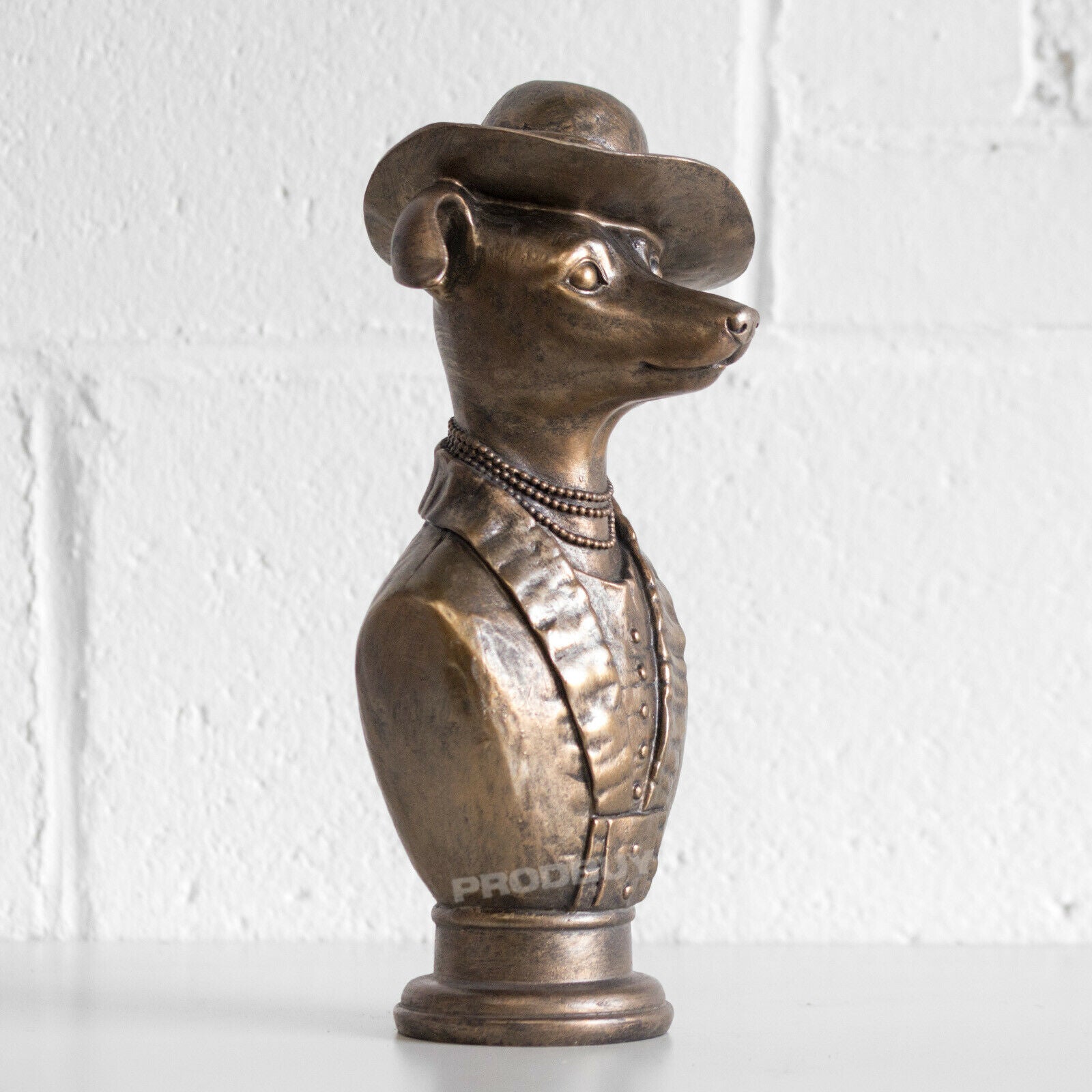 Ornamental dog bust suitable for display and decoration around the home. Made from resin with a distressed bronze coloured finish designed to create an aged appearance.