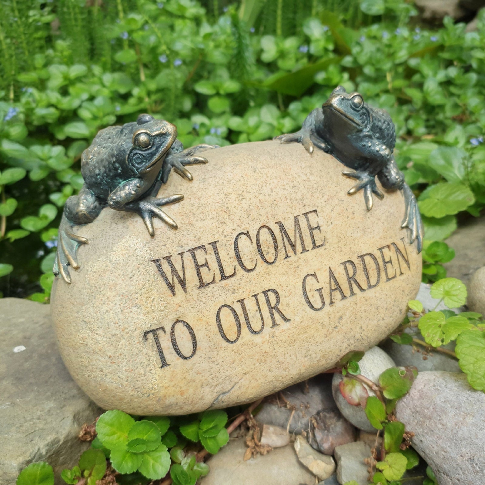 "Welcome to our garden" ornament, made from resin. It features two lifelike frogs with an antique bronze effect, sitting on a stone. The two frogs are sitting on the stone, poised to greet any visitors.
