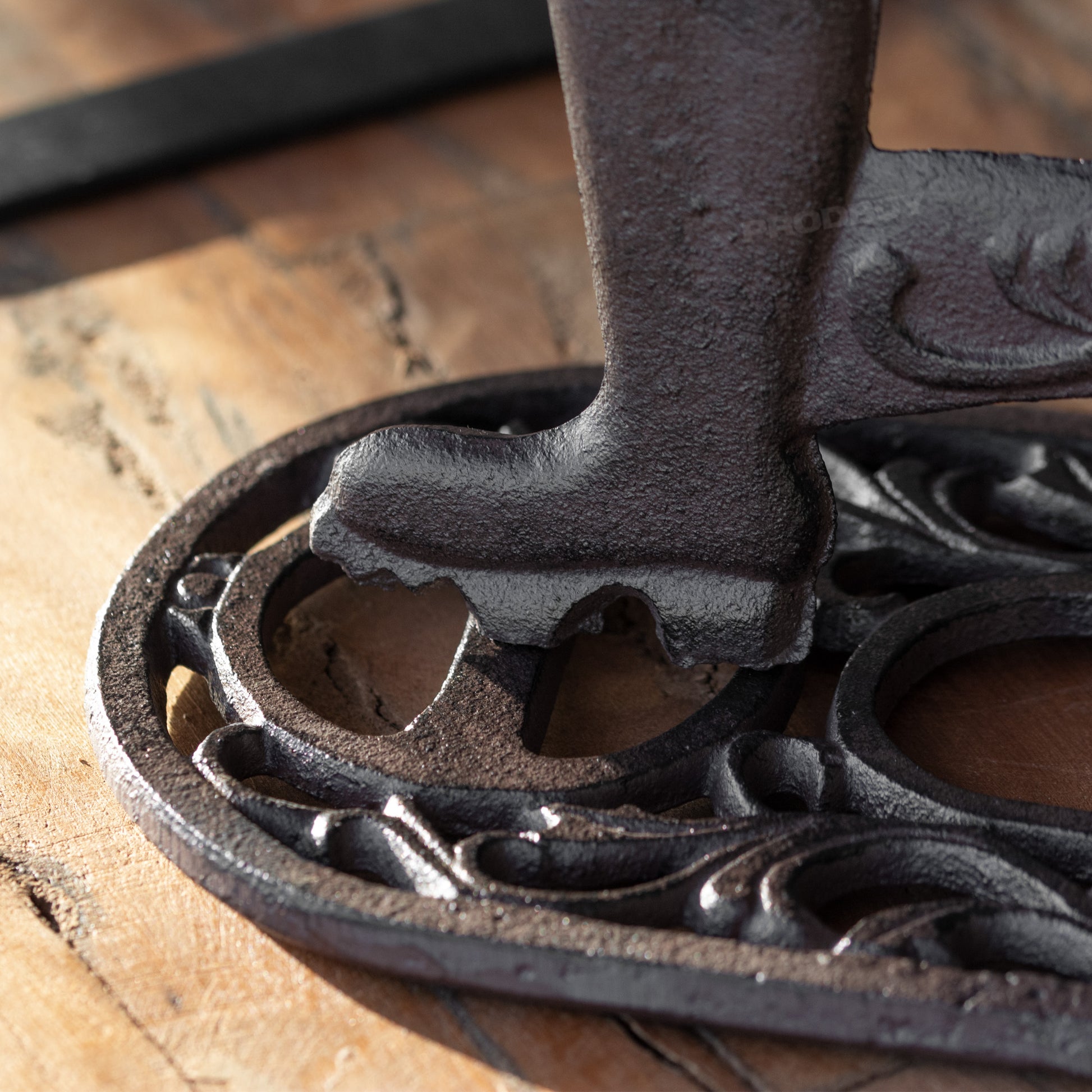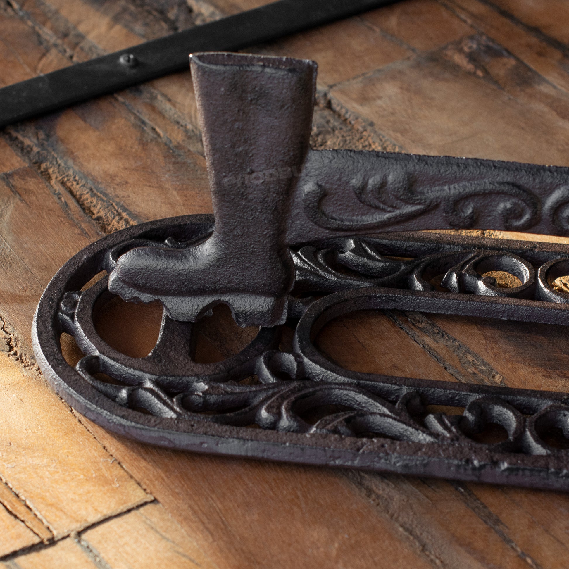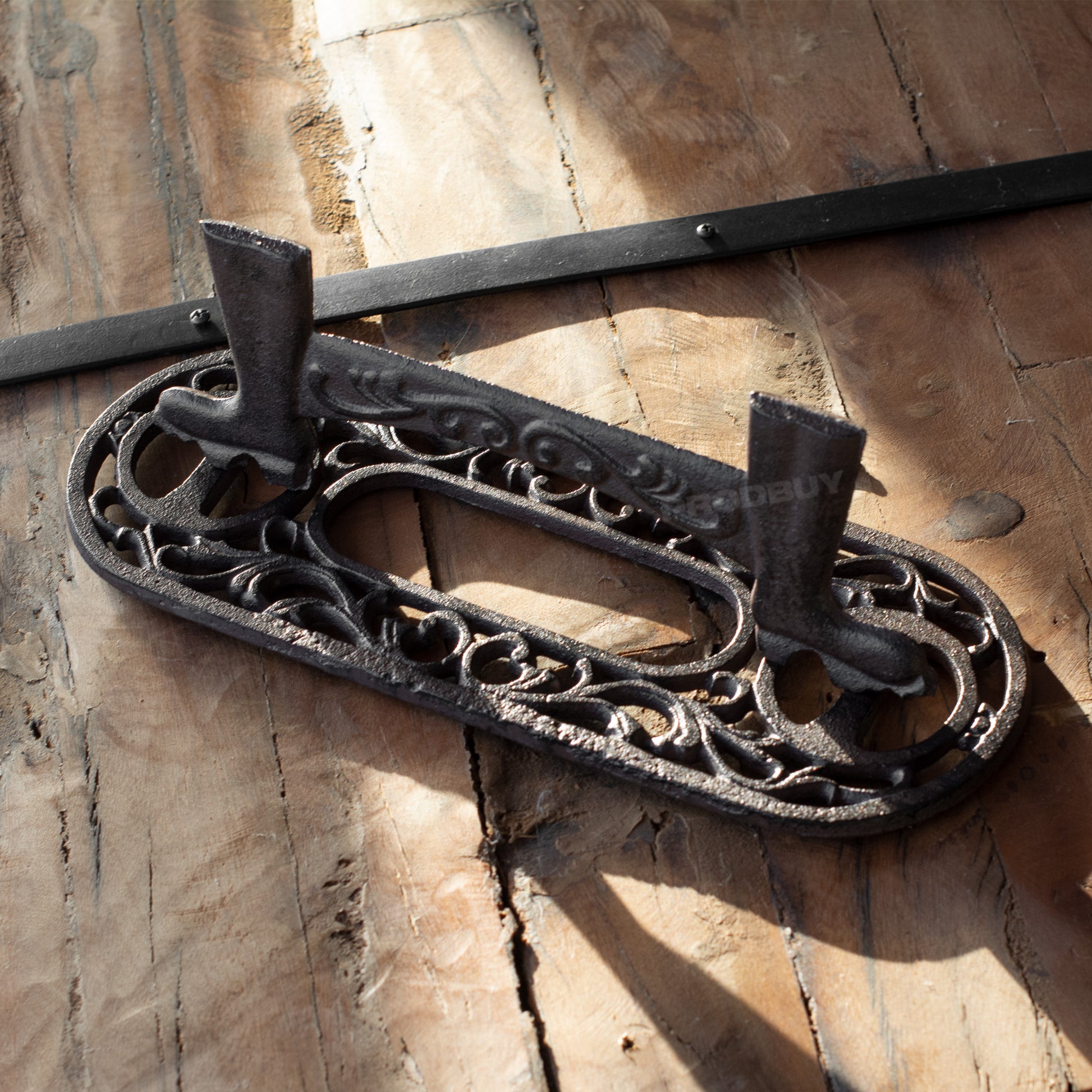 Heavy boot scraper with an aged, weathered appearance and a design featuring two boots and a scroll pattern. Made from cast iron, it has a weighty, high quality feel.