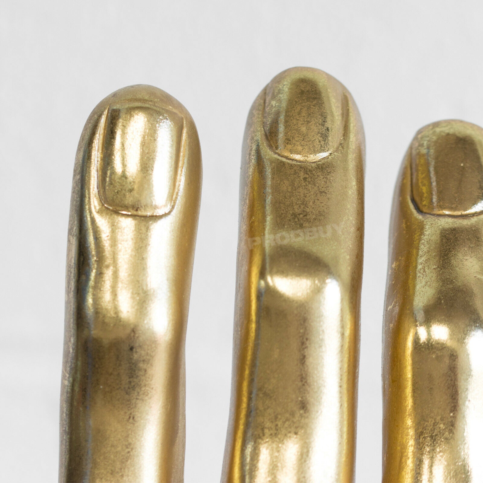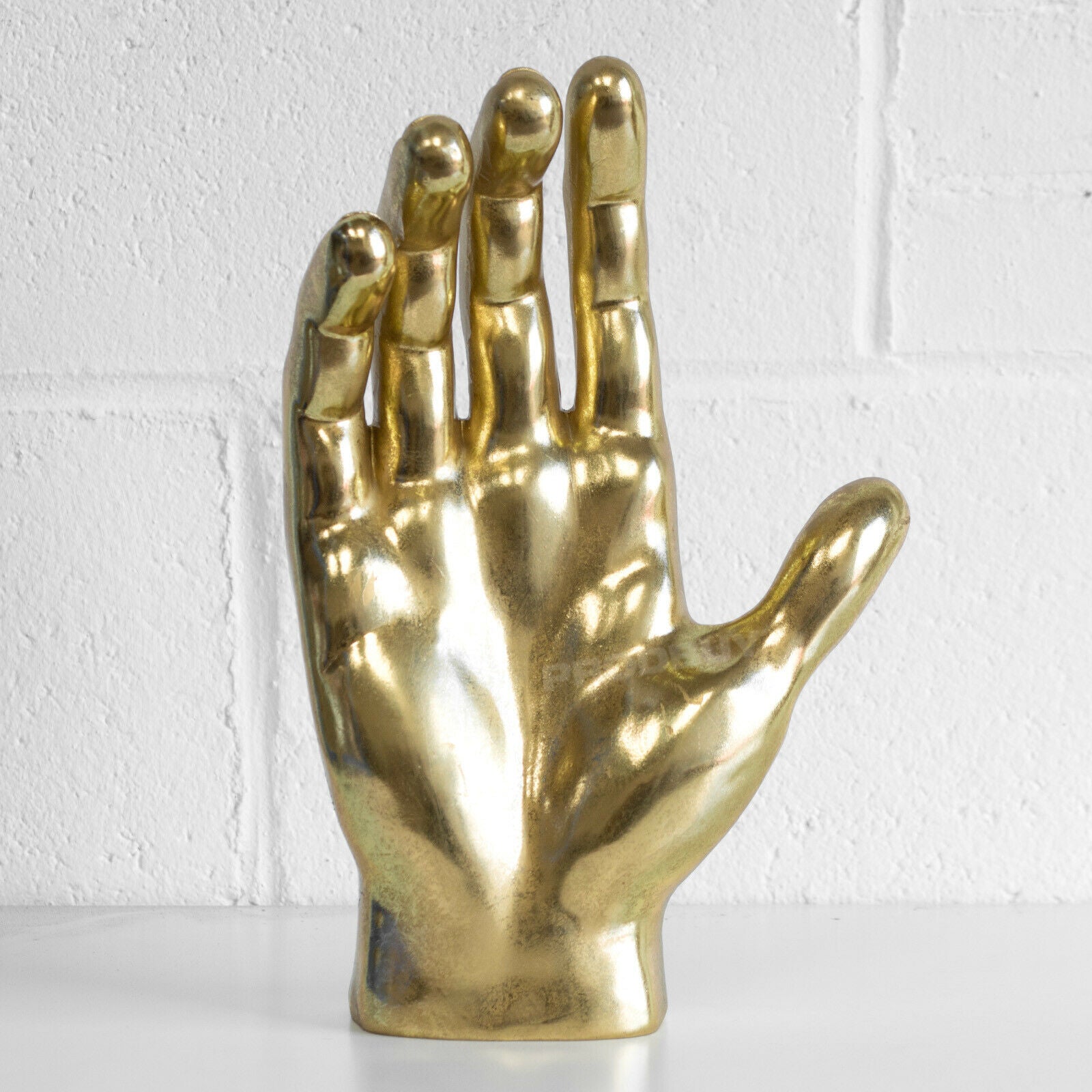 Cool looking standing large hand art sculpture featuring gold colour. Made from resin material with painted gold finish, it is ideal for displaying around the home or office to add some colour to your room.
