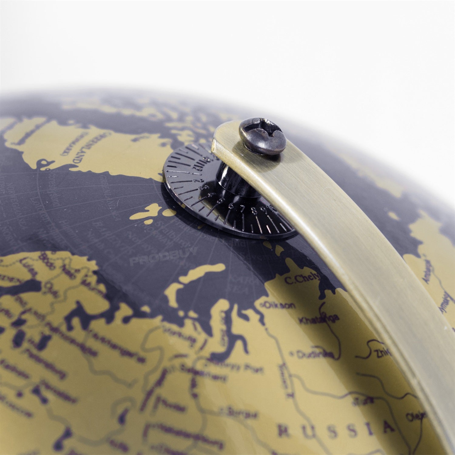 Decorative globe ornament suitable for decoration around the home or office. The globe itself has a diameter of twenty one centimetres and is made from plastic, the stand is made from metal with a brushed gold finish. The globe is dark navy blue in colour with gold countries. Supplied in smart retail box packaging would make a lovely gift.