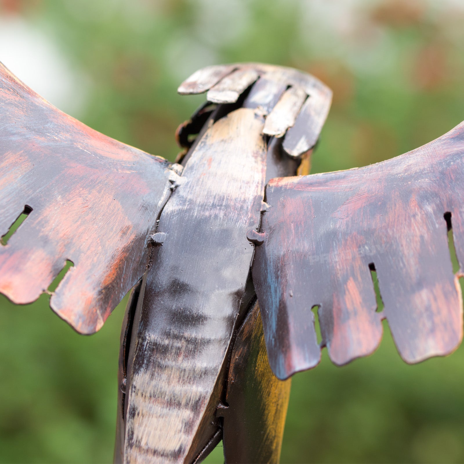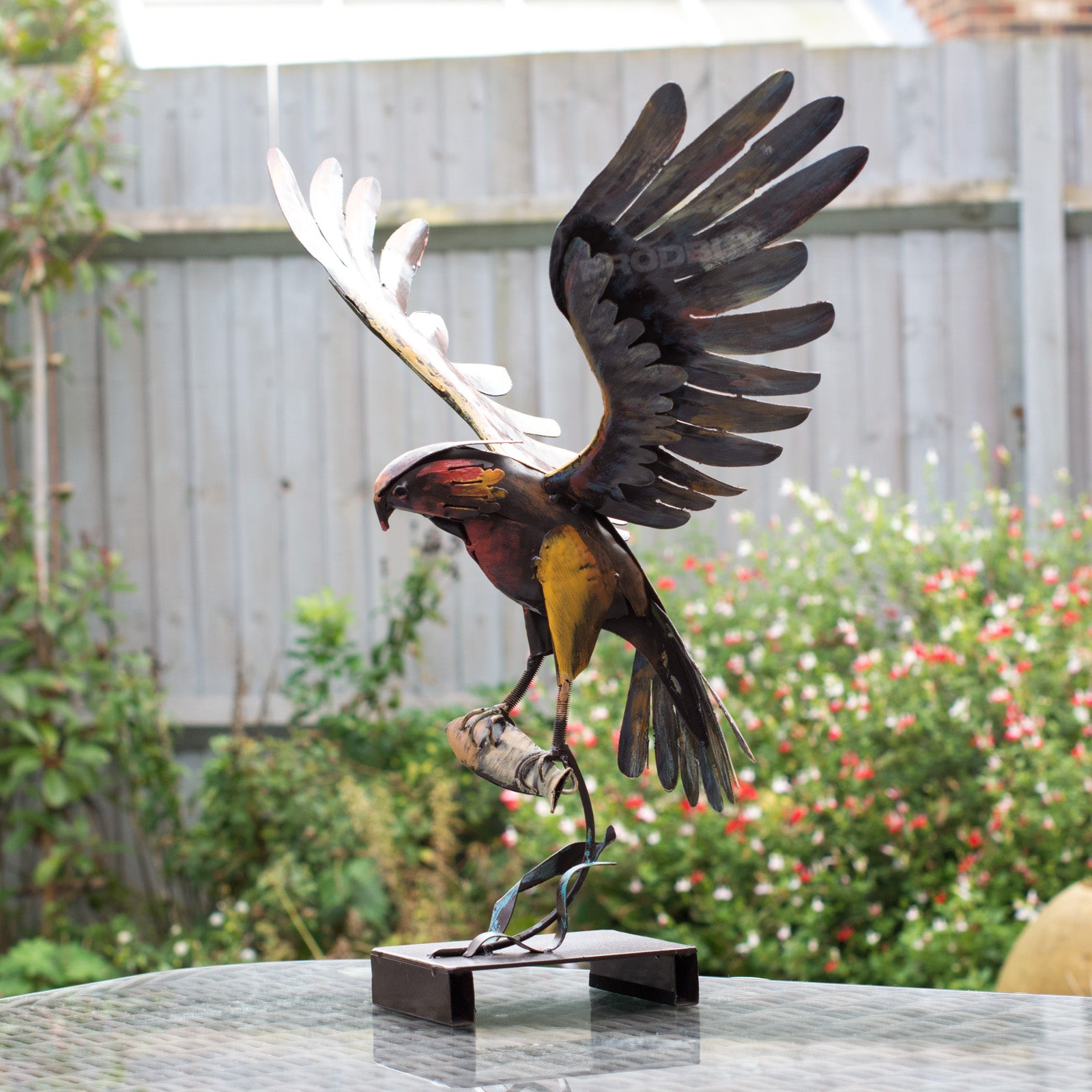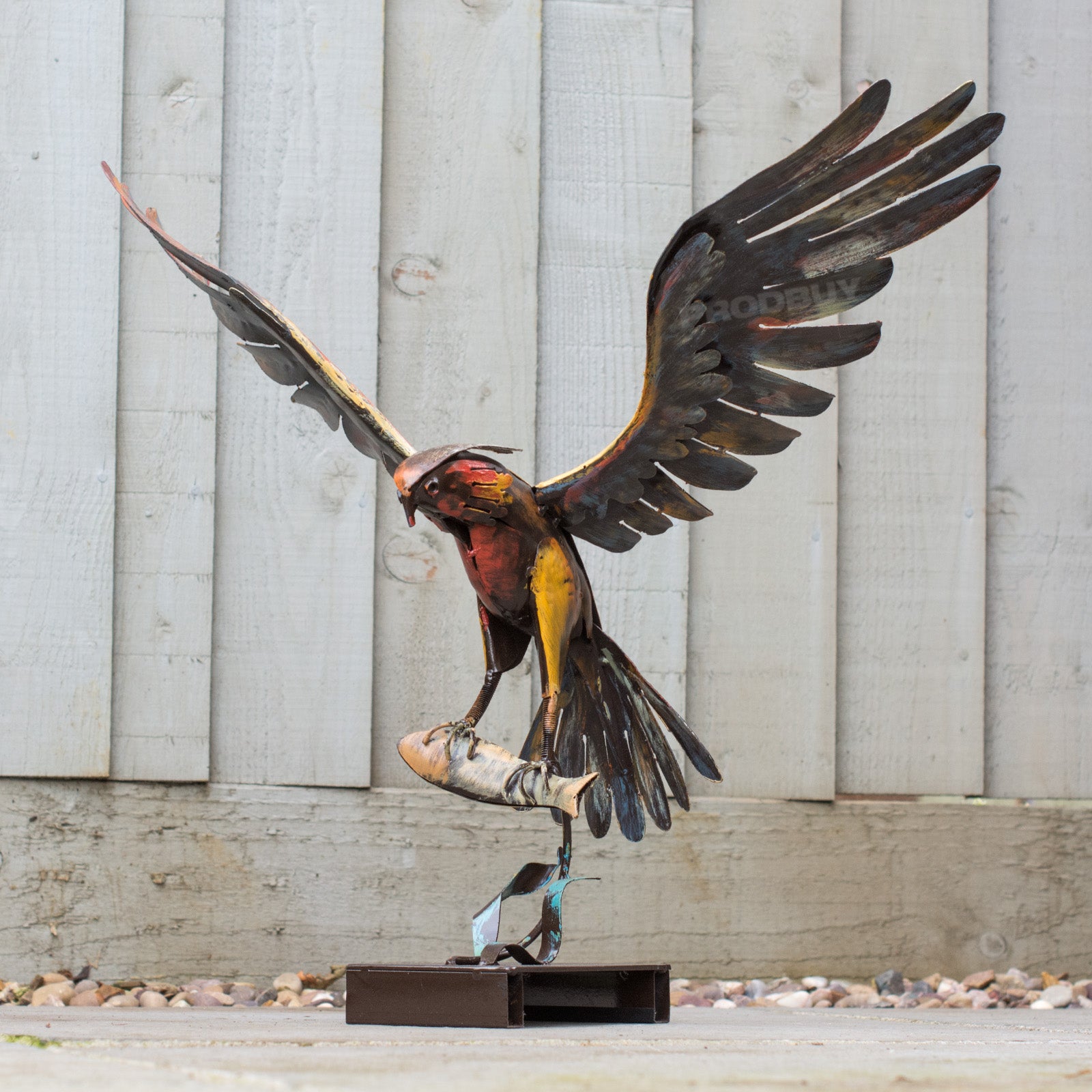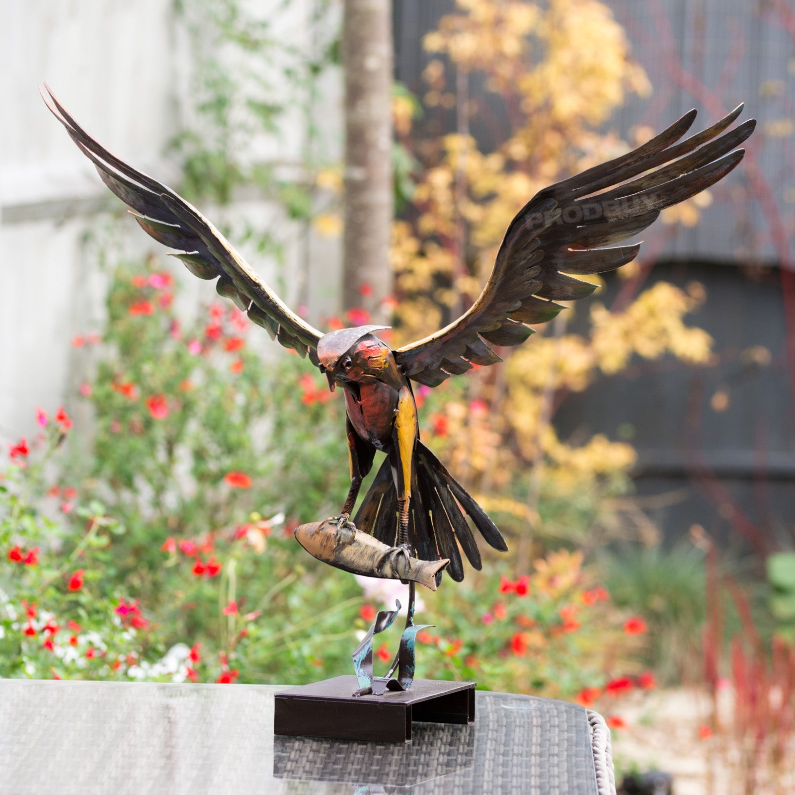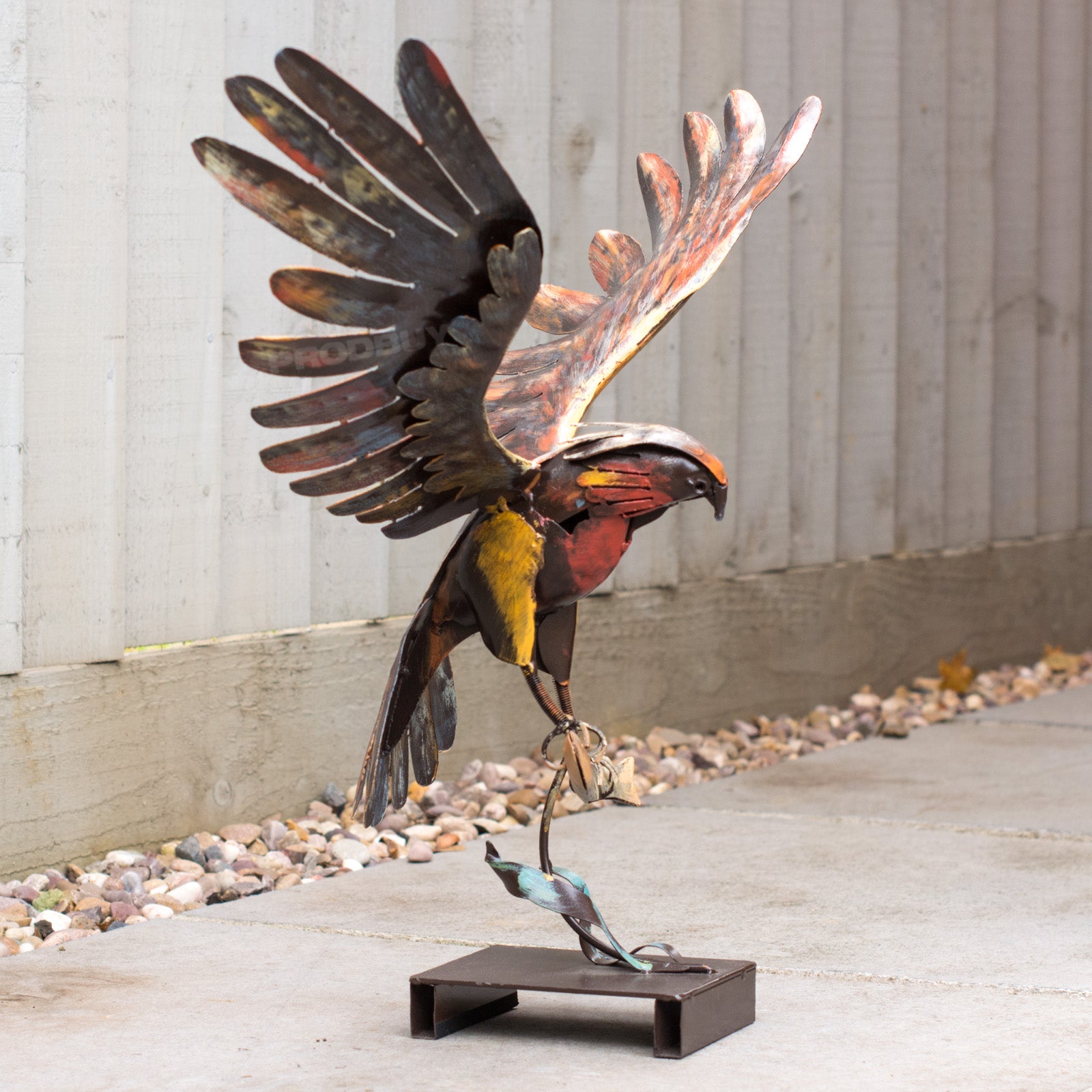 Attractive sculpture featuring a flying eagle that has caught a fish with faded red and orange colour and sturdy metal material. It comes with a flat base and is ideal for free-standing around the home and garden (although it's best to bring it inside to help protect against bad weather ie rain and snow). It is packaged in a thick cardboard box with polystyrene inside.