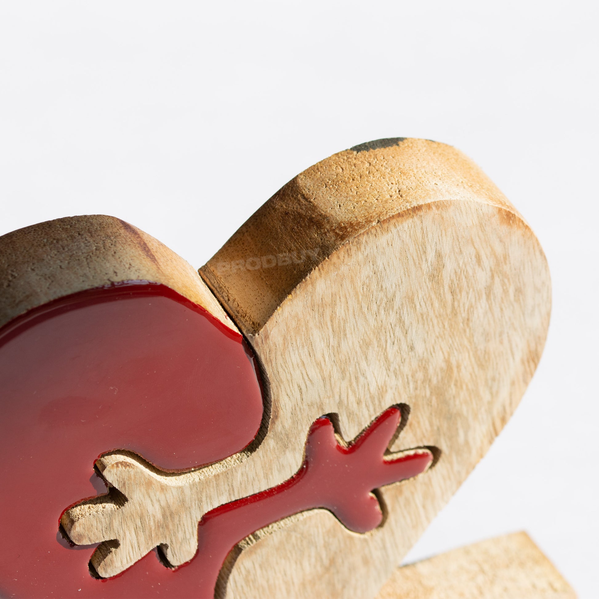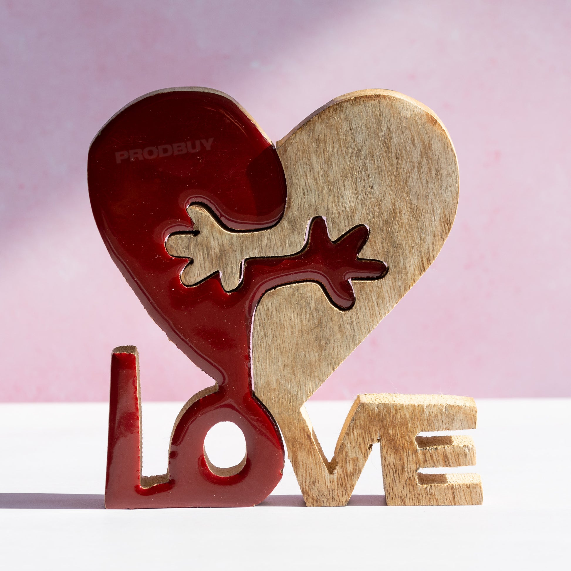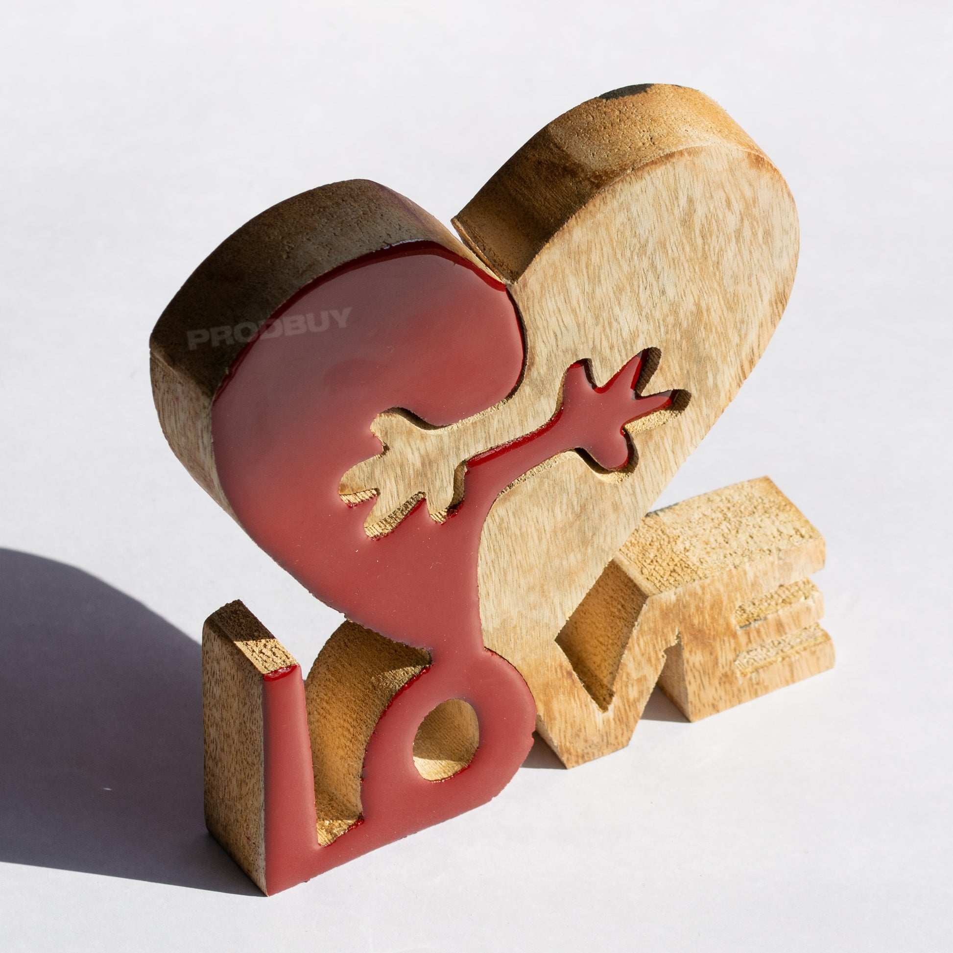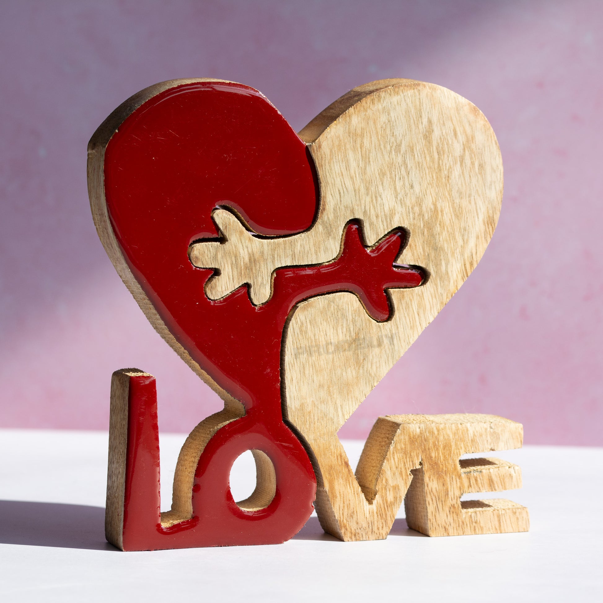 Free standing wooden decorative piece in the shape of a heart with interlocking hands and the word 'LOVE' below.