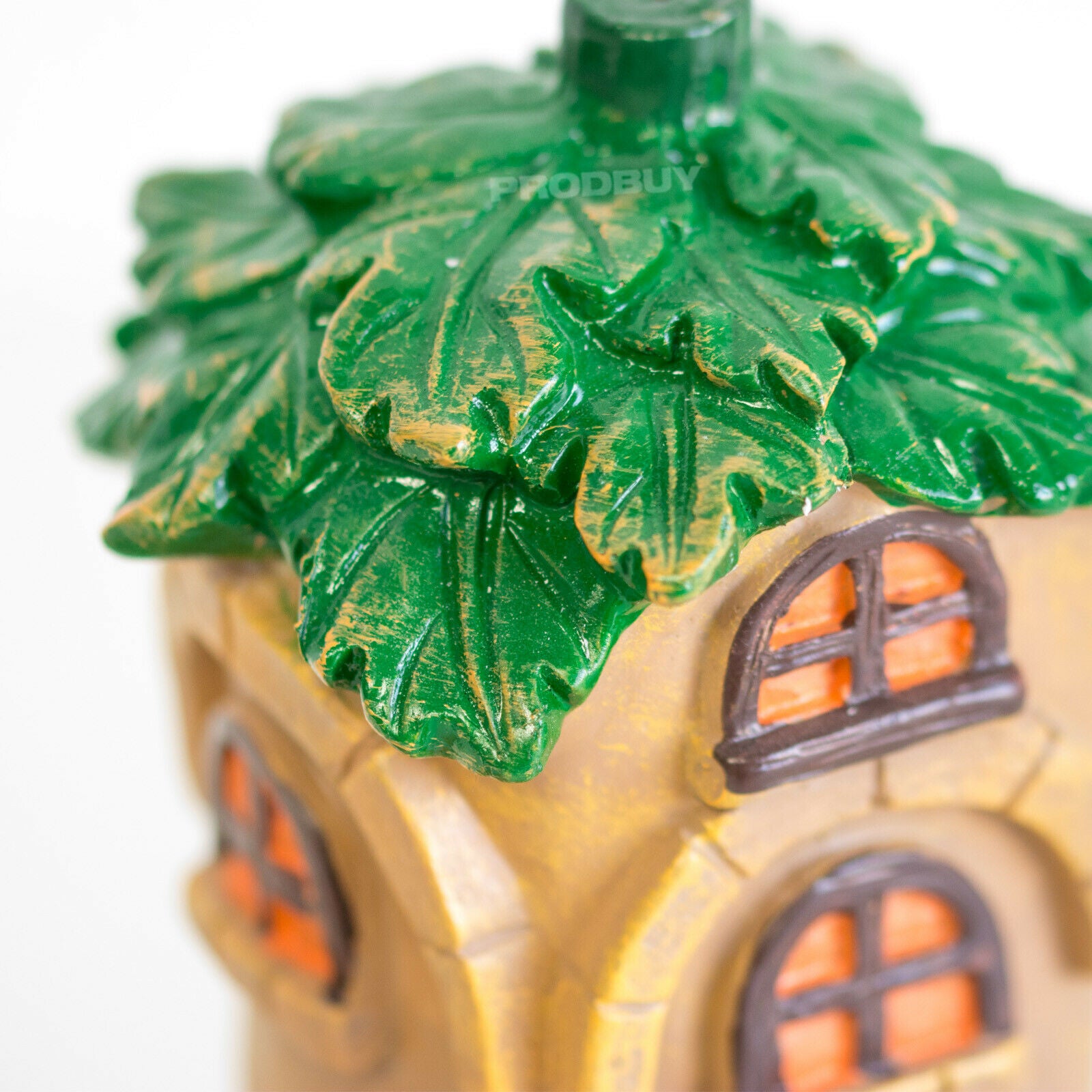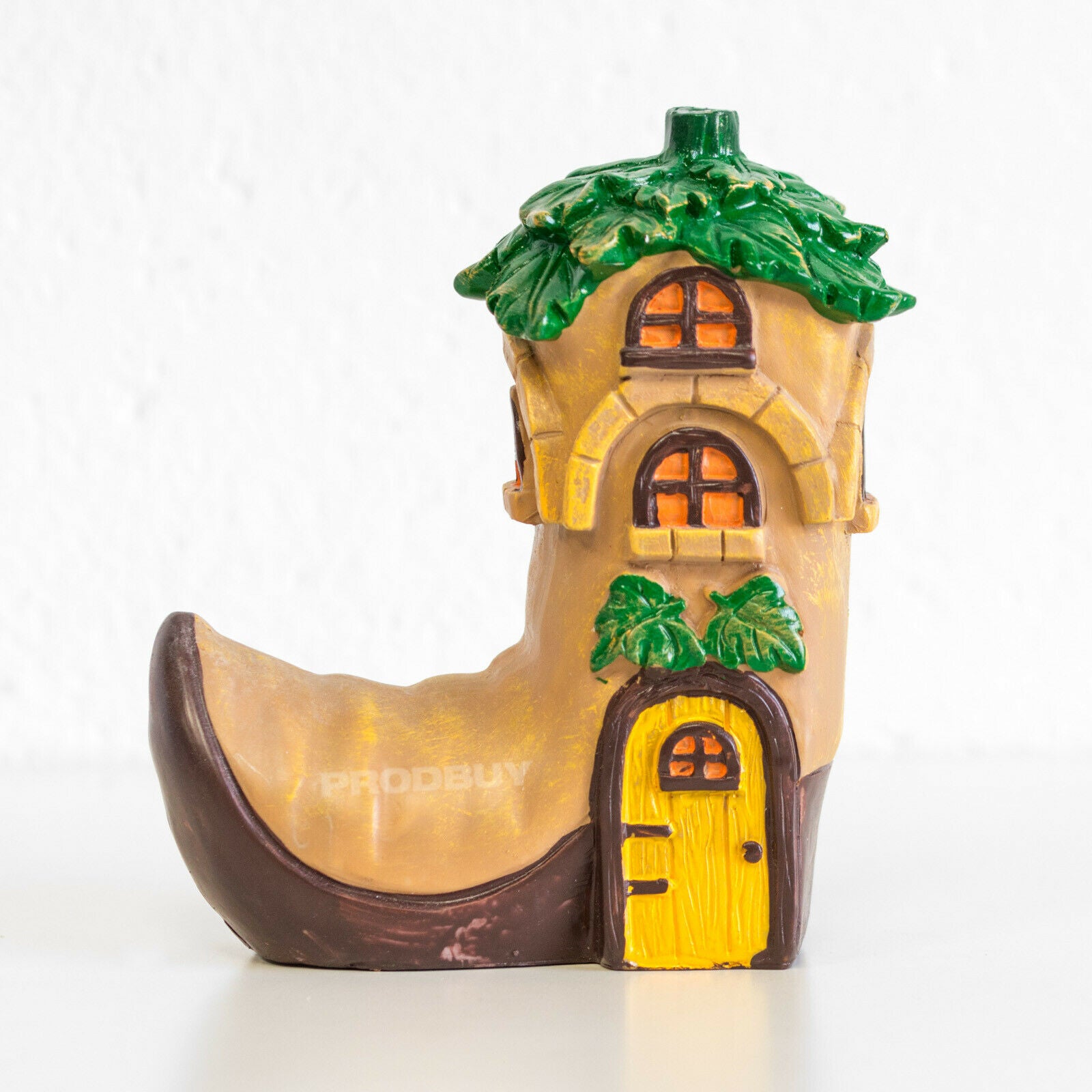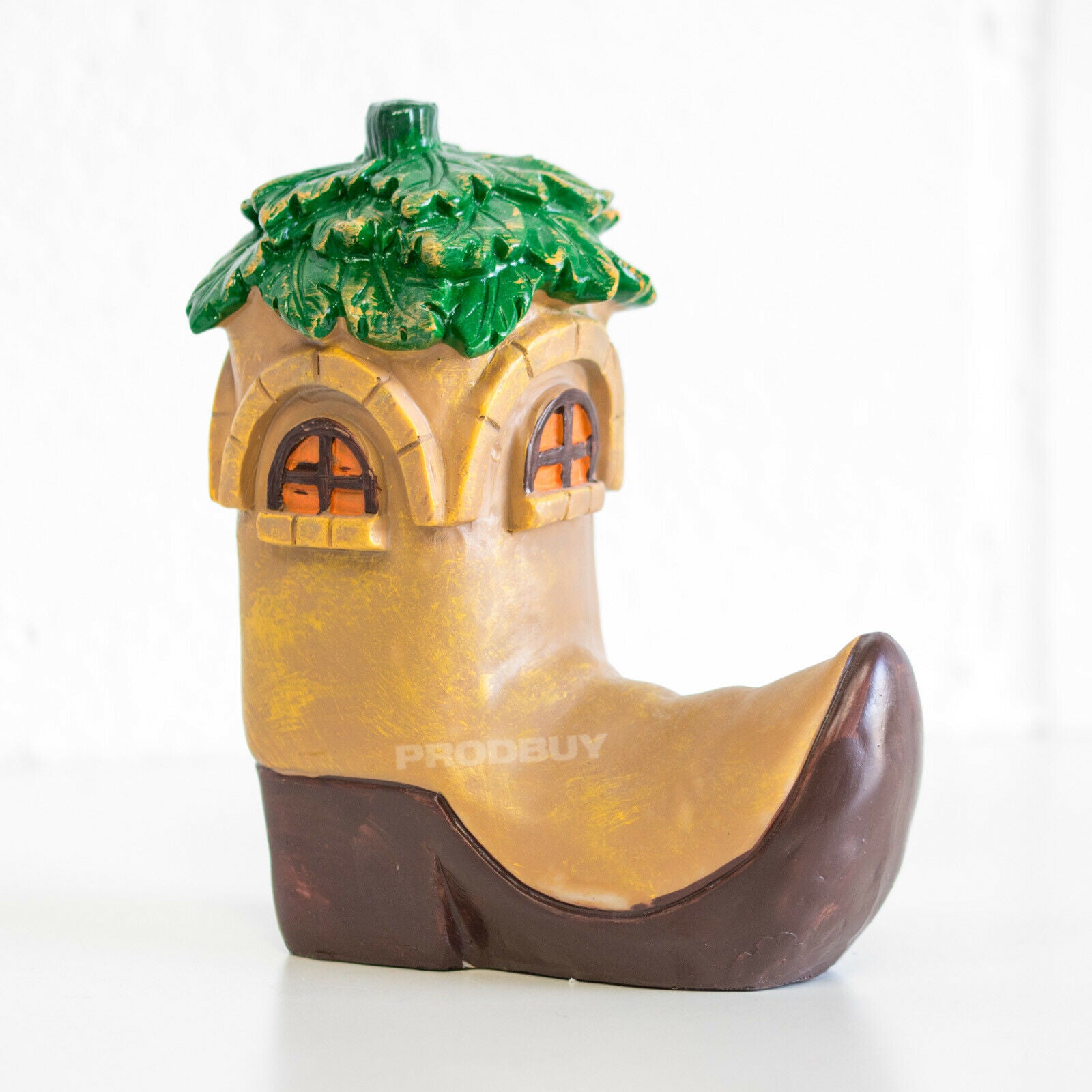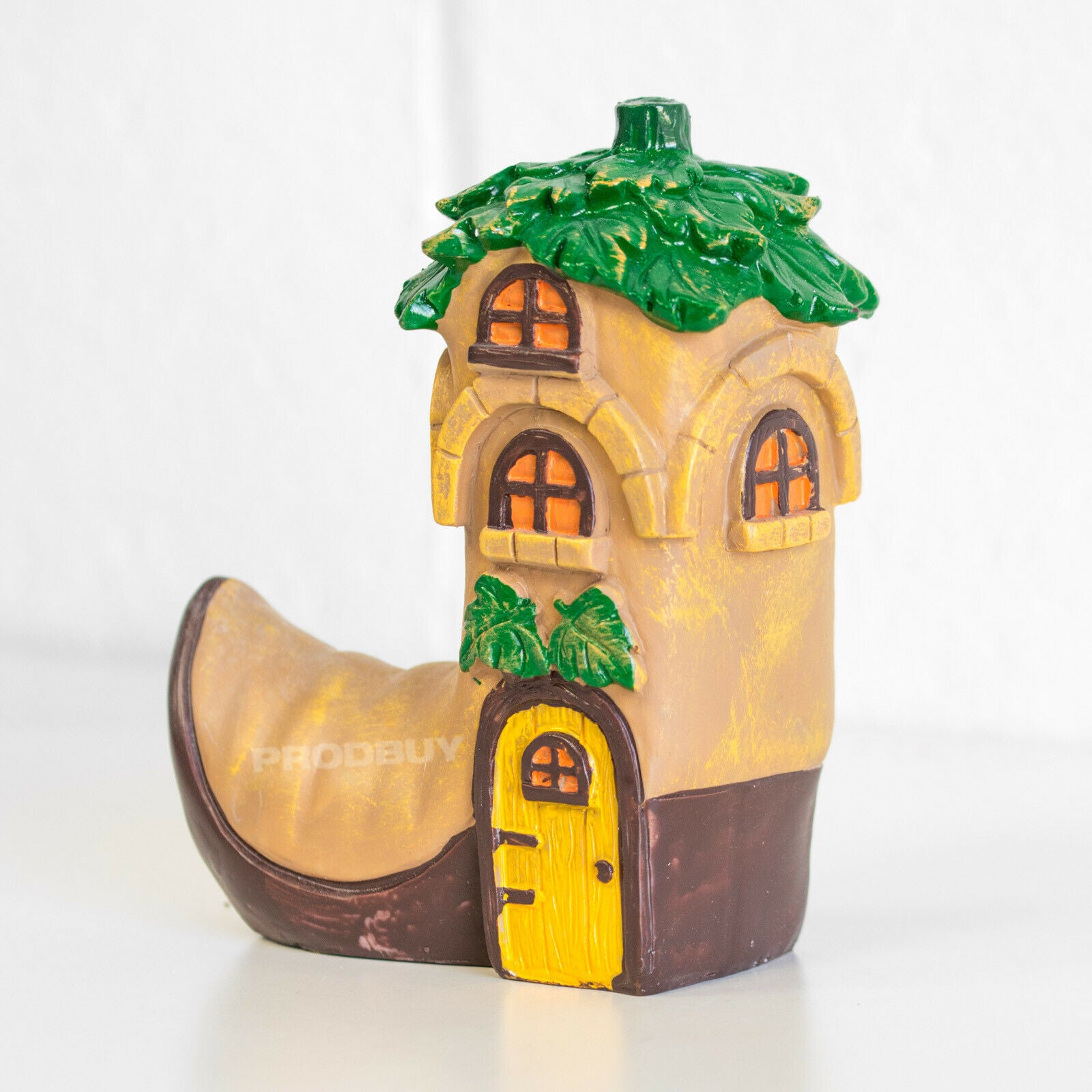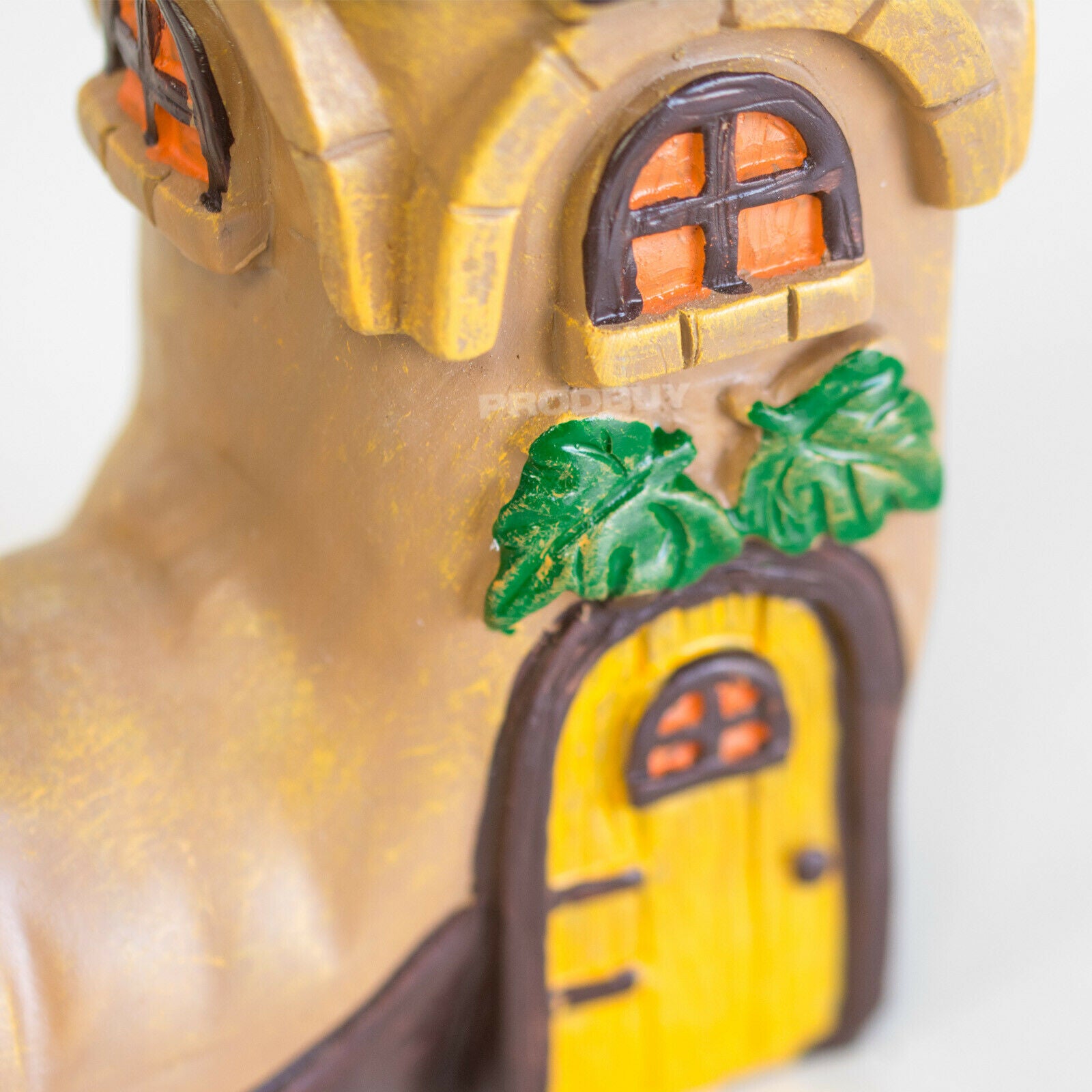 Decorative fairy garden house made from solid resin this particular house is shaped like a boot and decorated with leaves. The highly detailed design features windows with surrounds and a door at the base of the heel. Designed for outdoor decoration around the garden would make a lovely gift.