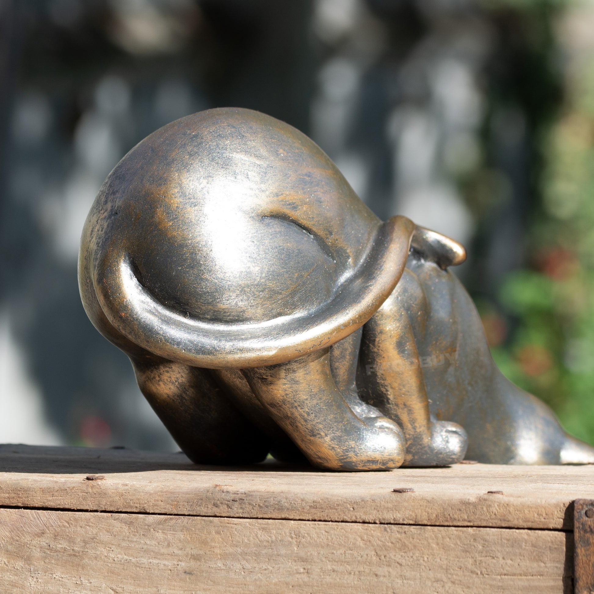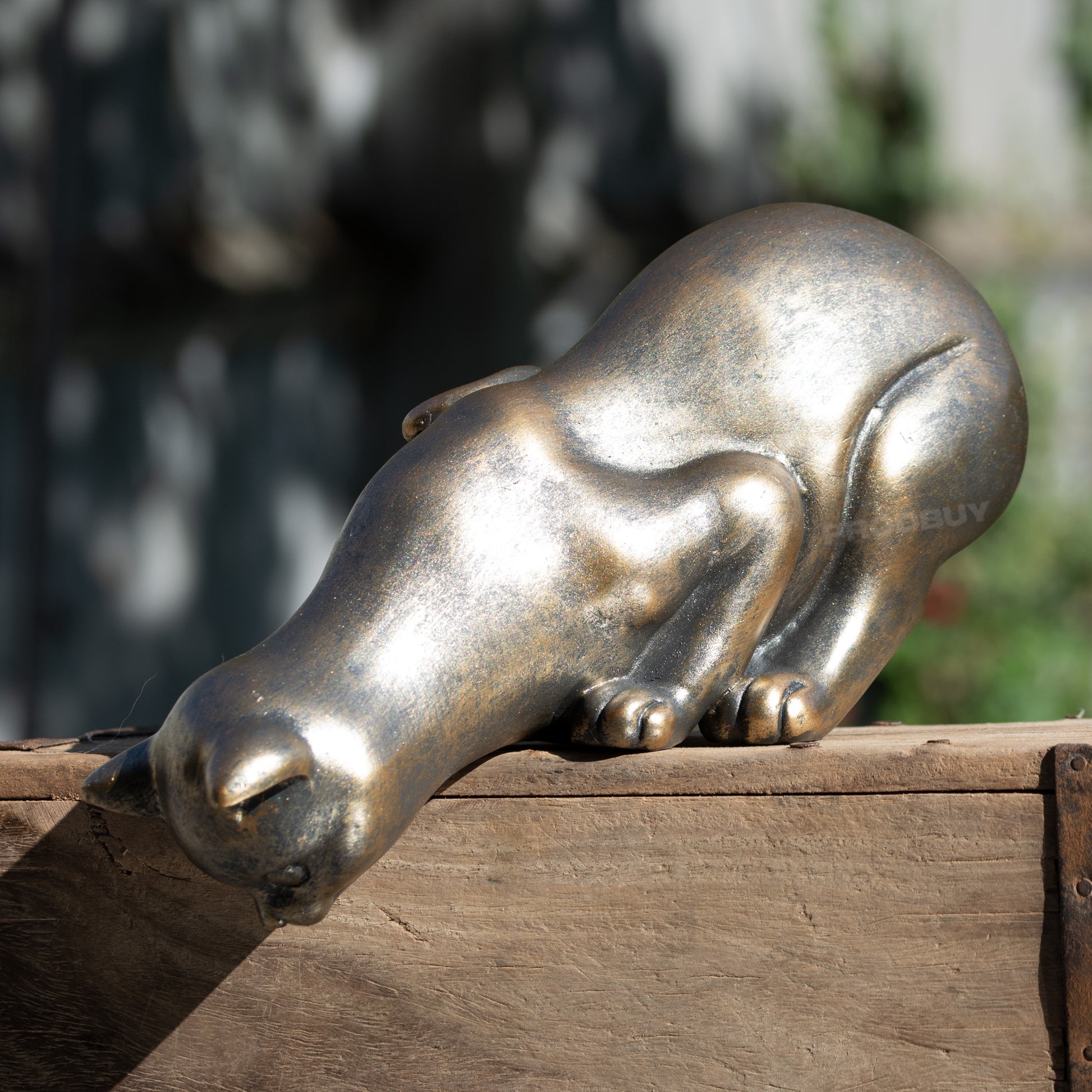 Free standing peering cat ornament made from resin. It has an antique style, aged gold appearance.