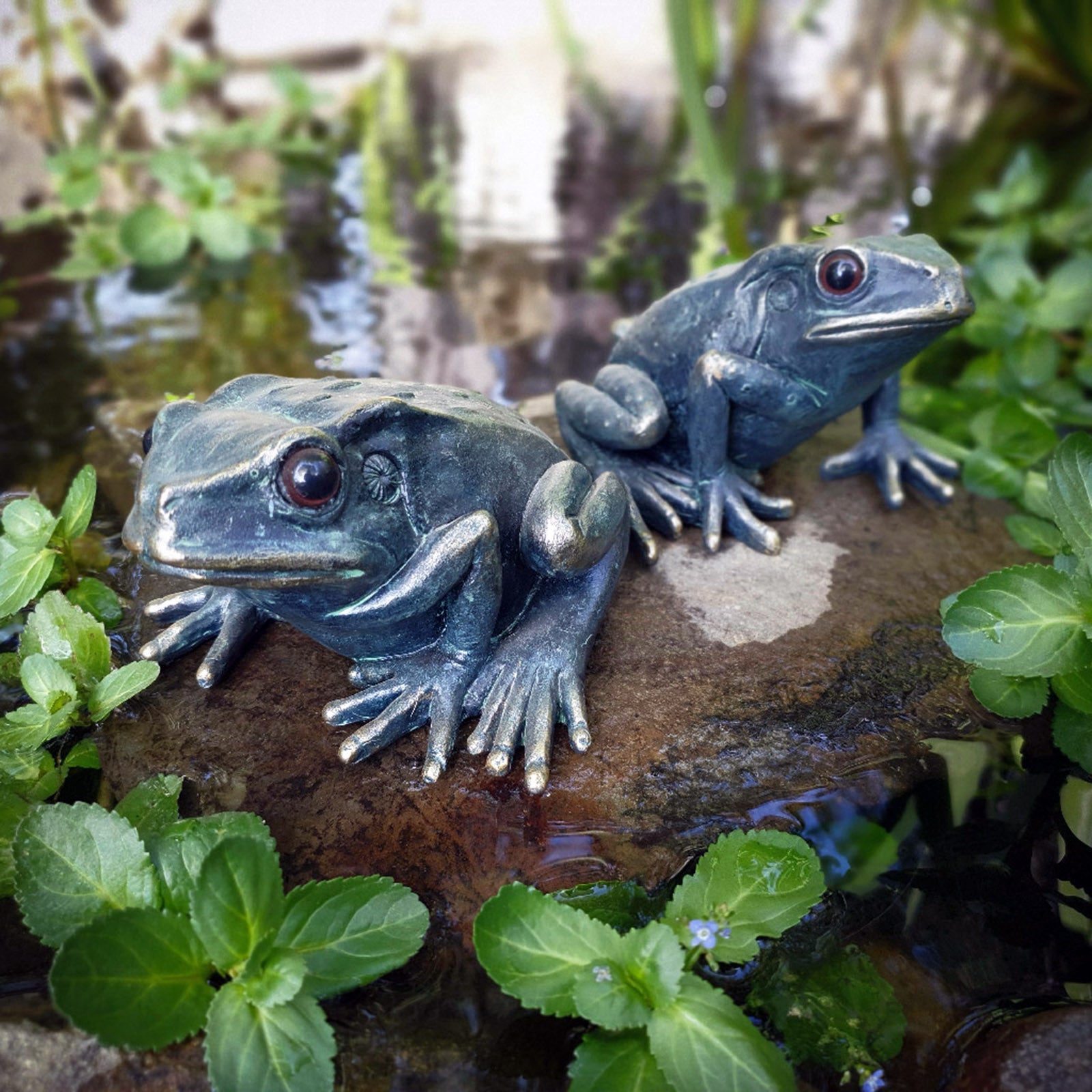 Set of two frog ornaments, made from resin with an antique bronze effect finish. They have a detailed, lifelike appearance with a high quality feel.
