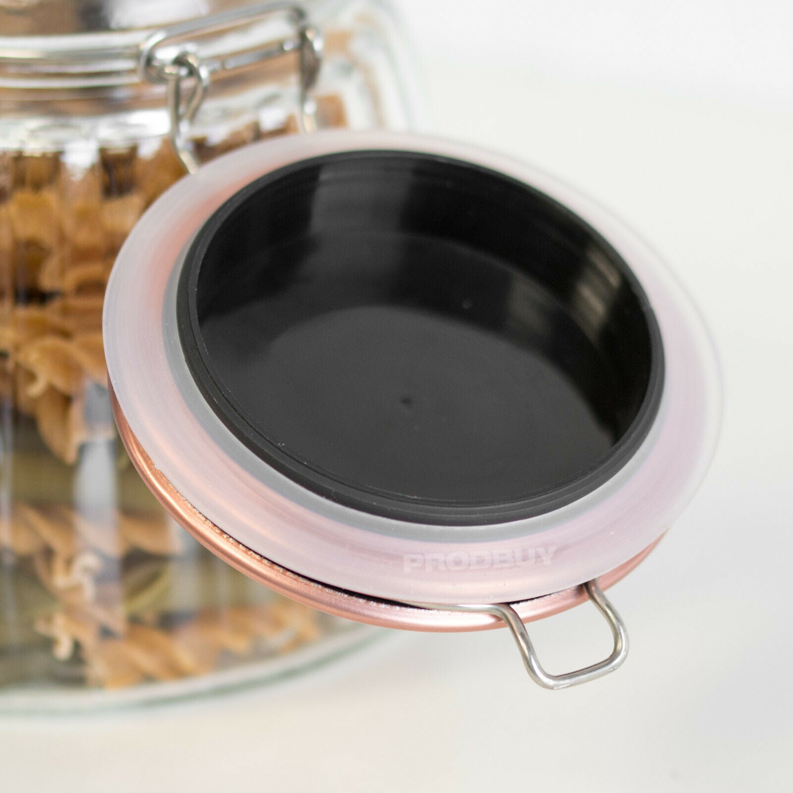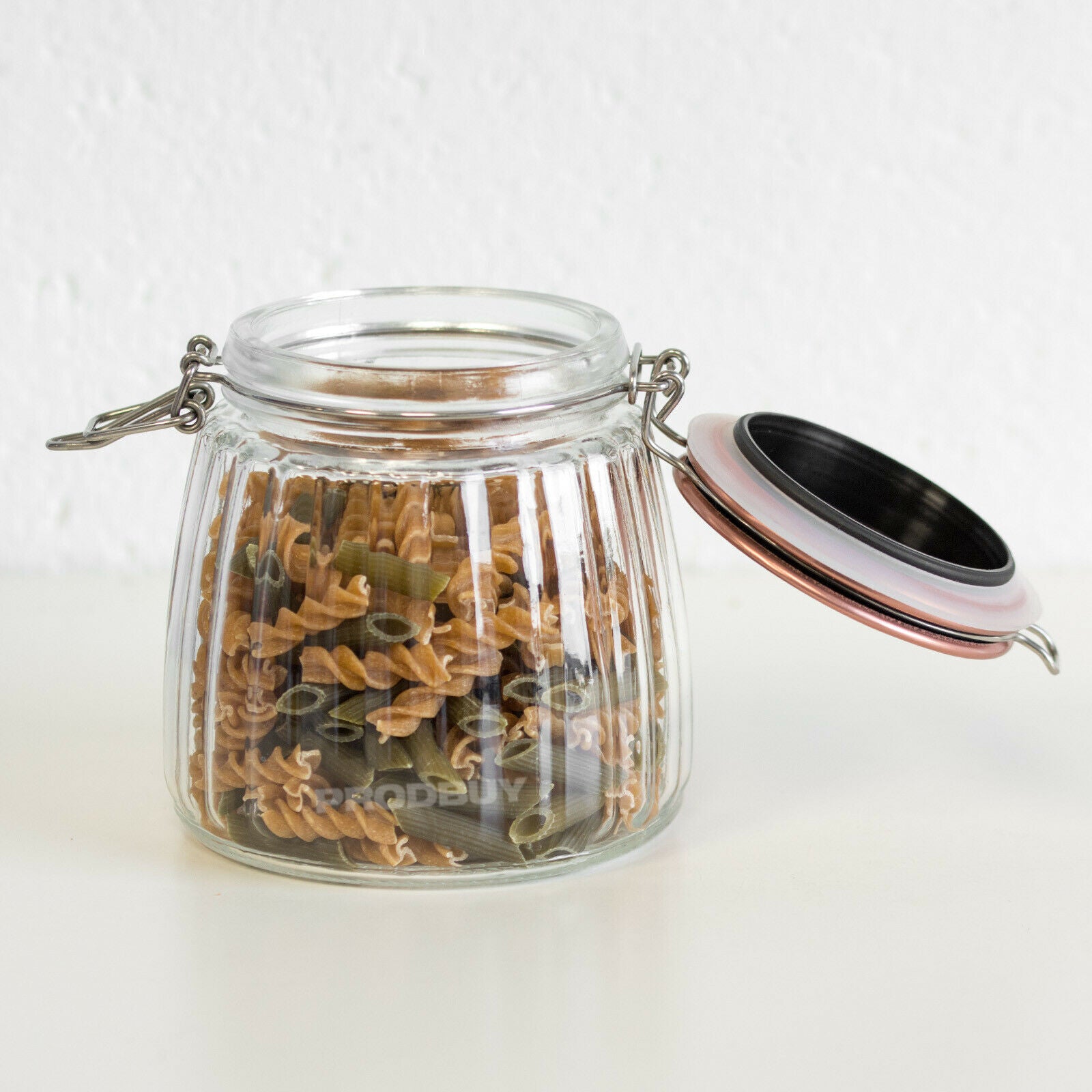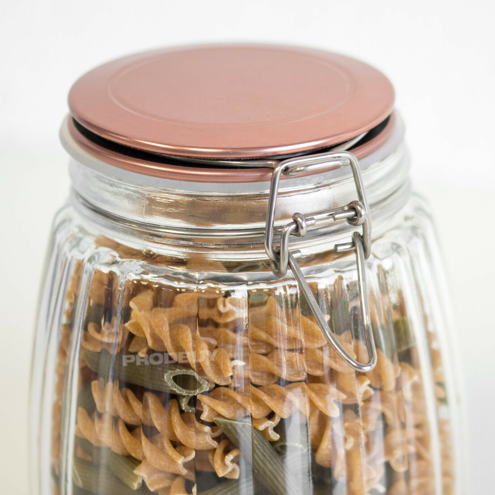 The vintage ribbed design makes it great for decorative storage on kitchen worktops, pantry shelves and kitchen cupboards. Great for organising your kitchen. This particular jar features a copper coloured lid that is made from plastic with a black interior.