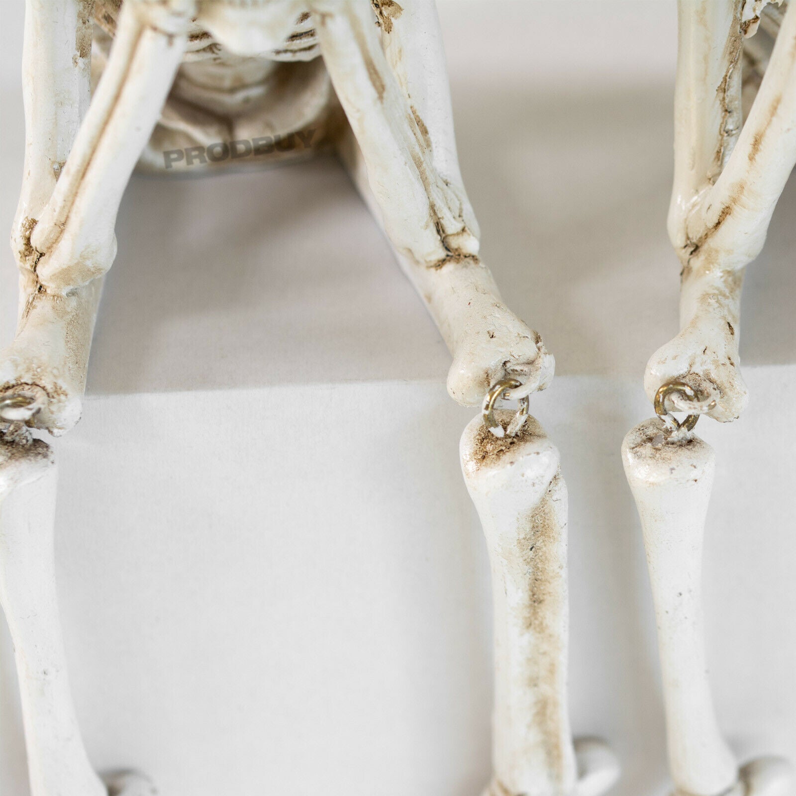 Set of three shelf sitting skeletons, made from resin. The knee bone is a hinge which allows the legs to dangle off the edge of a table, desk or shelf.