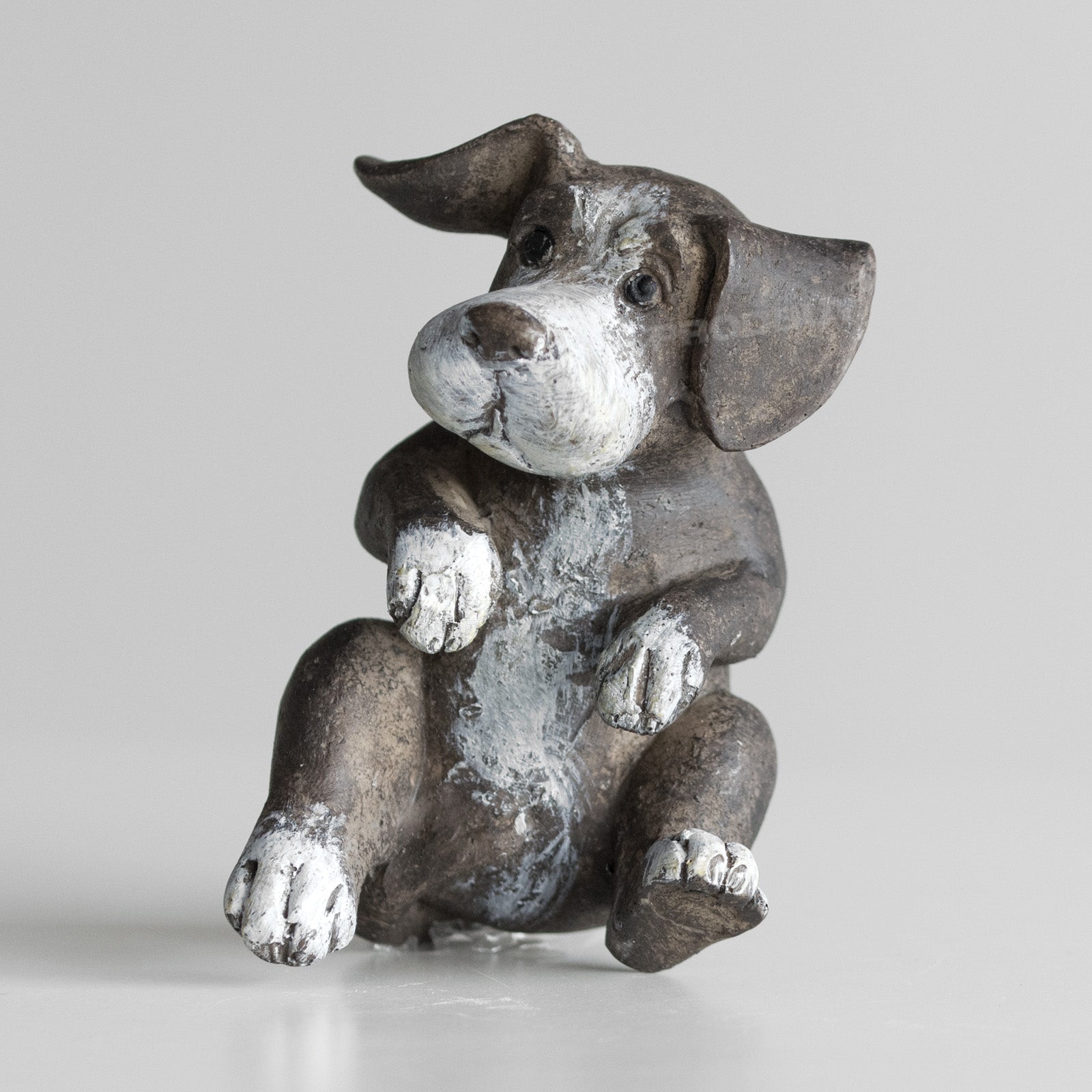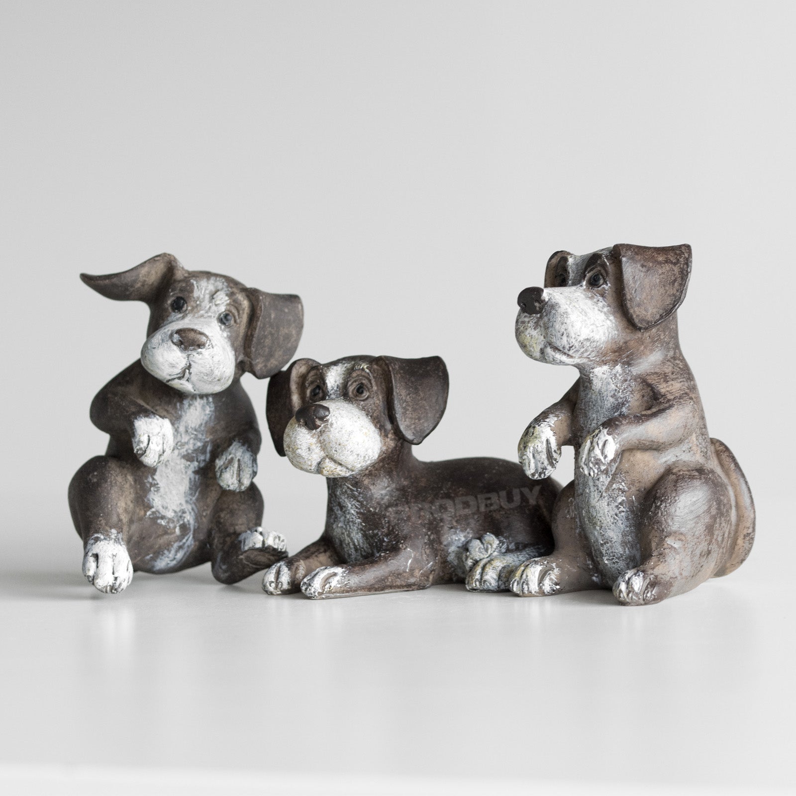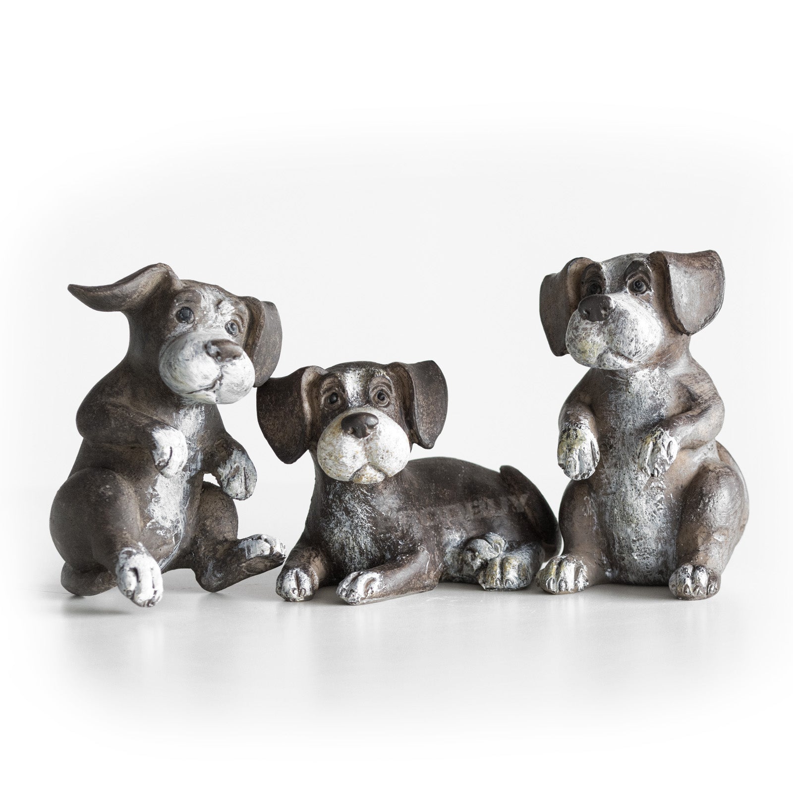 Set of three cute puppy ornaments suitable for decoration around the home on flat surfaces. Made from resin each piece is brown in colour with white shading and features a rustic imperfect finish. The set includes one of each of the designs pictured - listening puppy, sitting puppy and playing puppy.
