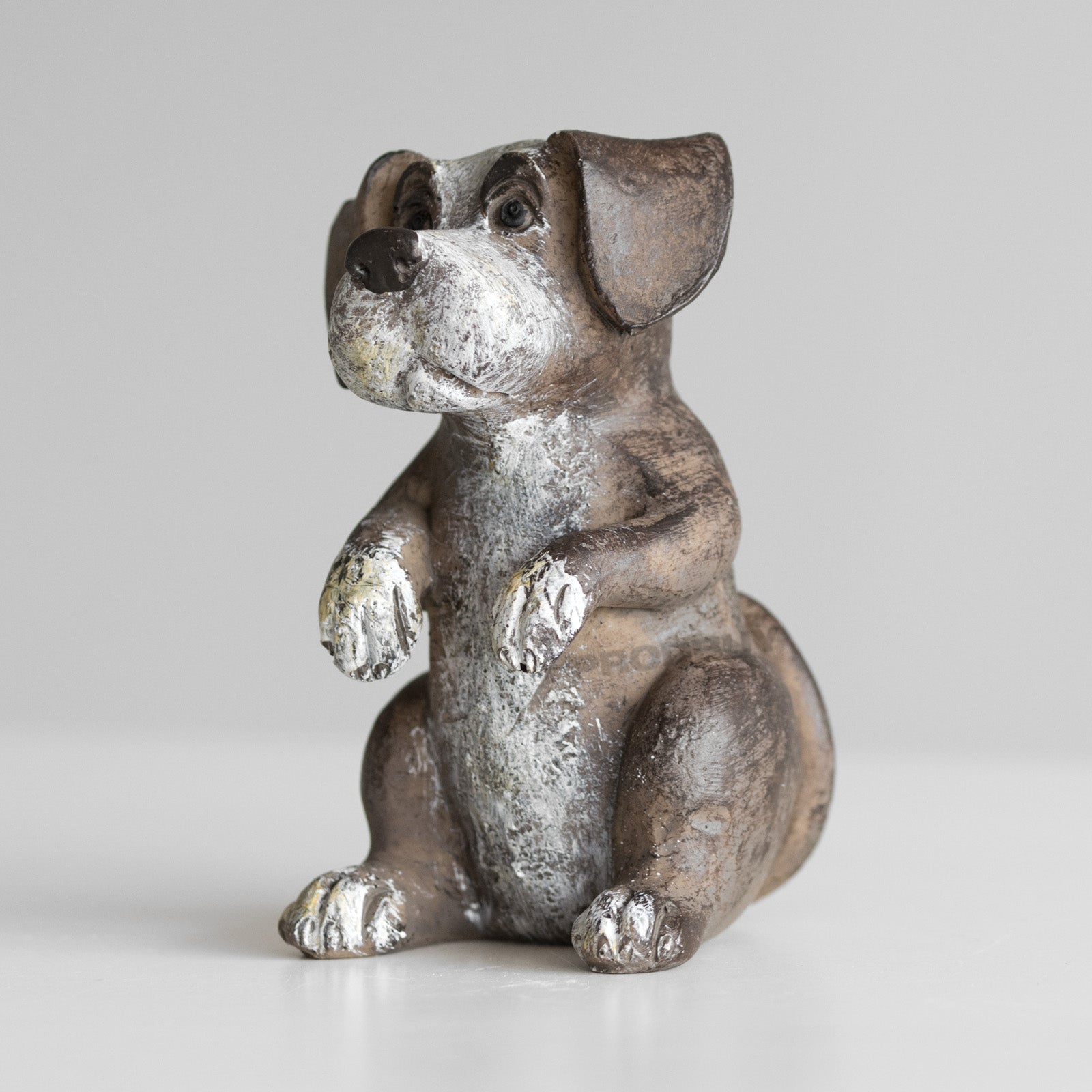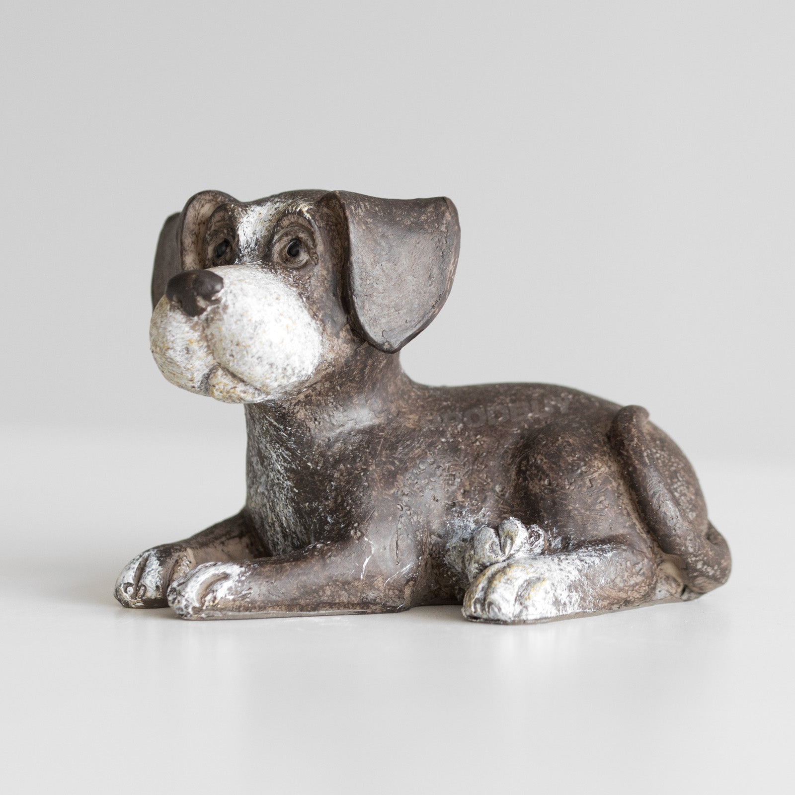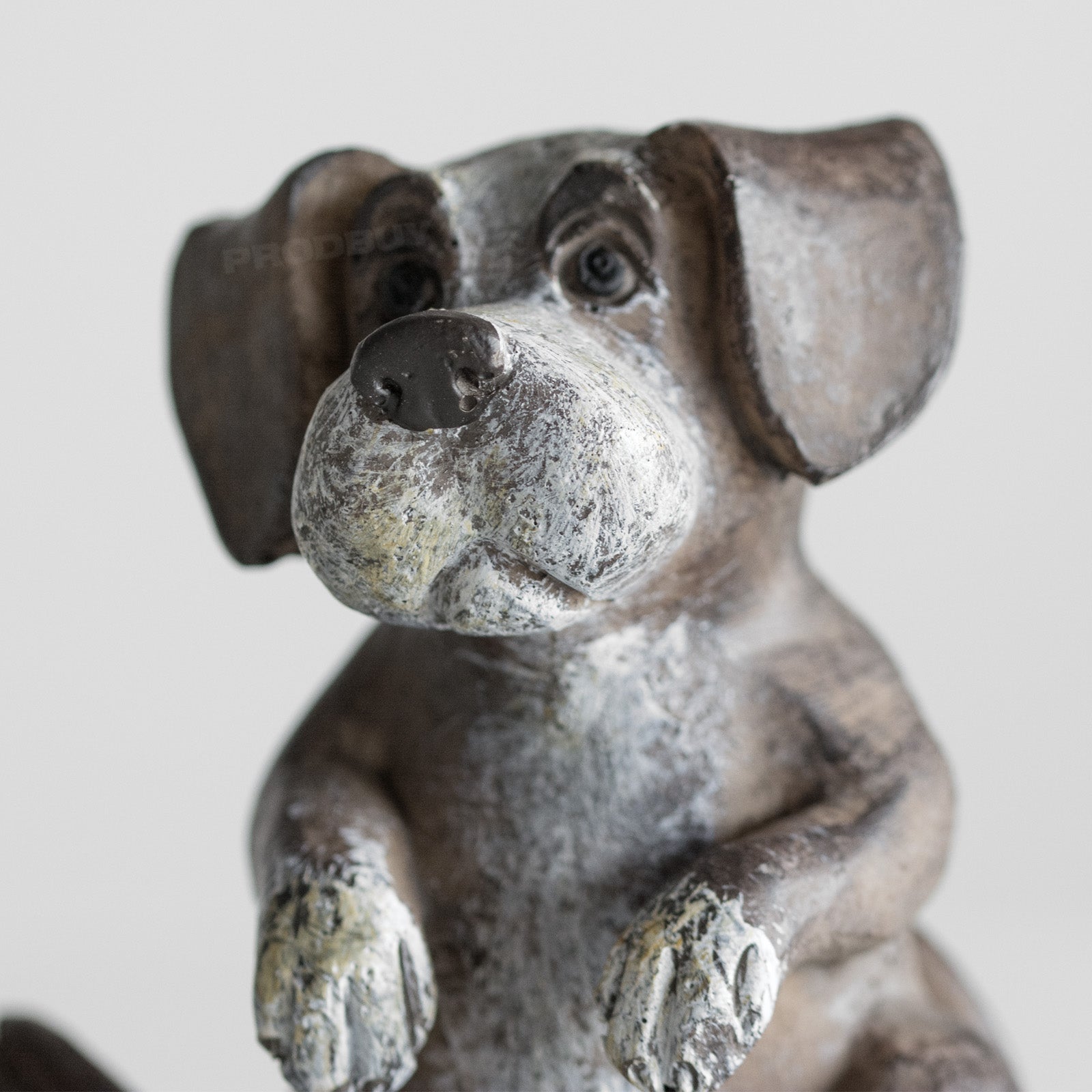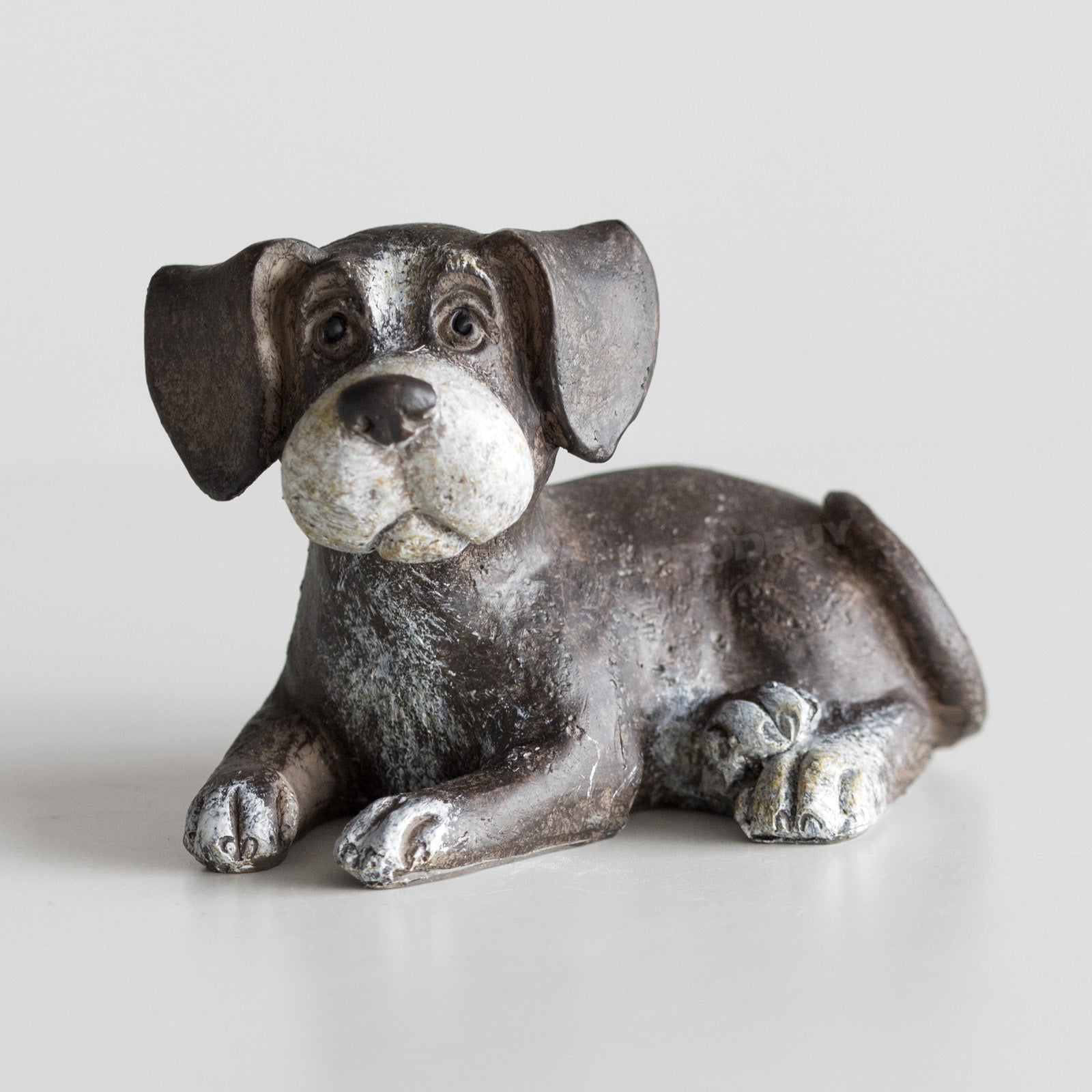 Set of three cute puppy ornaments suitable for decoration around the home on flat surfaces. Made from resin each piece is brown in colour with white shading and features a rustic imperfect finish. The set includes one of each of the designs pictured - listening puppy, sitting puppy and playing puppy.