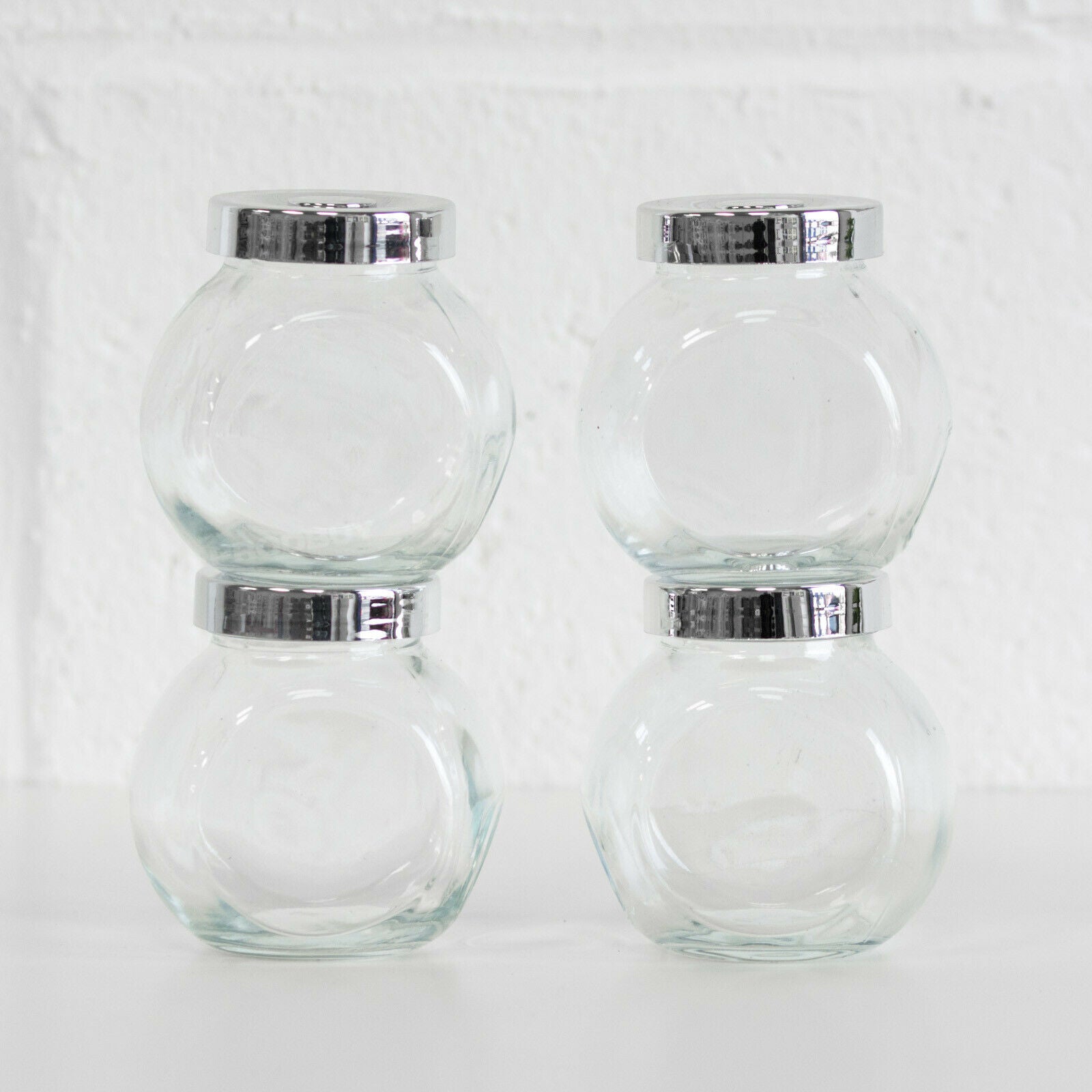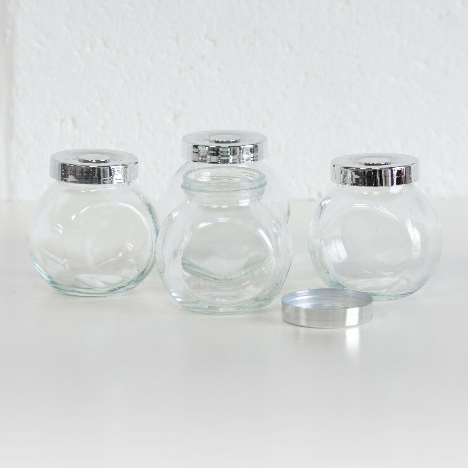 Set of small transparent glass storage jars with tight fitting screw on plastic lids that have a chrome effect finish. Suitable for storing herbs and spices around the kitchen. Each jar has a capacity of one hundred and seventy five millilitres. These jars have two flat edges allowing them to be stored and displayed upright or at an angle. Hand wash only (not dishwasher safe).