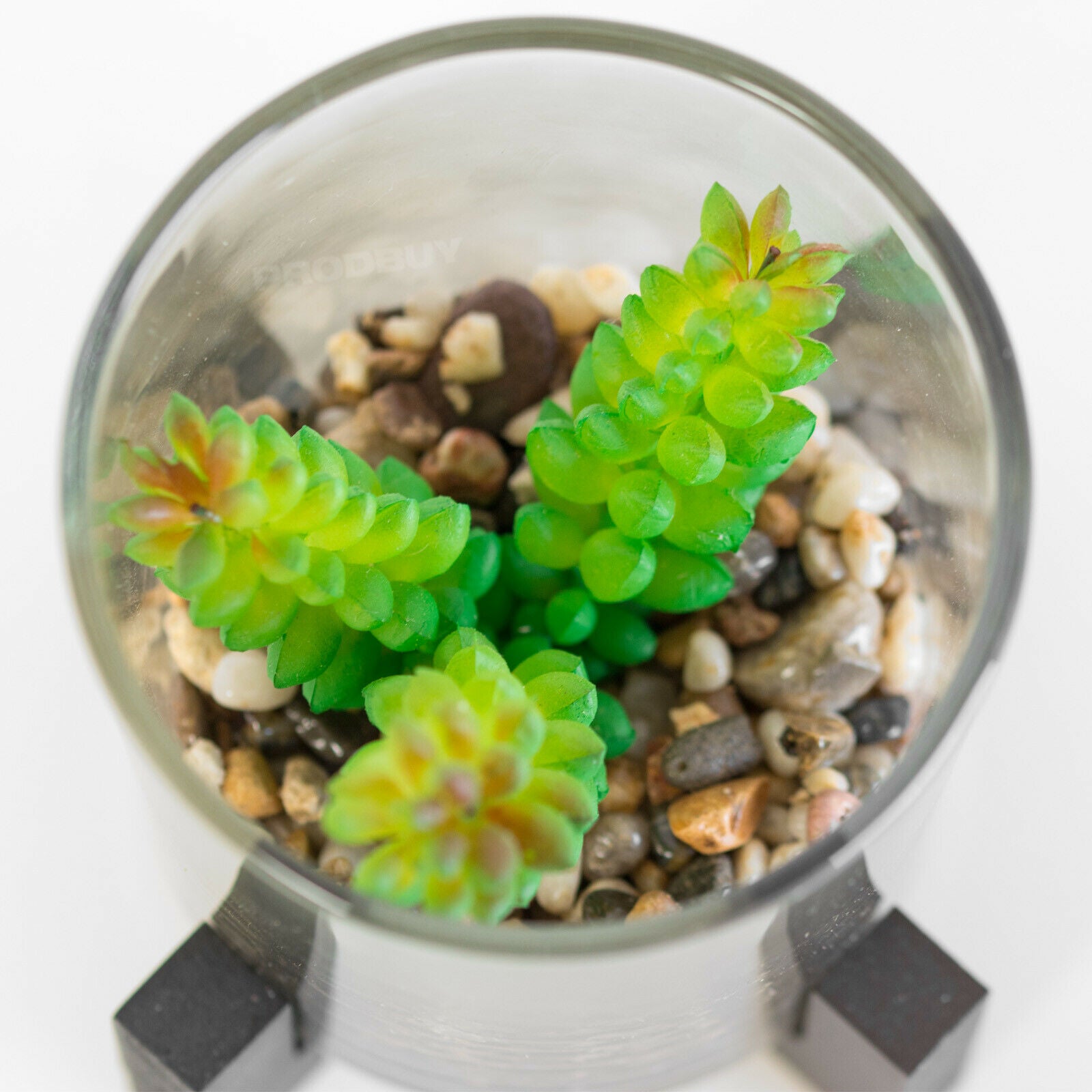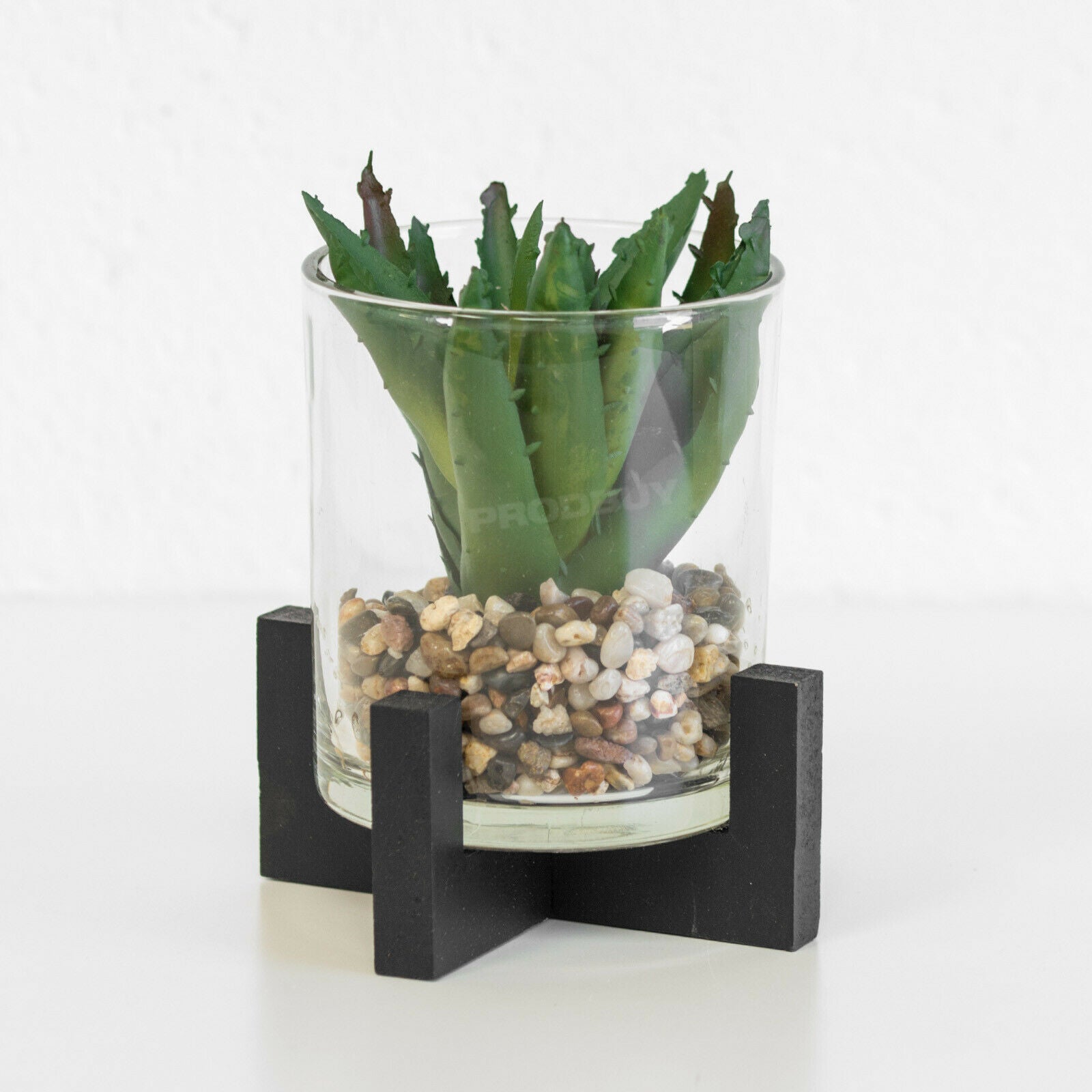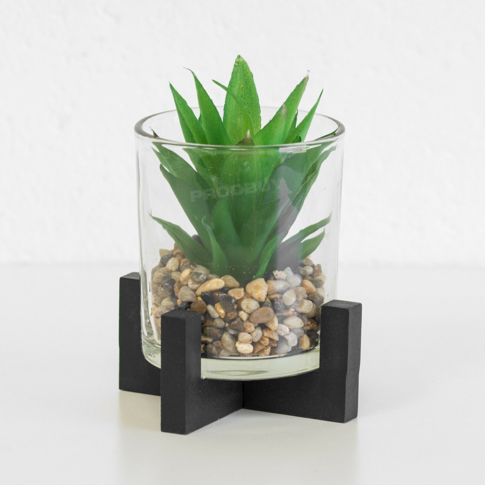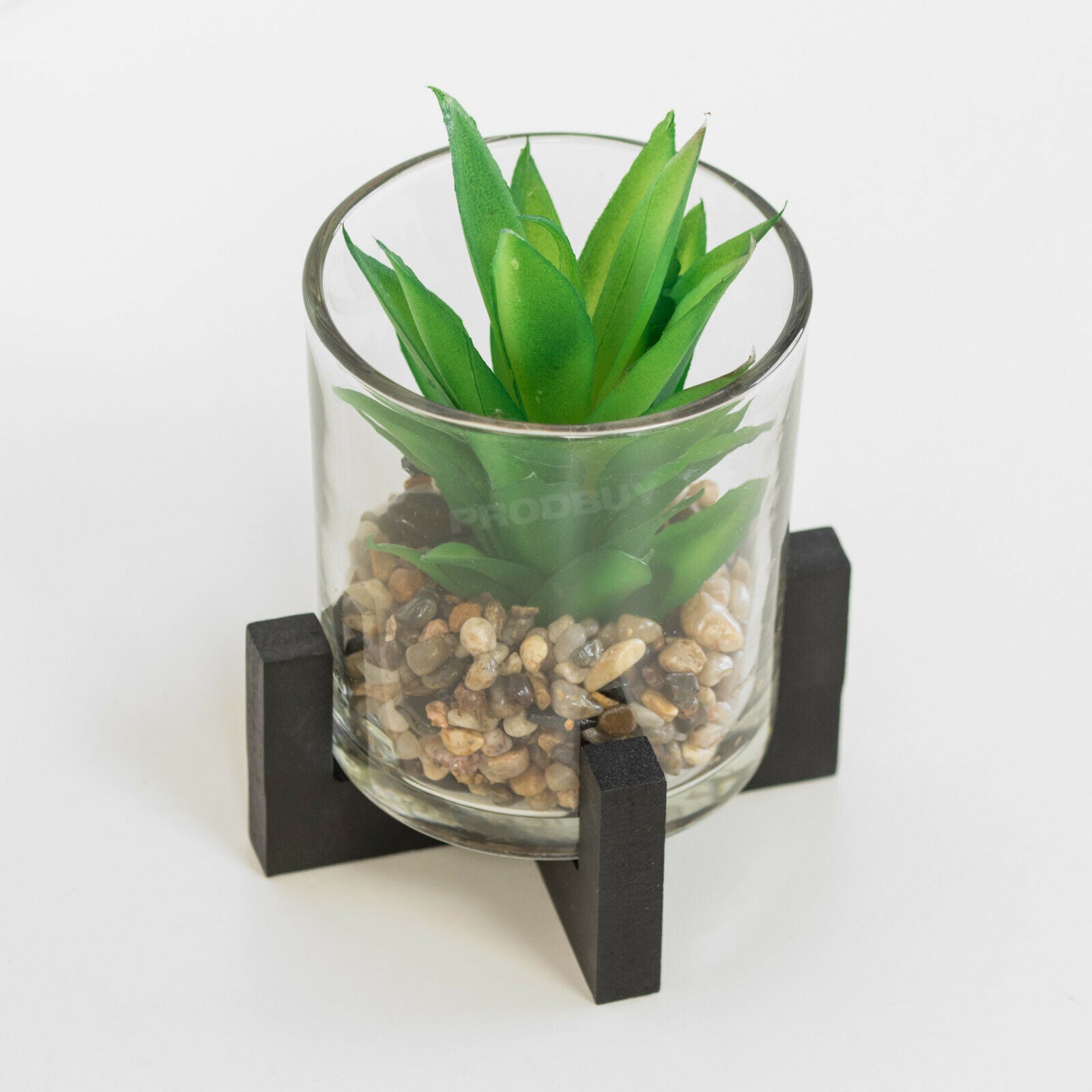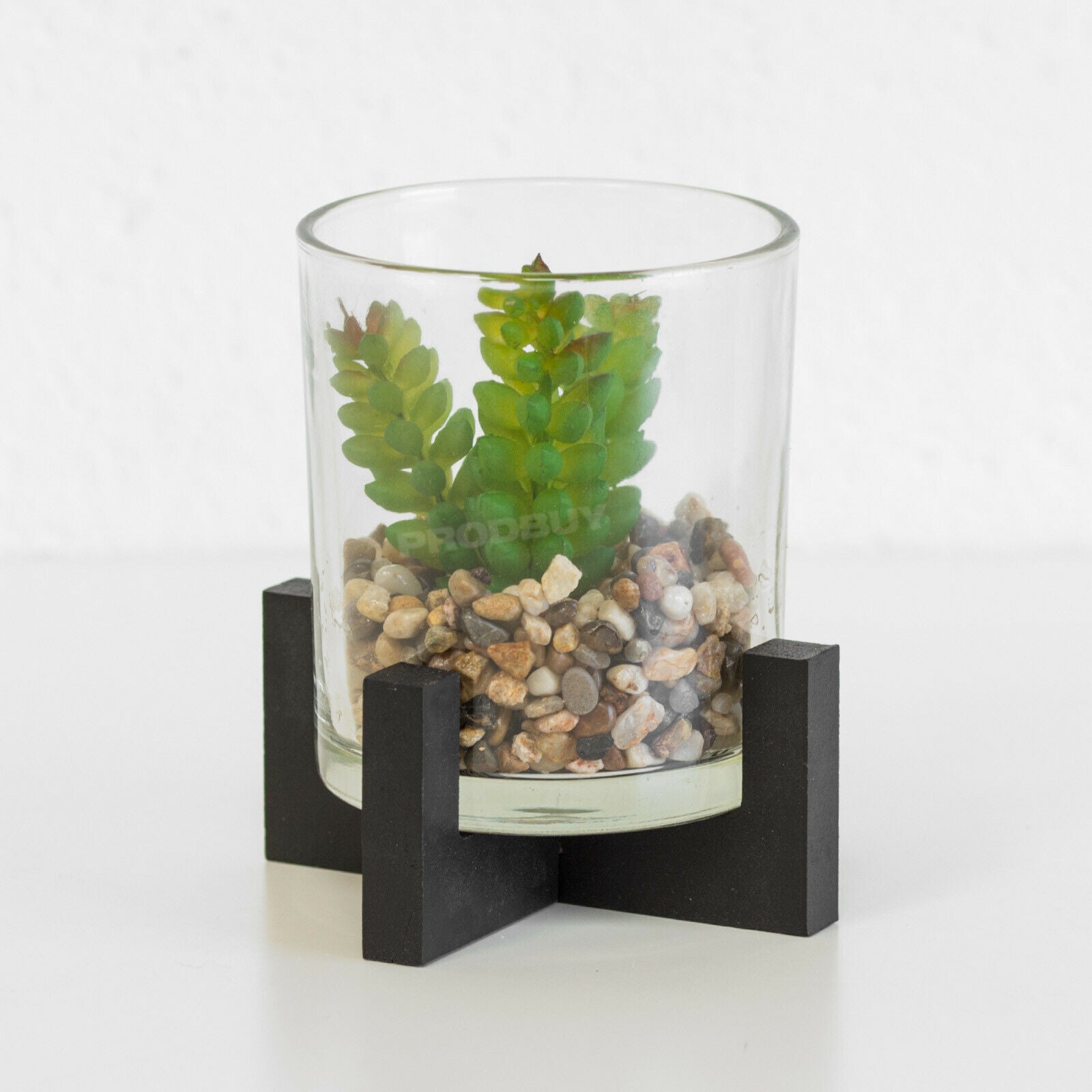 Attractive small sized artificial succulent jar with black MDF wooden stand (the stand and jar are glued together as one piece). There is a choice of three similar designs available. The interiors are made up from PVC plastic for the plants and stone for the pebbles (also glued together as one whole piece so none of them should fall out). Each one would be ideal to help brighten up the home and office and they are suitable for free-standing on a flat surface.