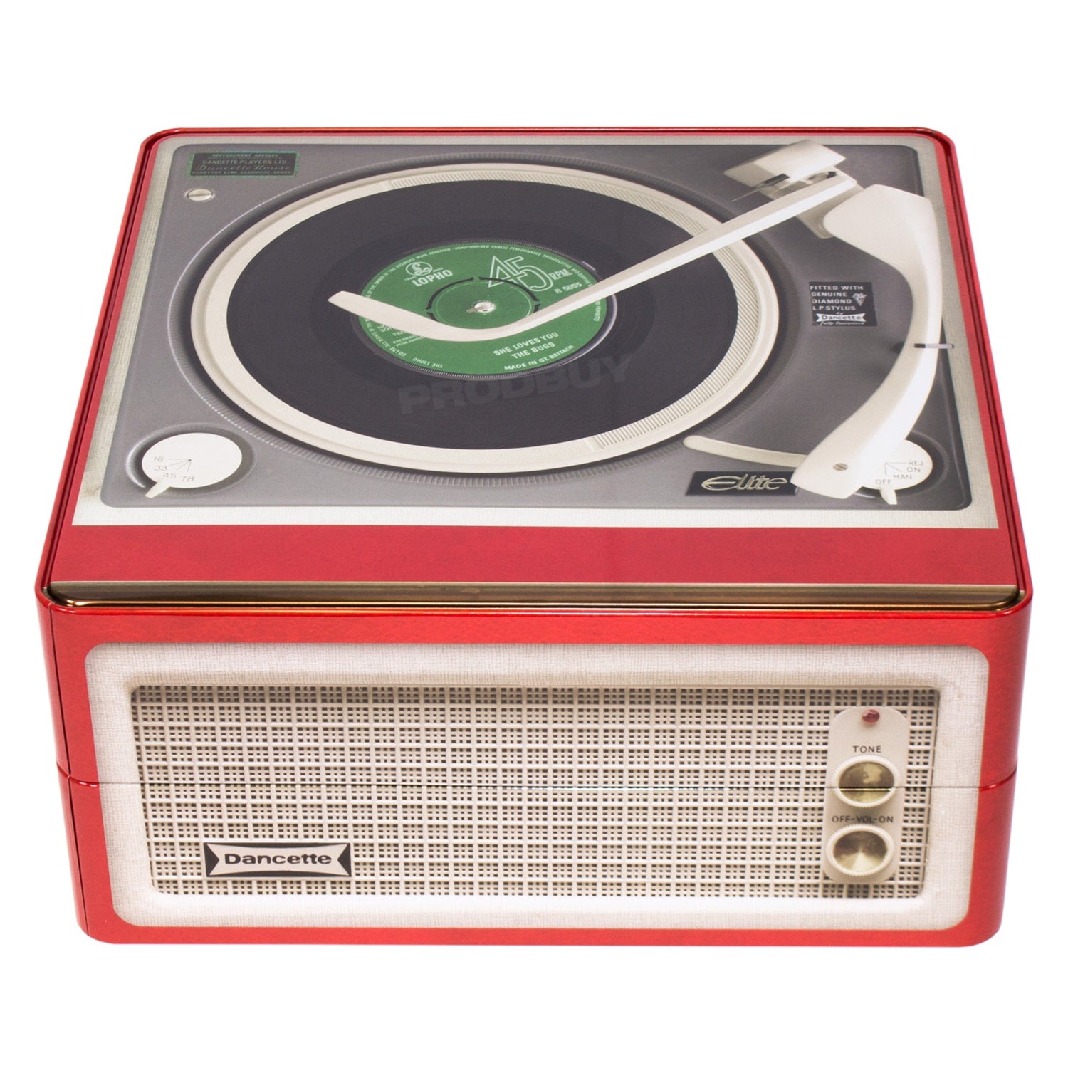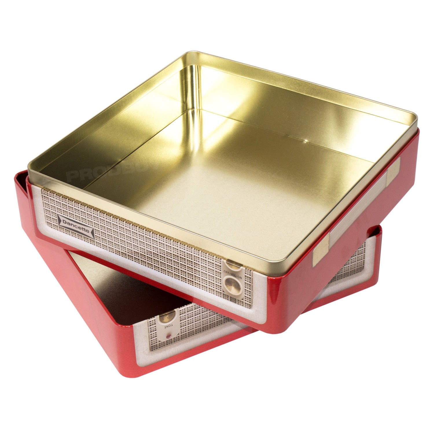 Large cake storage tin featuring a retro record player design. The tin is square in shape and features mainly a red colour scheme on all four sides with the record player design on top. Suitable for storing a single cake, cupcakes or other treats such as biscuits.