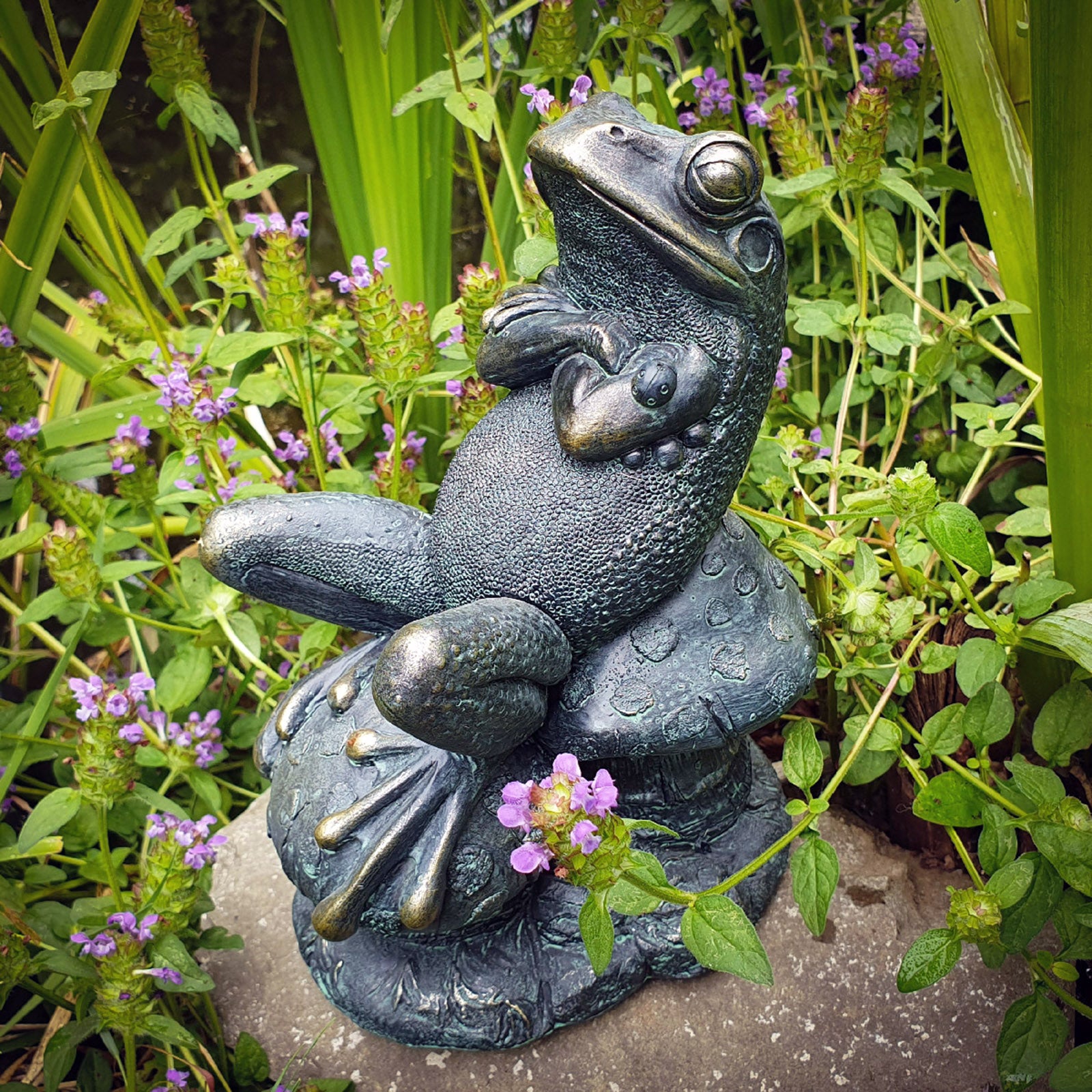 Toad on toadstools ornament, made from resin. It has a highly detailed with a variety of textures. He's leaning back on the toadstools with his arms folded. He looks very content, leaning back, observing the scene before him.