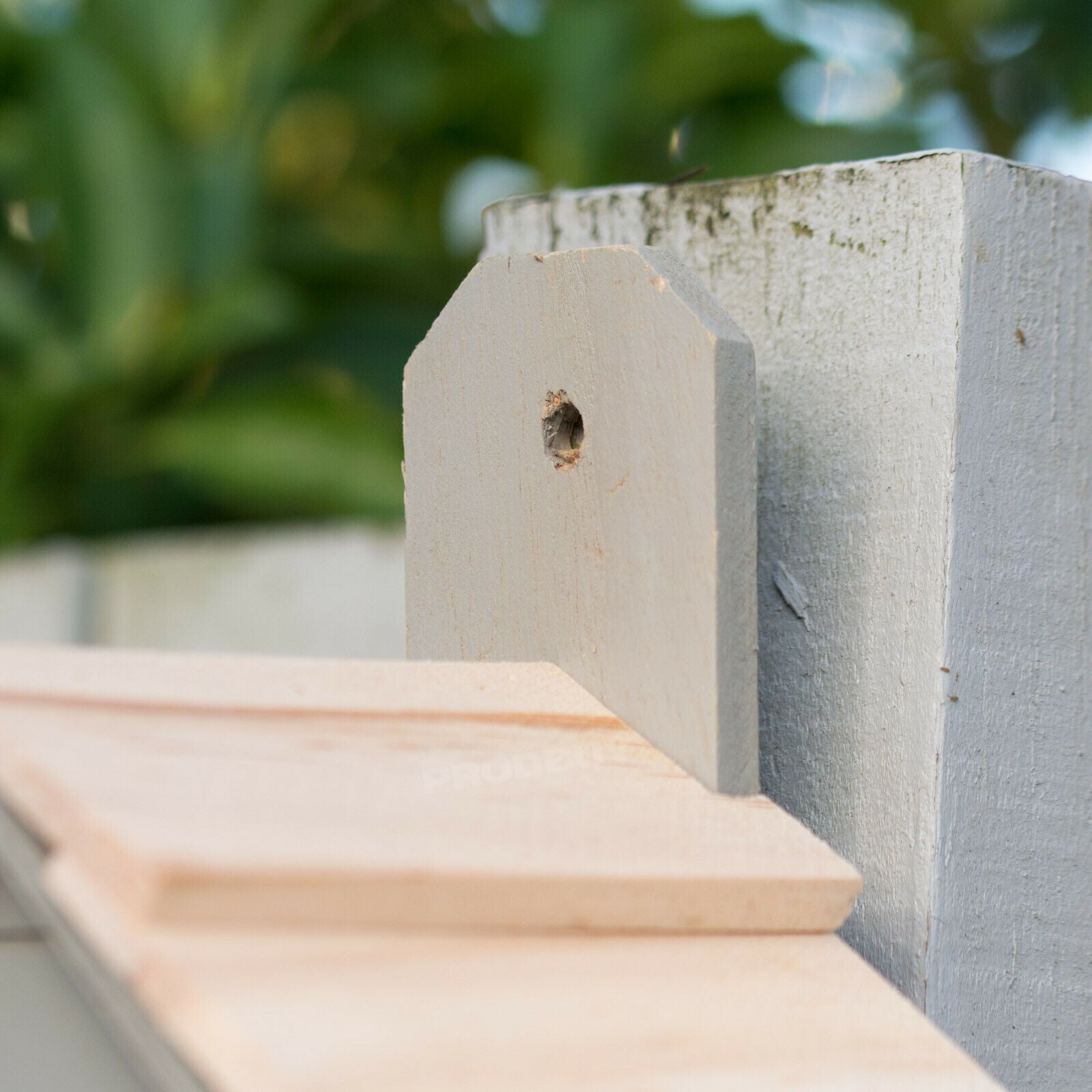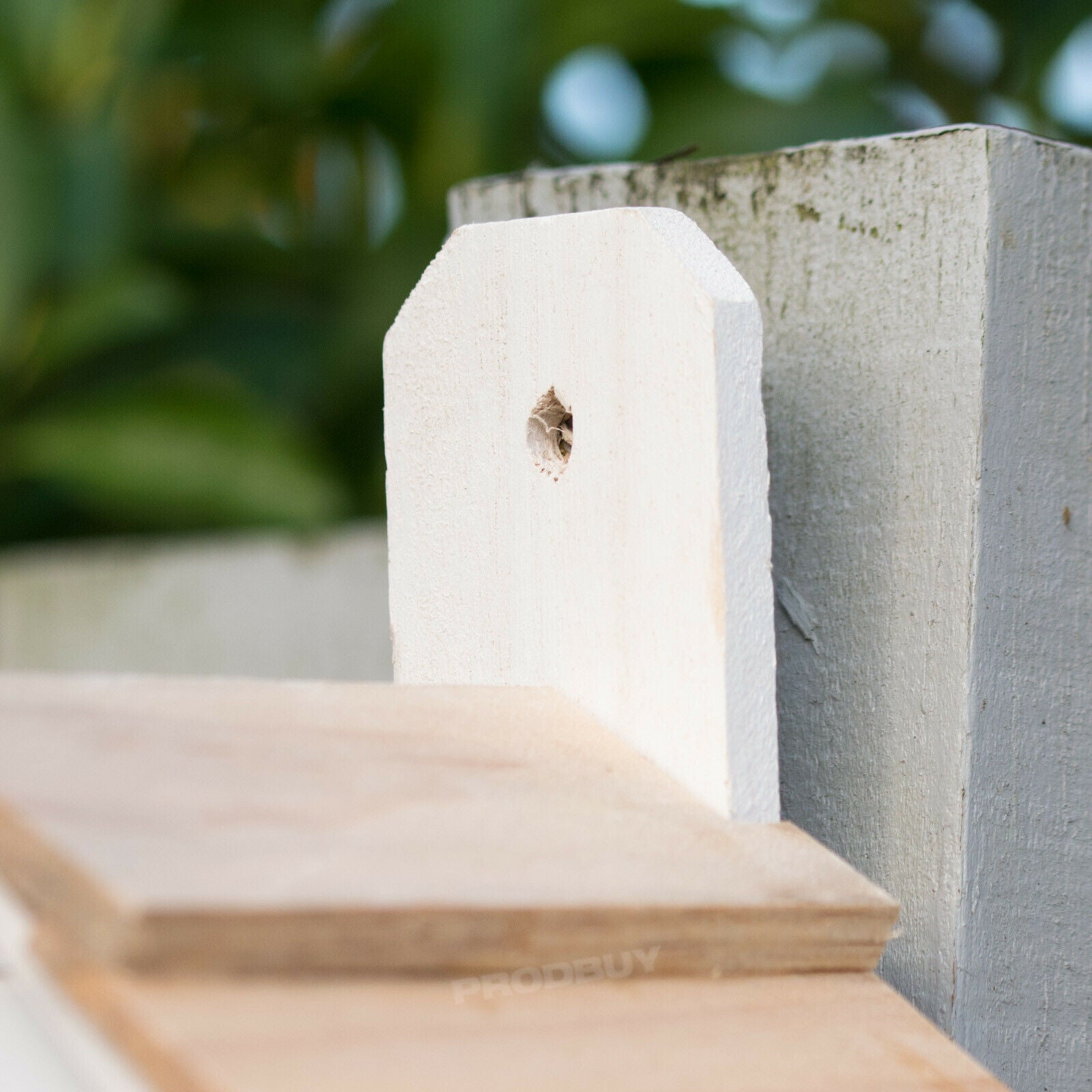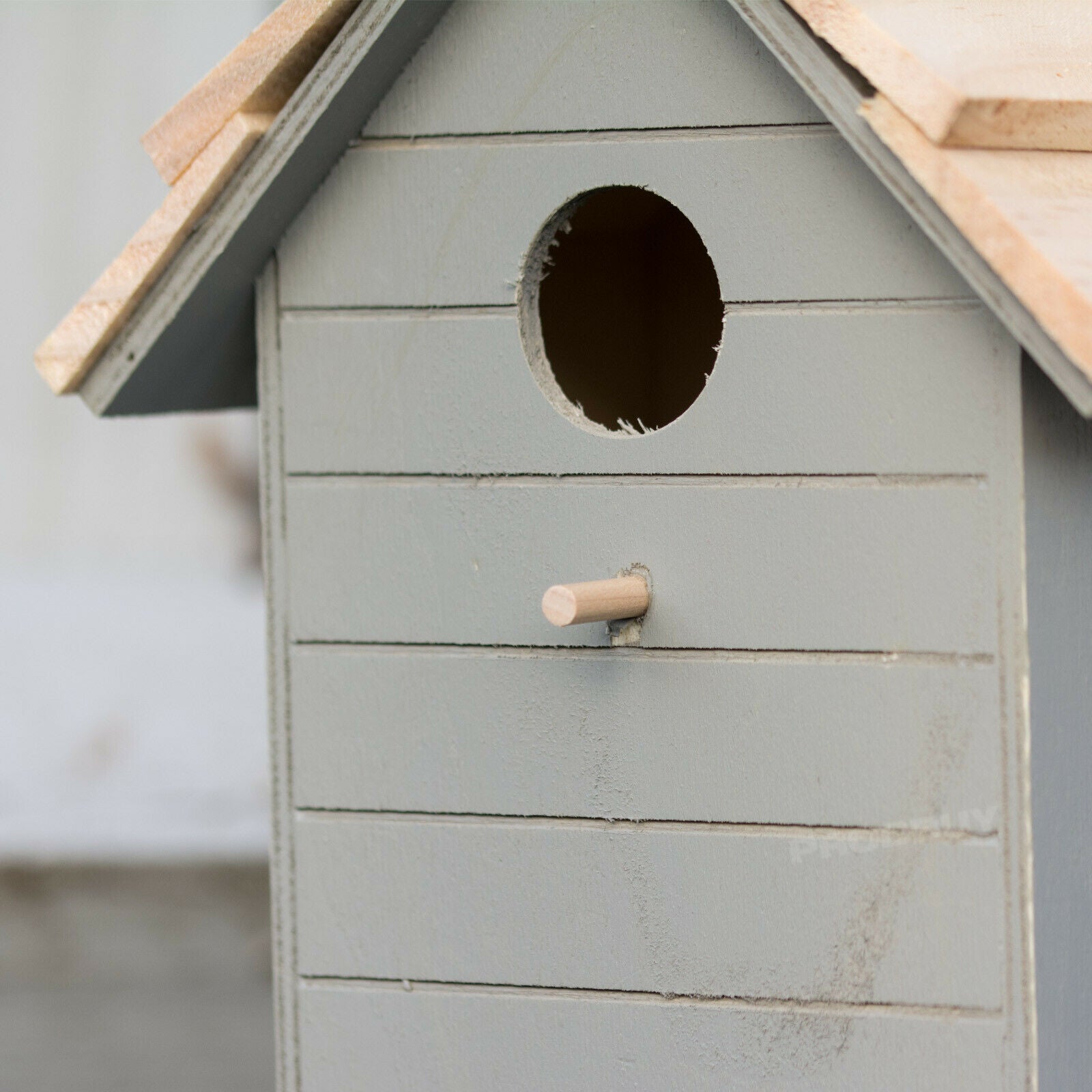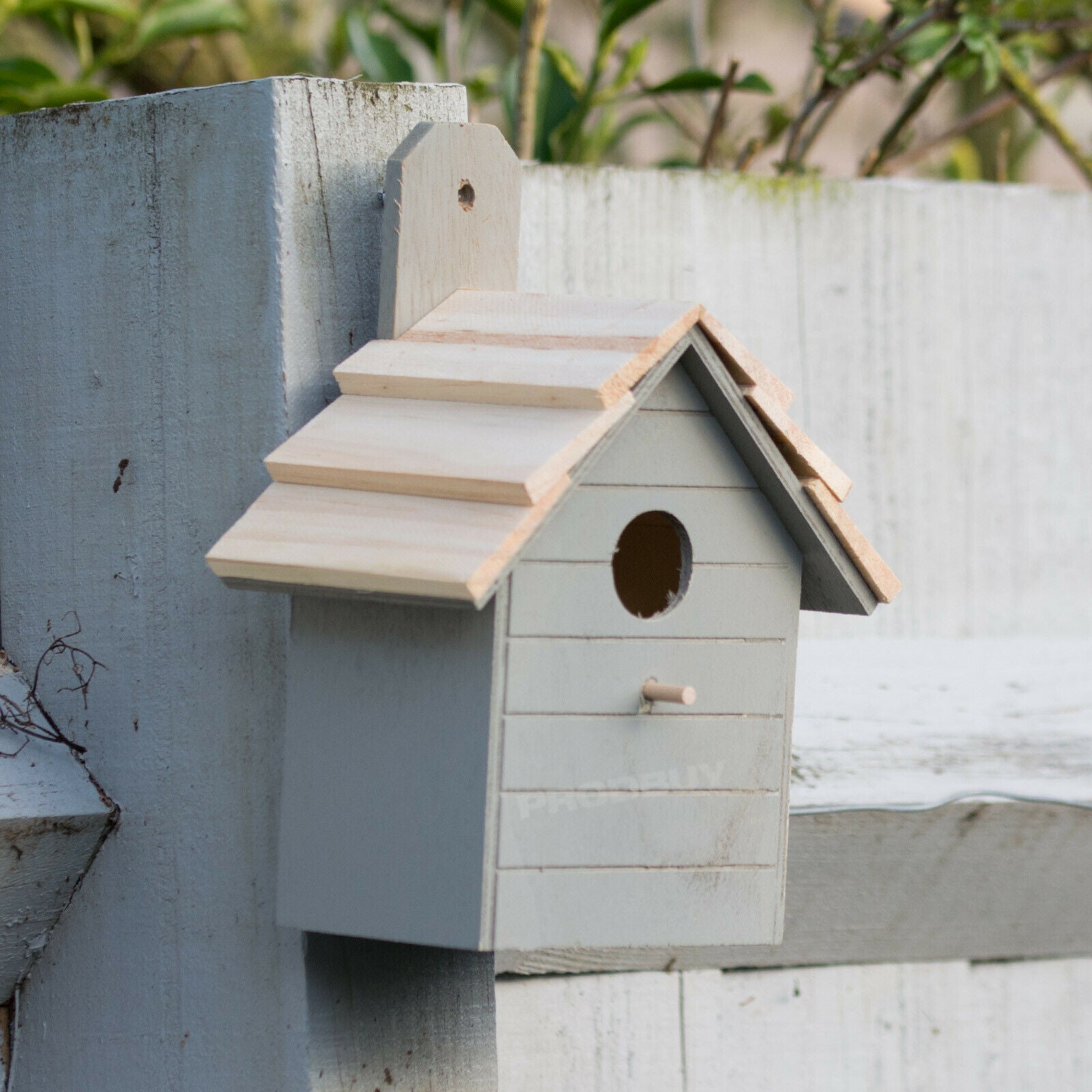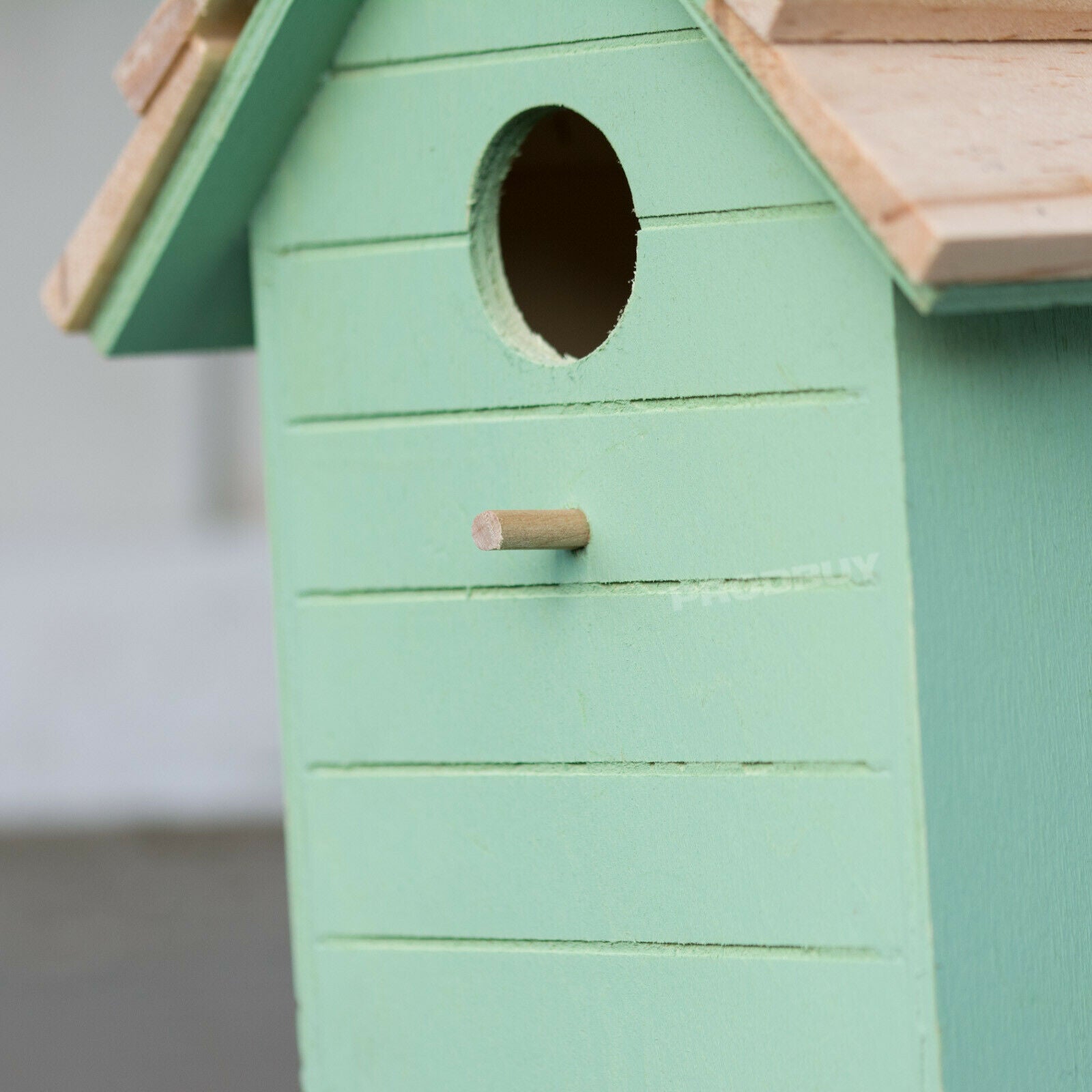 Wooden bird house suitable for attracting birds to your garden it features a small round opening and short perch. Designed to be wall mounted or mounted to a tree if features a pre-drilled hole for easy hanging screws and fixings are not included.
