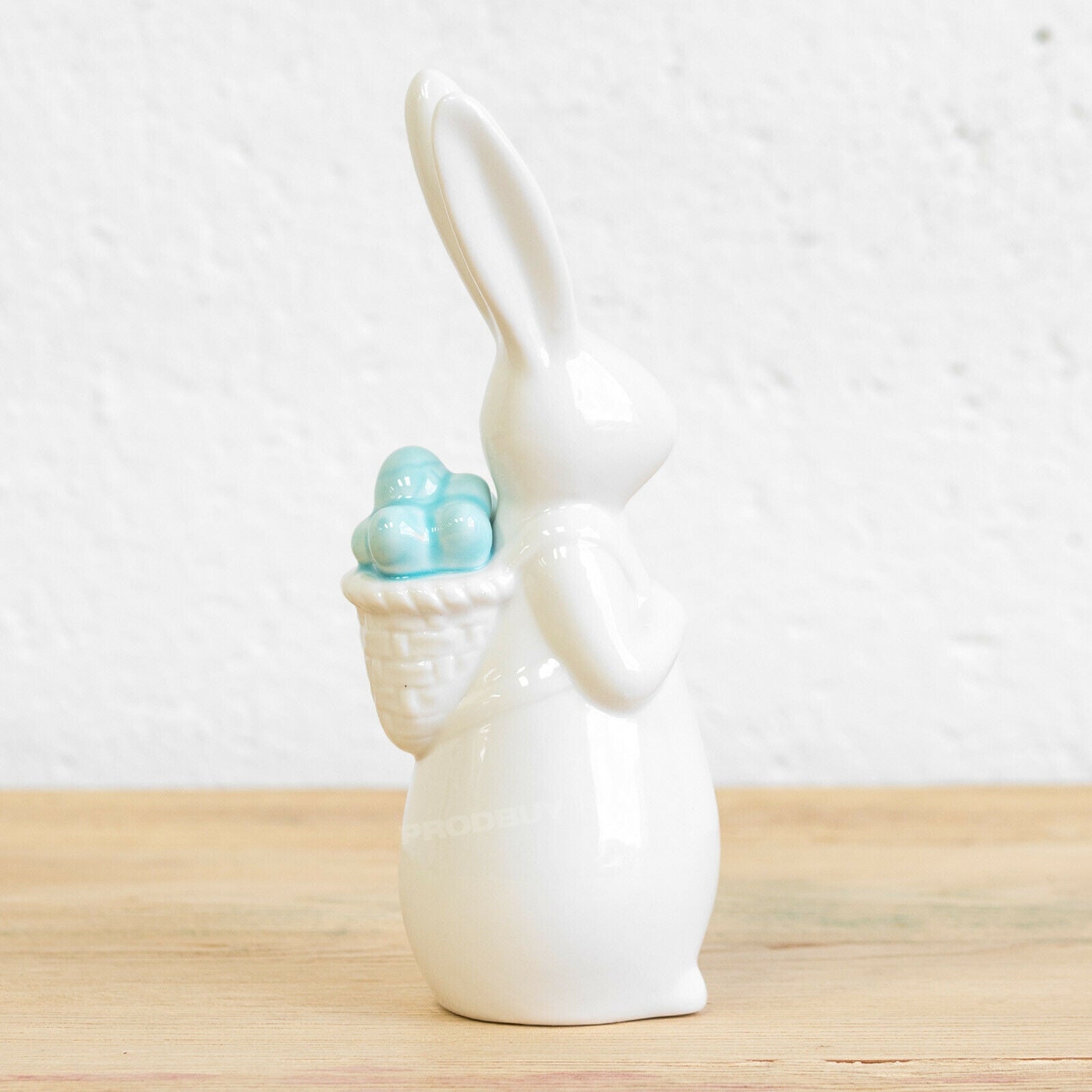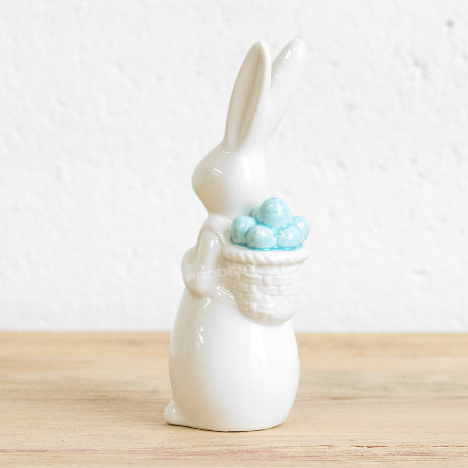Cute white colour porcelain rabbit with blue eggs in basket detail. It is suitable for freestanding on any flat surface around the home and is sure to brighten up any room it is placed in.
